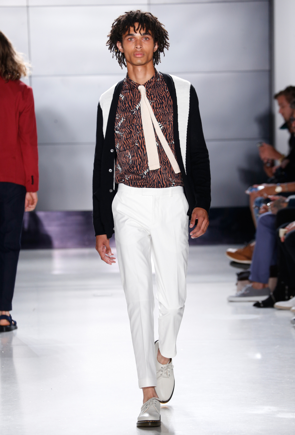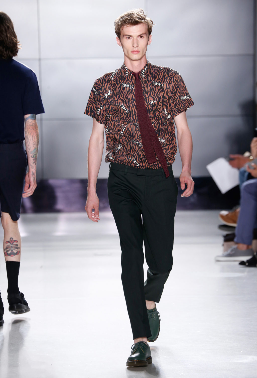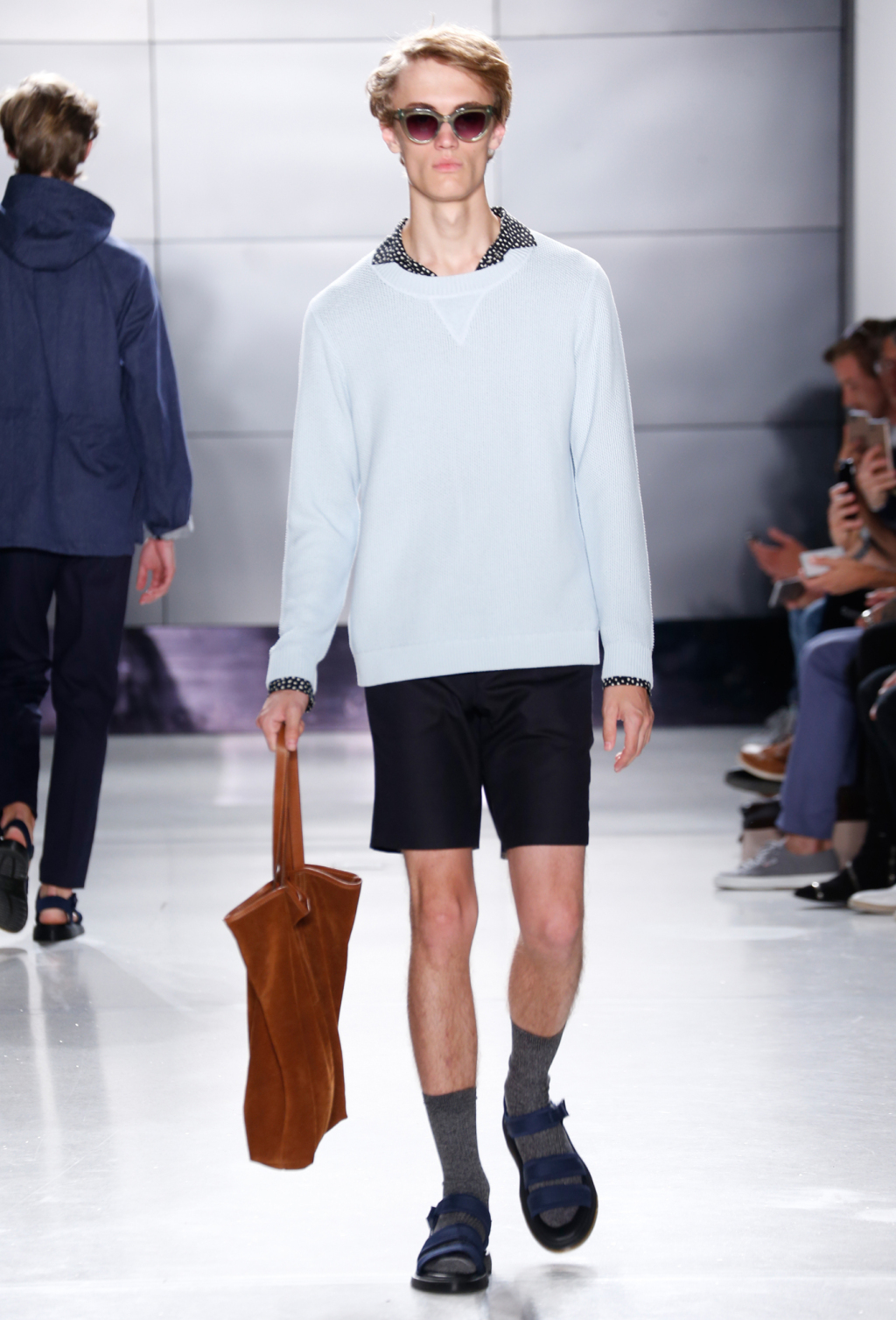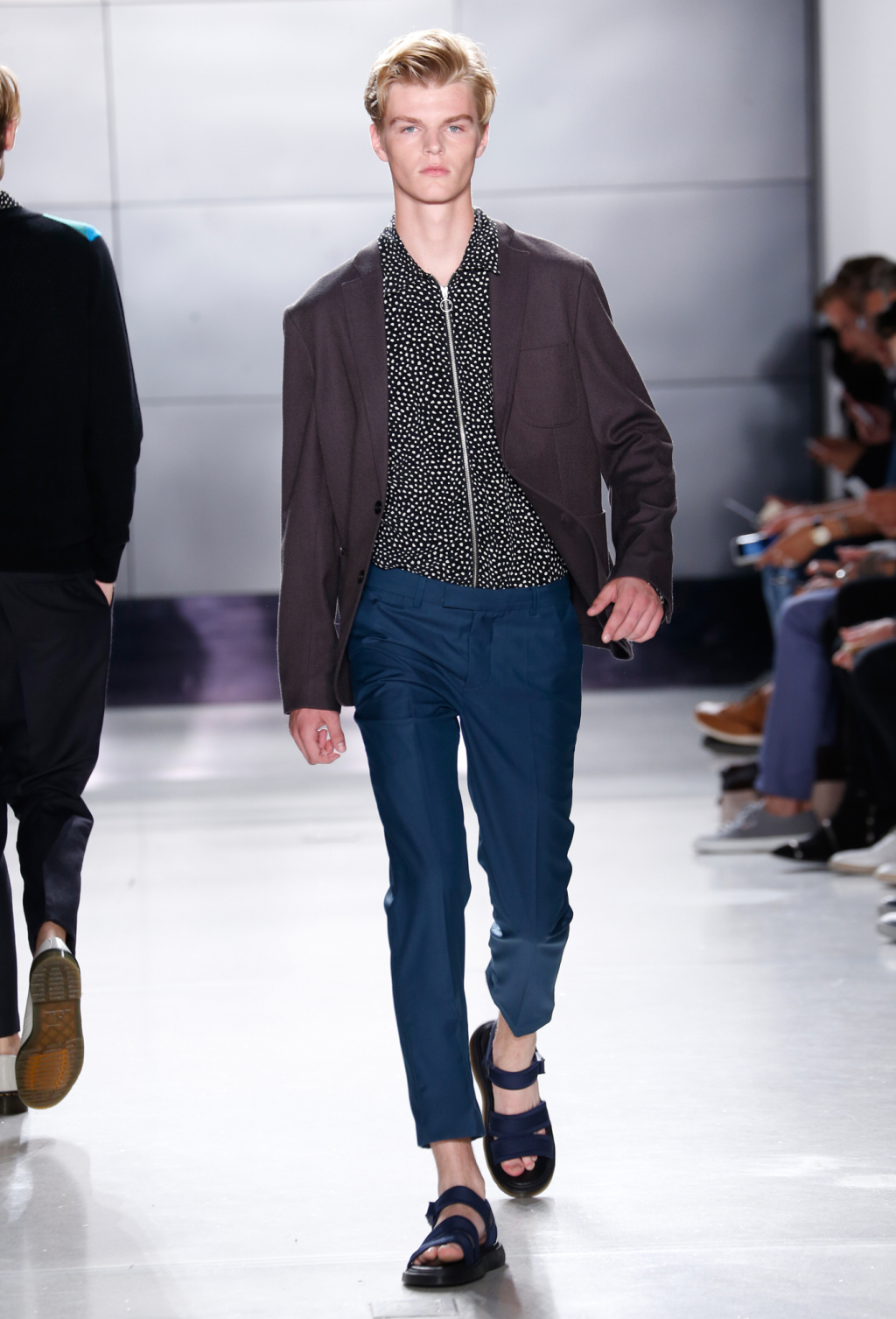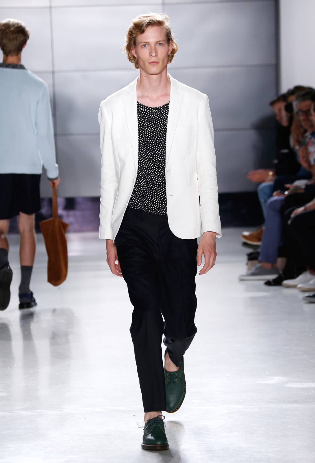 Timo Weiland’s spring collection expounded on what the brand does best: create quirky pieces with a preppy twist — although the overall offering fell a bit flat. This season the team, which includes Timo Weiland, Donna Kang and Alan Eckstein, referenced classic men’s silhouettes from the Fifties and updated them with bold colors and varying textures. Combinations of cherry red, pink, kelly green and cobalt blue appeared on chevron knits, basic sweatshirts and color-blocked sweaters. The silk shirt, which was either shiny or sometimes matte, helped lend what the designers called a “casual luxe” feel to the collection.