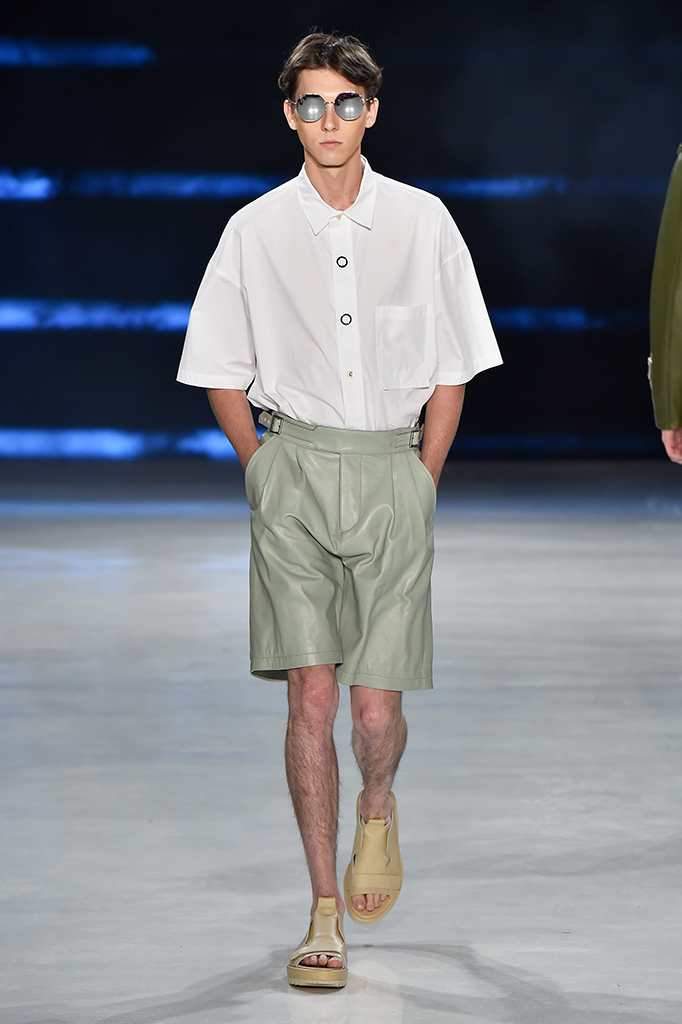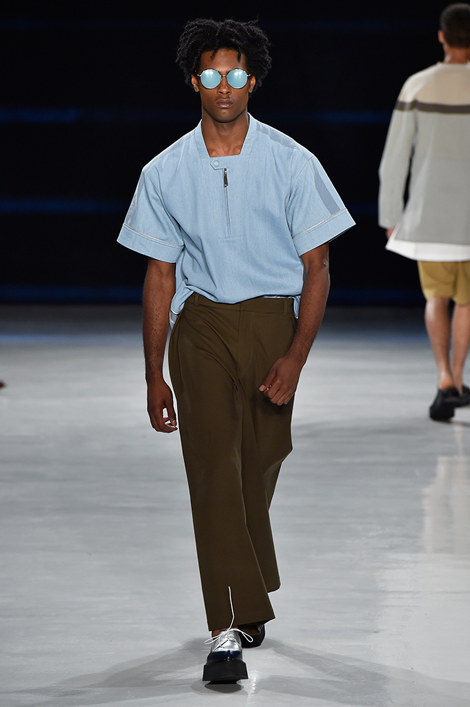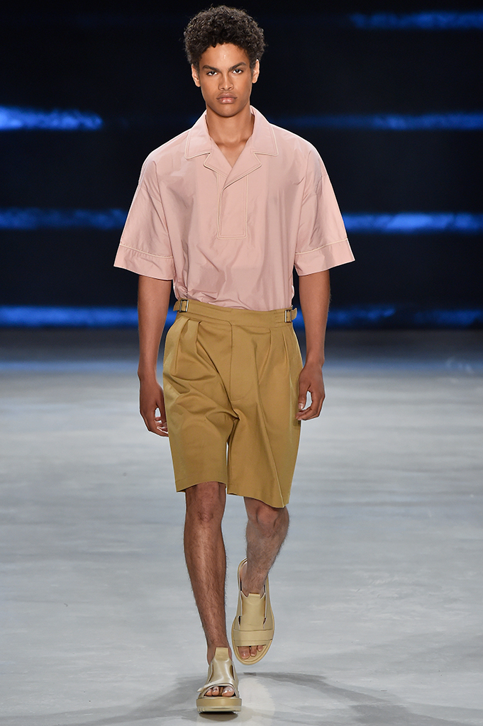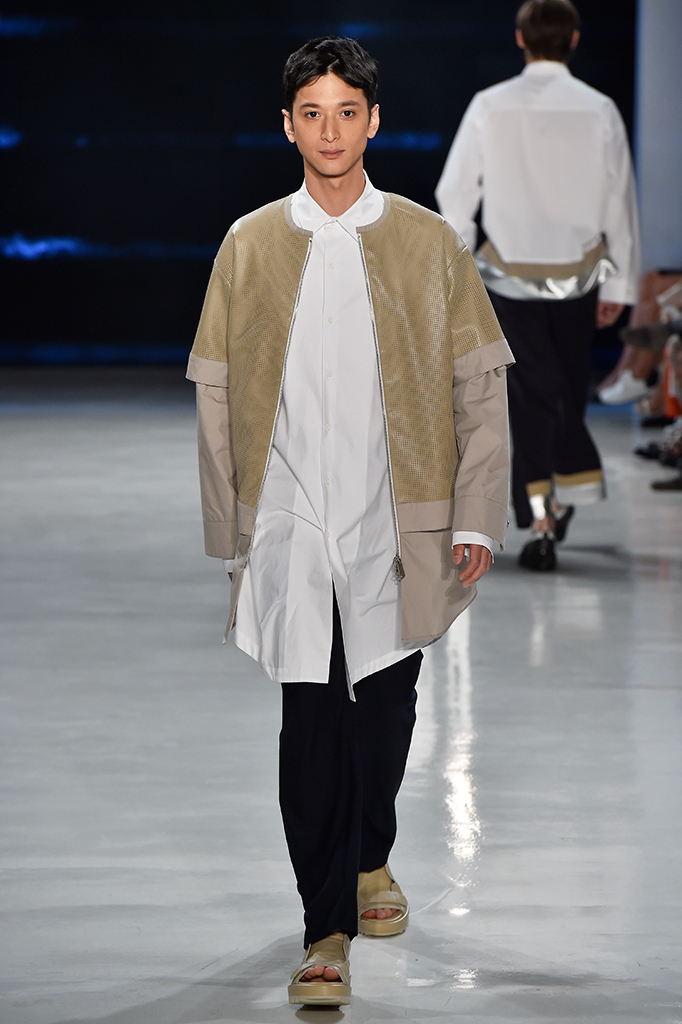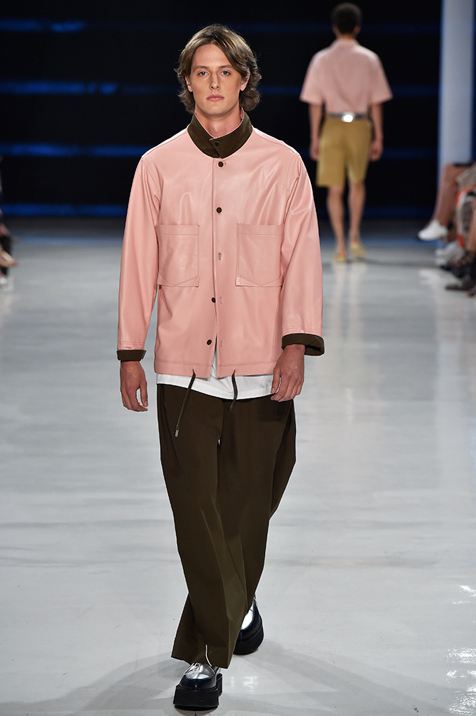 Designer Bumsuk Choi presented a lineup of elongated shirts and oversized outerwear and flight suits. But he moved away from the dark palette that is a hallmark of the brand, switching it up with tempered hues of beige, pink and aqua-green.