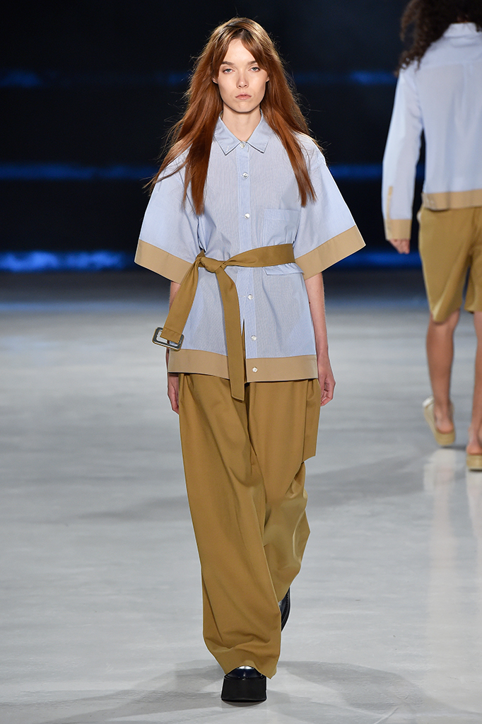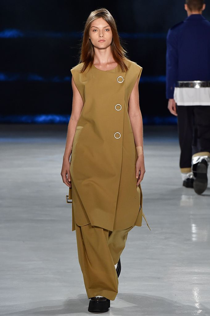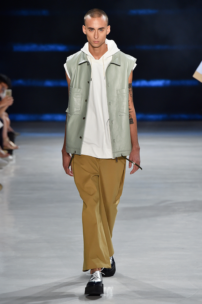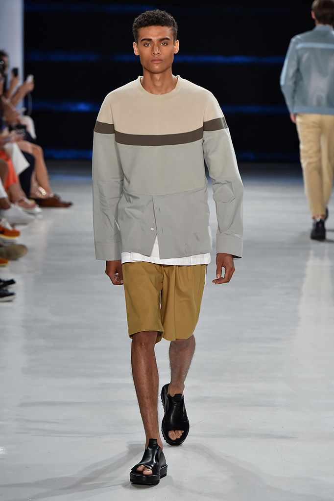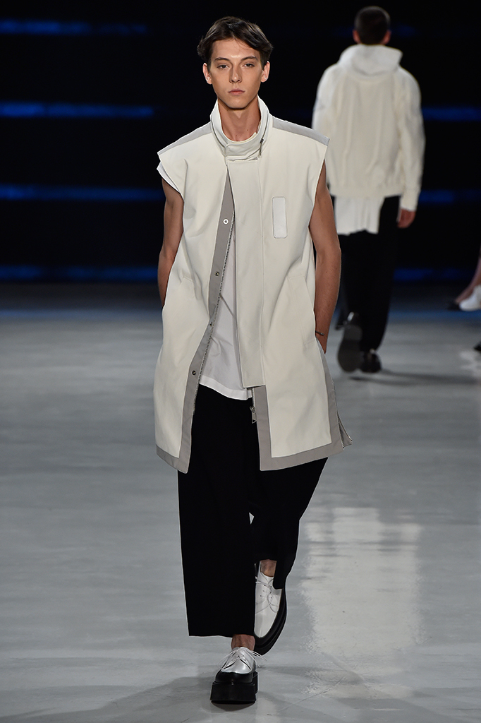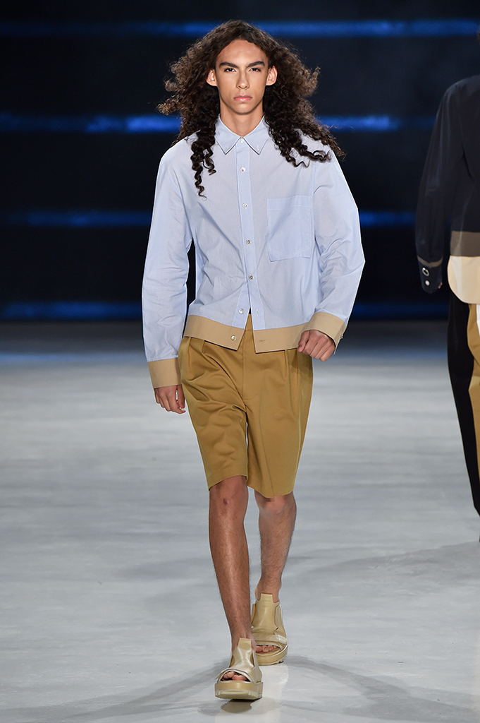 Designer Bumsuk Choi presented a lineup of elongated shirts and oversized outerwear and flight suits. But he moved away from the dark palette that is a hallmark of the brand, switching it up with tempered hues of beige, pink and aqua-green.