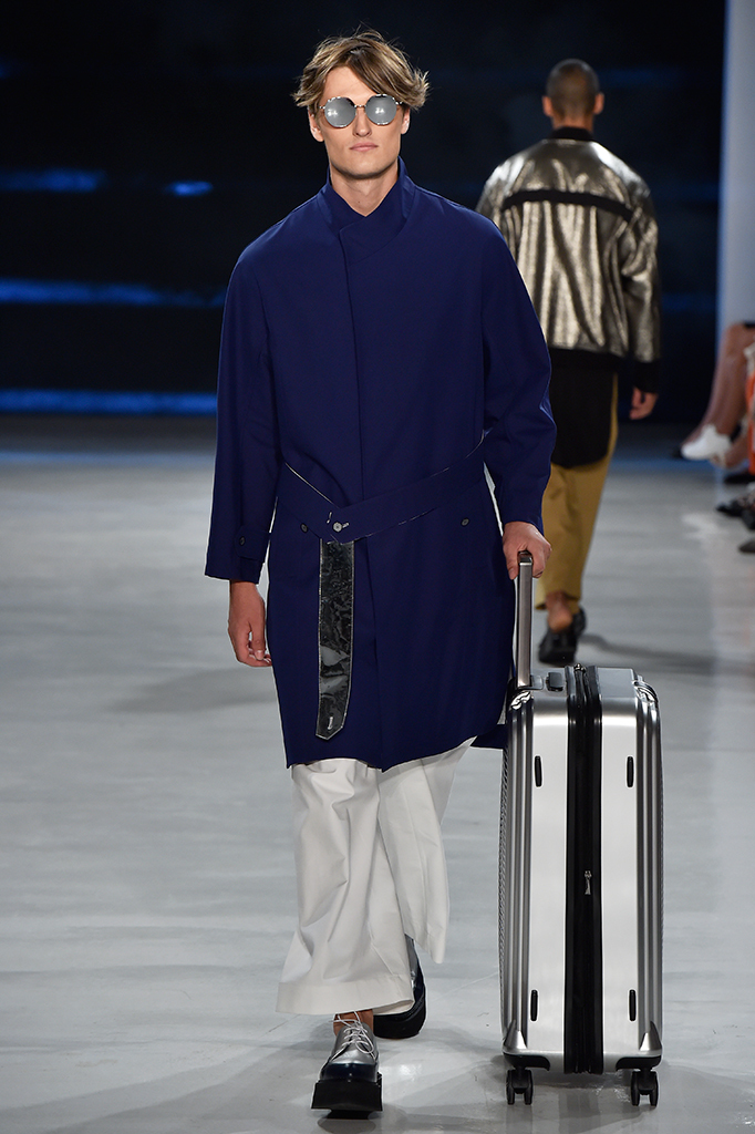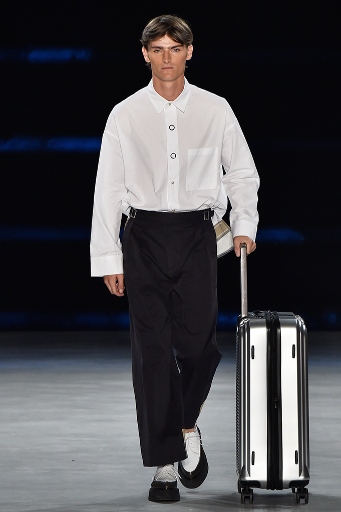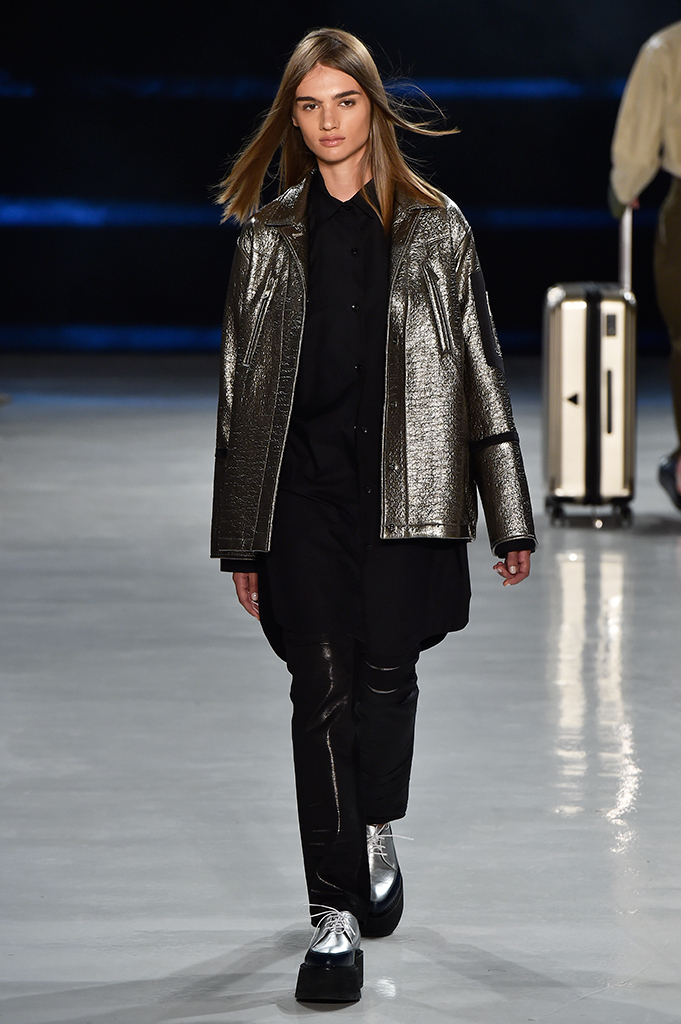 Highlights included a metallic oversized bomber with a long black button-down paired with chino khakis, and a nylon black patch-pocket flight suit.