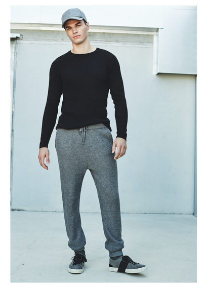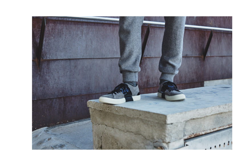 The streetwear collection including technical fabric jackets, neoprene-effect sweatshirts, plush hoodie, contrast sleeve t-shirt, panel suede sneakers, printed cotton t-shirt, sweater, wool-blend cap, asymmetric t-shirt, and others. A very complete minimal collection.