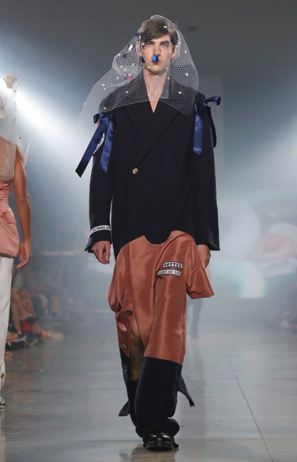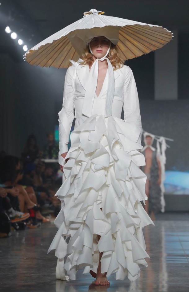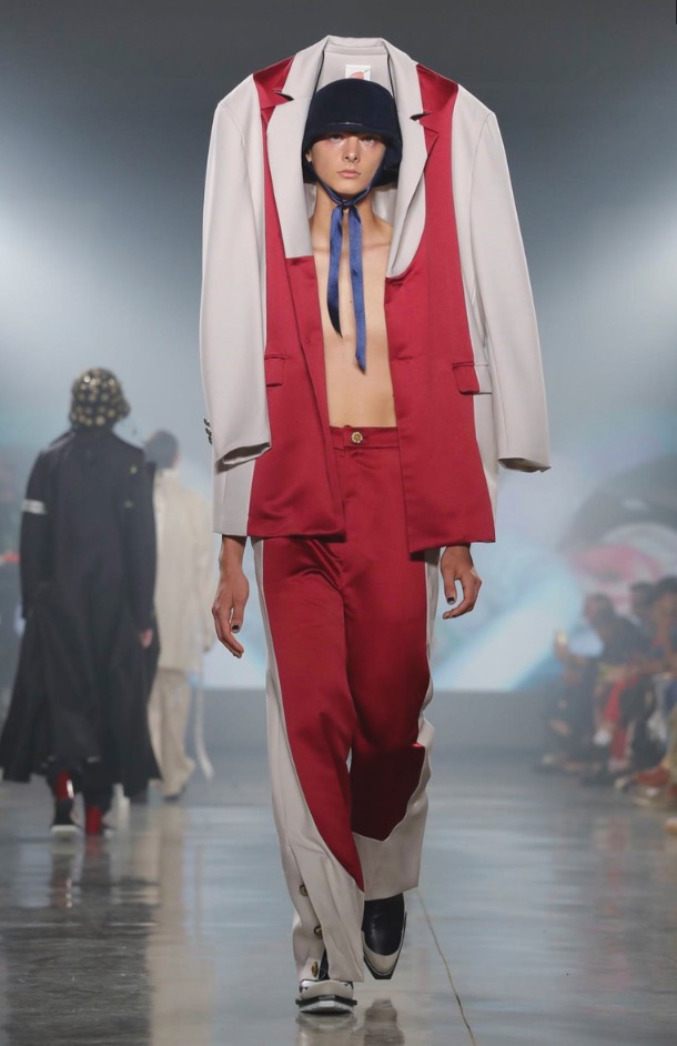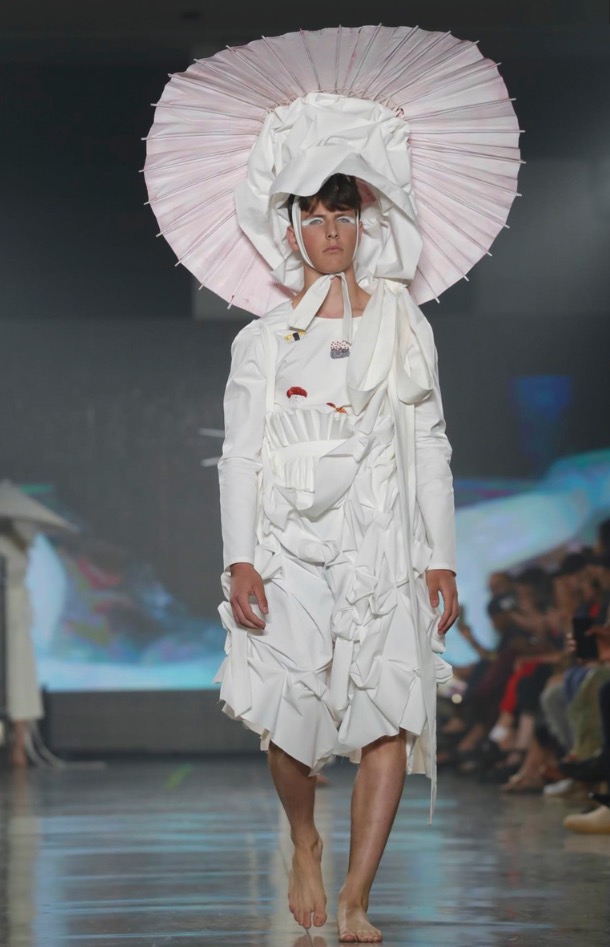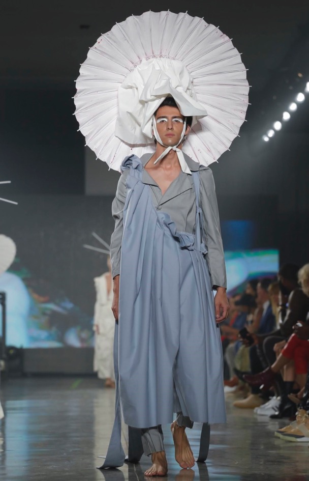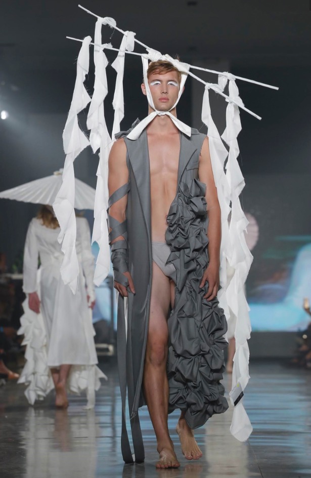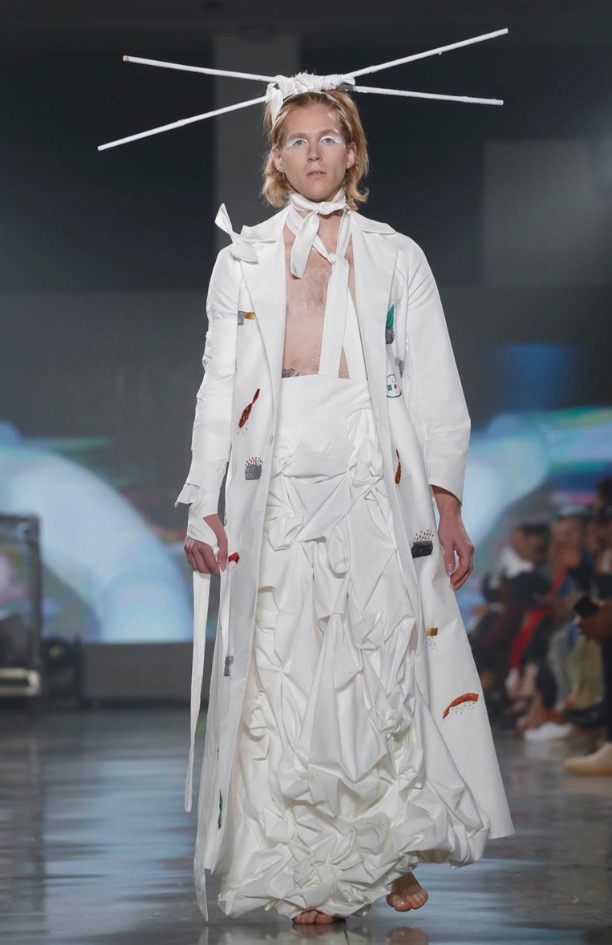 The visual translation of this idea are mainly connected to Japan and its iconography, such as the Ban Gasa, sushi and the Japanese flag. Through the study of the Kosode trousers and traditional kimonos I built a bridge between my Napolitan sartorial heritage and the Nippon culture, a culture clash expressed through overly draped garments, very tight waists, knots and bows. The emphasis on the waist expresses my idea of protection, redefining tightness as a synonym of strength.