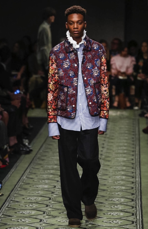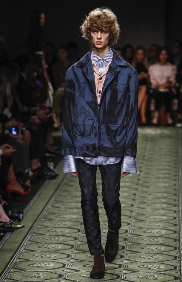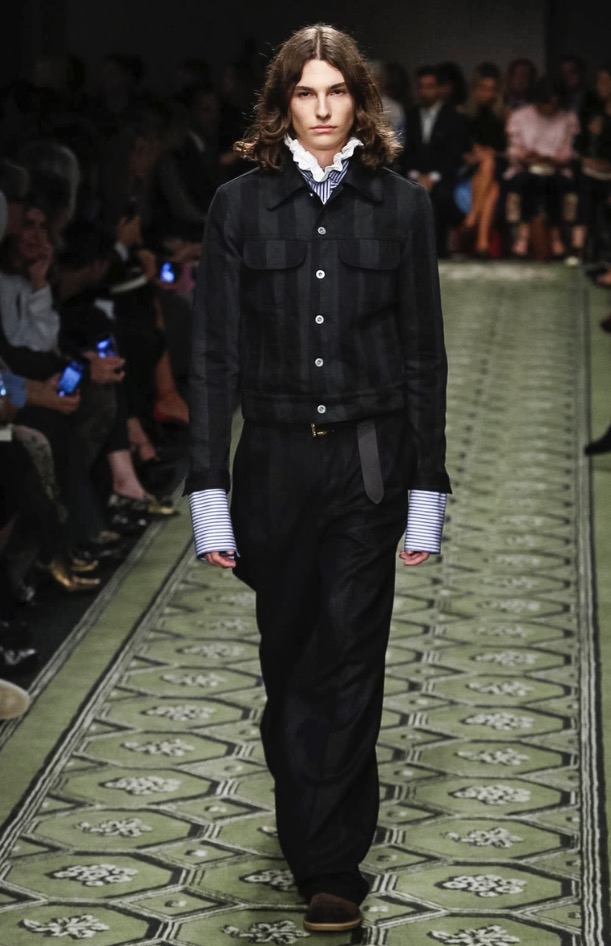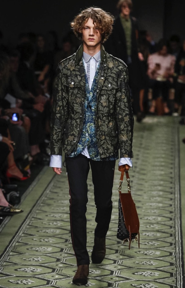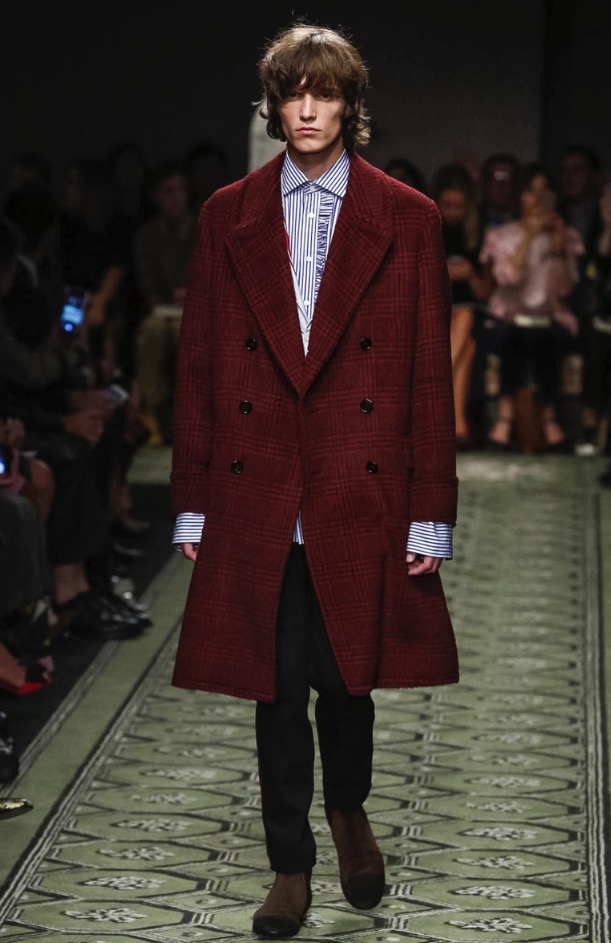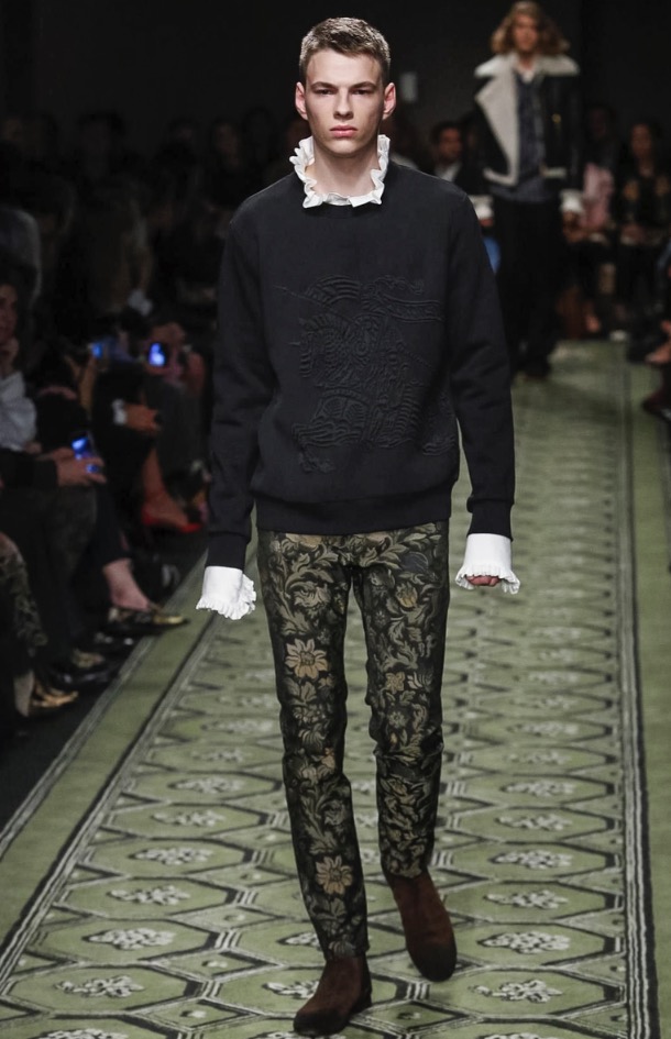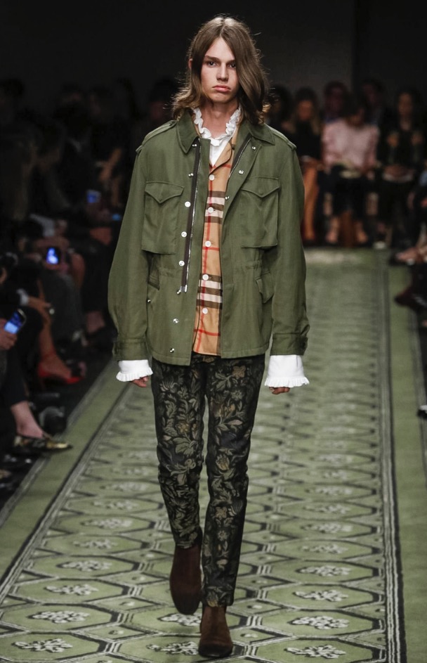 Burberry CEO and chief creative officer Christopher Bailey always has his ear to the ground for new music, and he invited British up-and-comer Jake Bugg to perform at the brand’s show in London today. In keeping with the tone of the men’s presentation in January, there was a distinctly David Bowie vibe to the clothes, and models, male and female, had their faces sprinkled with Ziggy Stardust–style glitter. Bailey described the new collection as a patchwork of his favorite things, and the compilation of ’70s glam-rock motifs, military tailoring, and mixed-media bohemia had a soulful English eclecticism about it. Edie Campbell, a model whose whole being seems to vibrate London-girl cool, opened the show with a look that spoke to that mix—a thigh-skimming jacquard dress, patterned tights, and a regimental navy wool coat with tons of attitude that grazed the edge of rubber-soled patchwork python boots.
