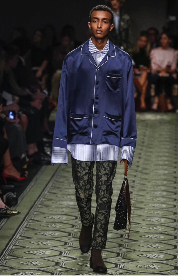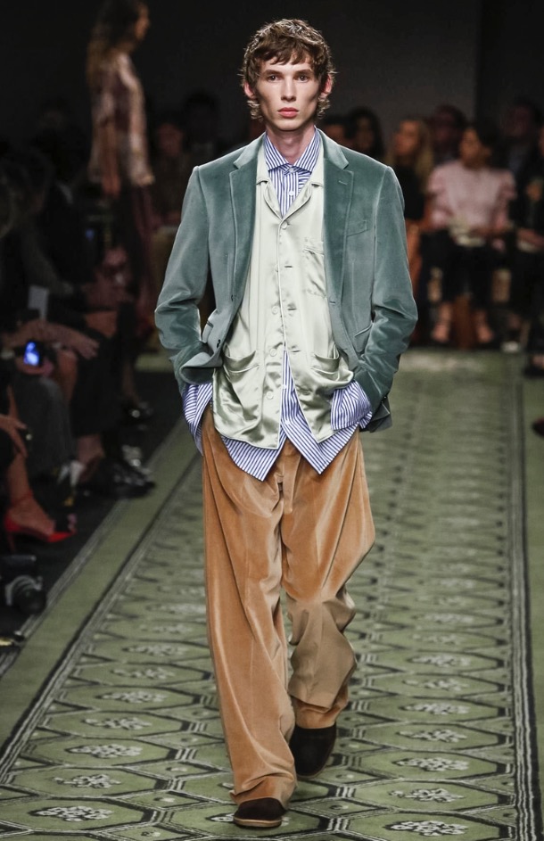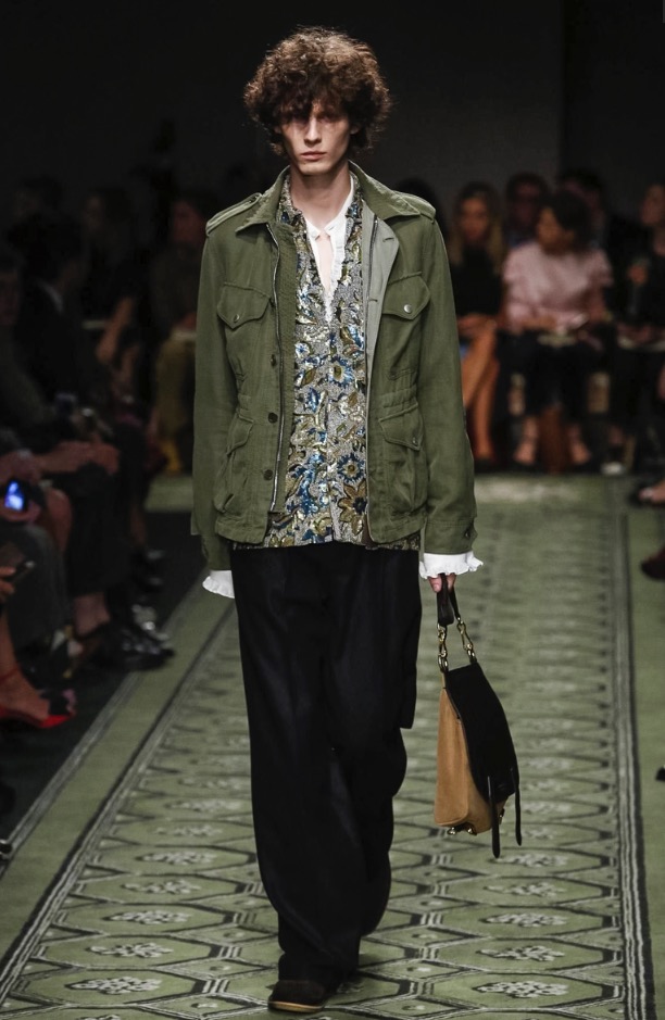 A groovy tomboy feeling came through most strongly in the outerwear, and each overcoat had its own quirky twist, like an oversize shearling coat replete with multicolored python piping and a khaki green field jacket with jumbo golden hardware reminiscent of the Queen’s Guard. Those slightly mannish proportions worked nicely with the sweeter, romantic ideas in the collection, such as the sequined minis covered with swirly ’70s wallpaper patterns and the print-on-print maxi dresses. With its dinky ladylike shape, wide utilitarian strap, and shiny, extra-large buckle, the label’s new patchwork handbag seemed to speak to the best of both worlds and had a kooky maximalism that felt right for now.