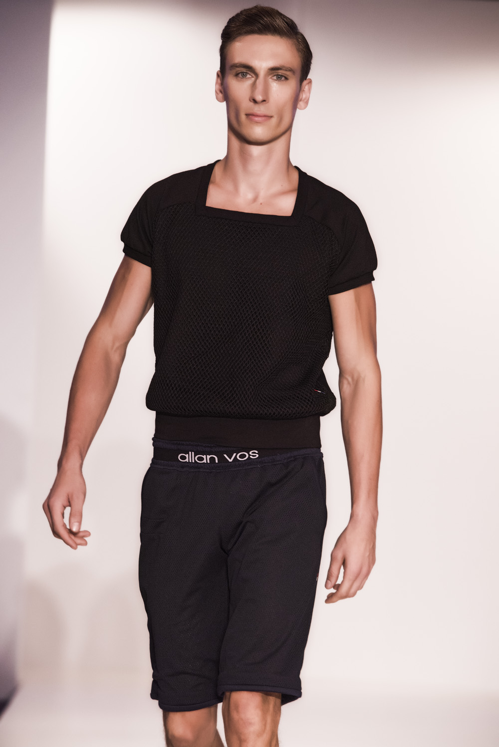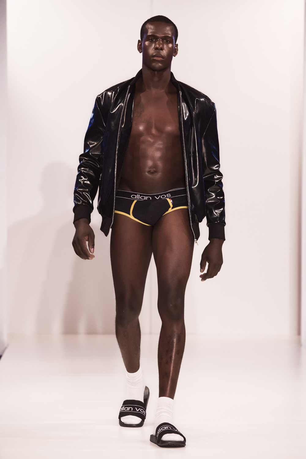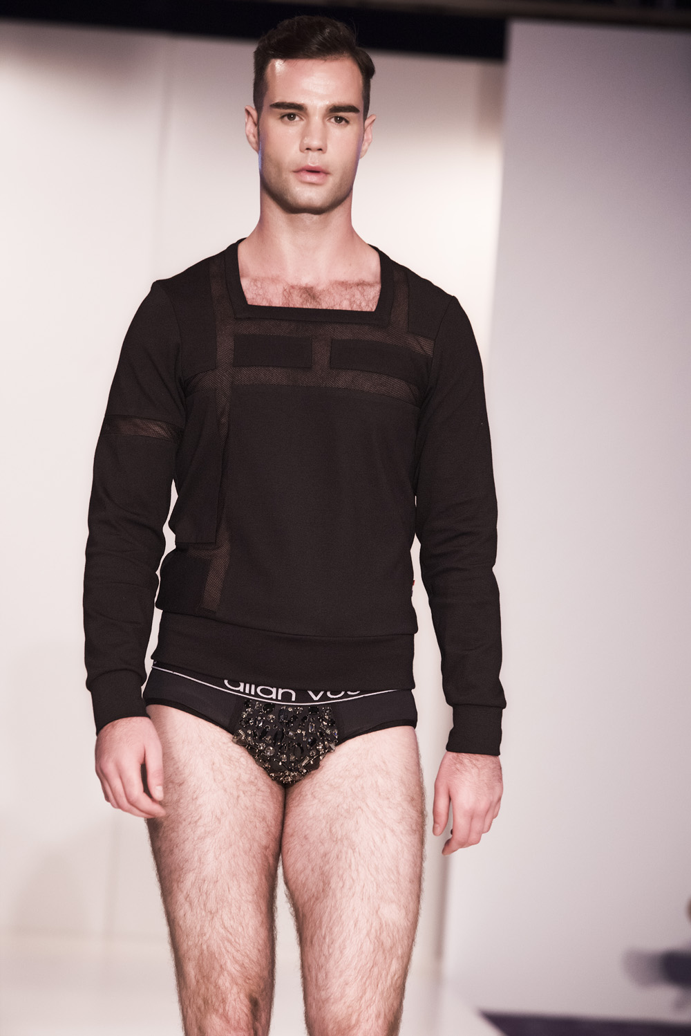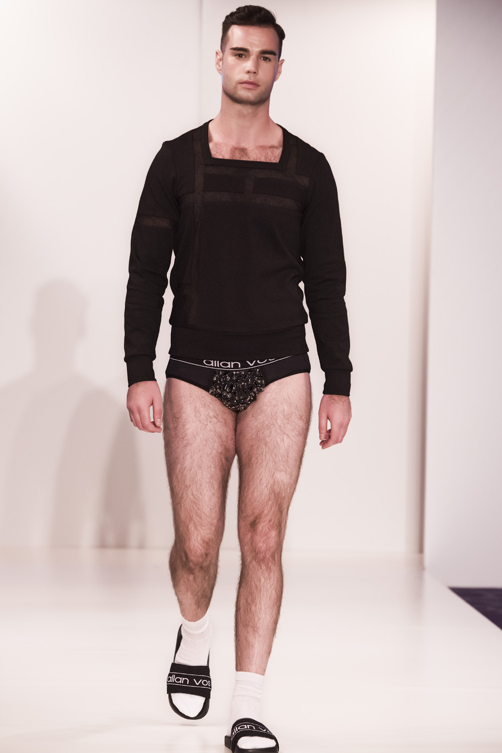 Starting with black sportswear, subtile clothing line, with clean tops, cut briefs, including broidered bulge, hallmark of the brand.