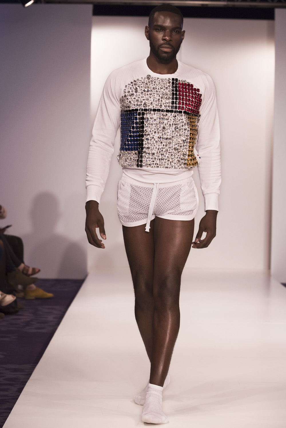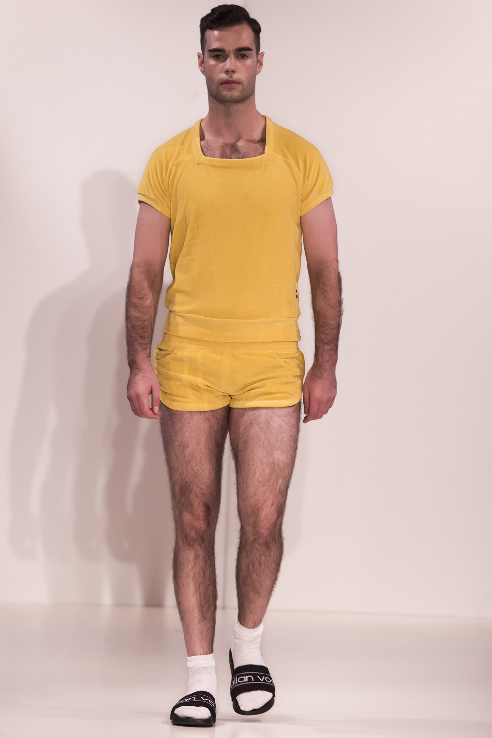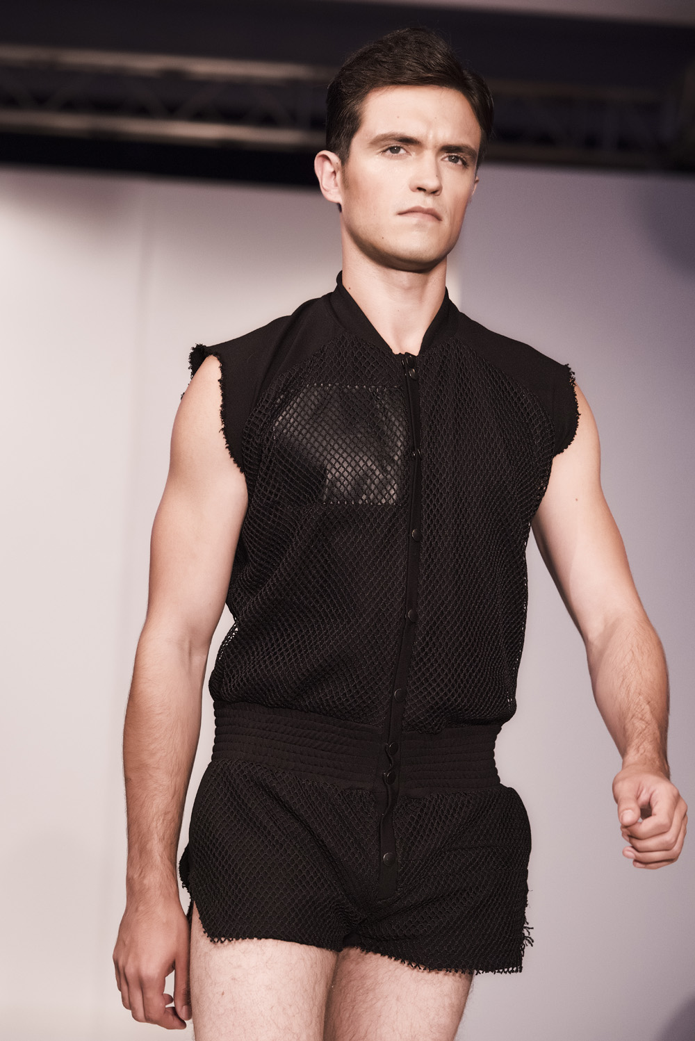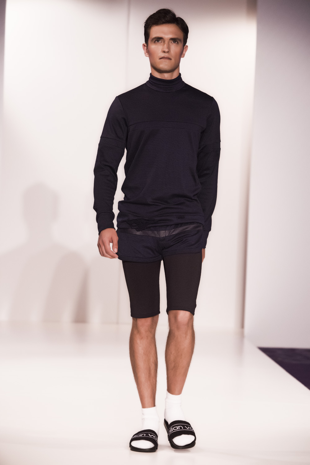 Starting with black sportswear, subtile clothing line, with clean tops, cut briefs, including broidered bulge, hallmark of the brand.
