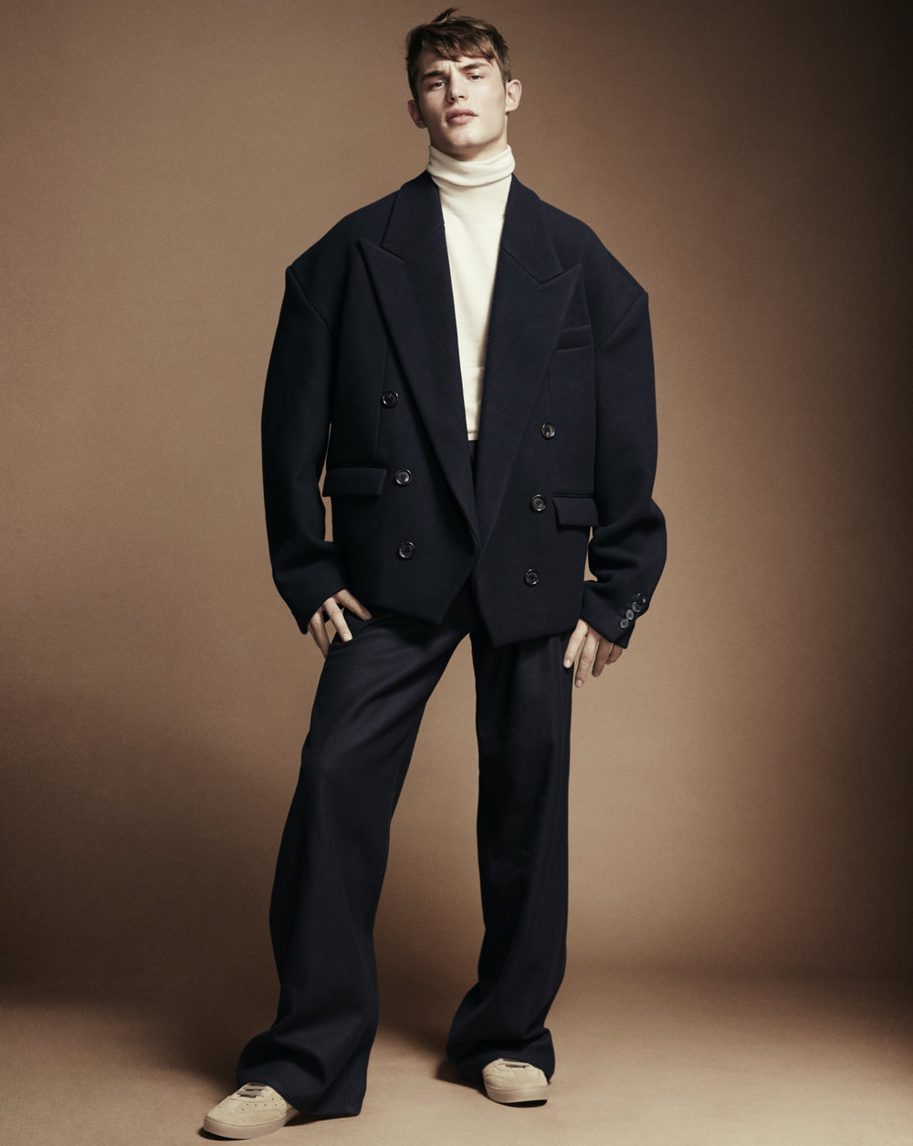Dries Van Noten wool turtleneck and trousers; Juun.J wool coat.