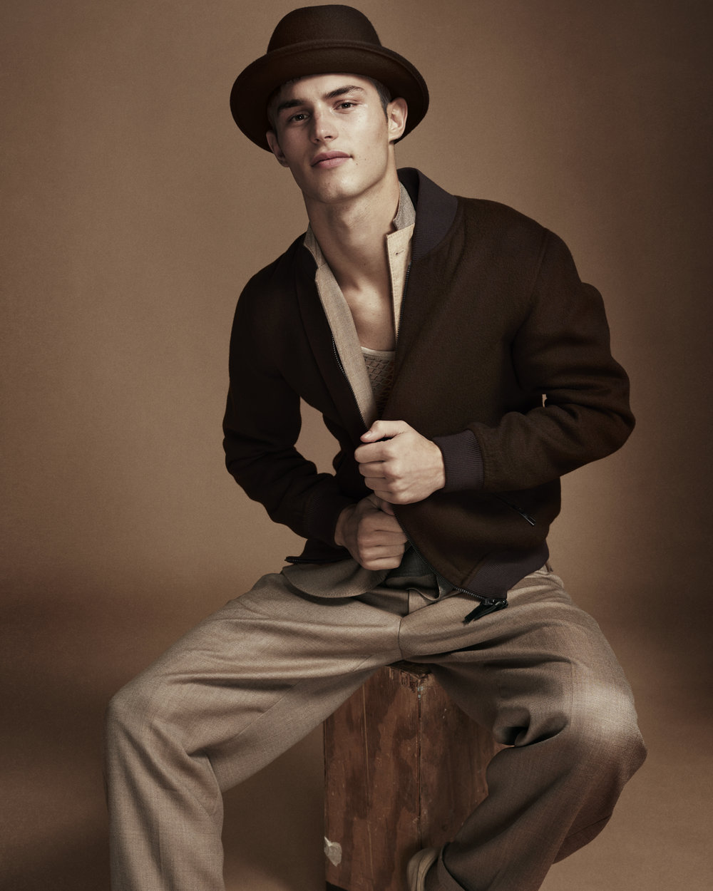 Kit Butler wears Giorgio Armani vest, and wool bomber jacket, two-piece suit and hat.