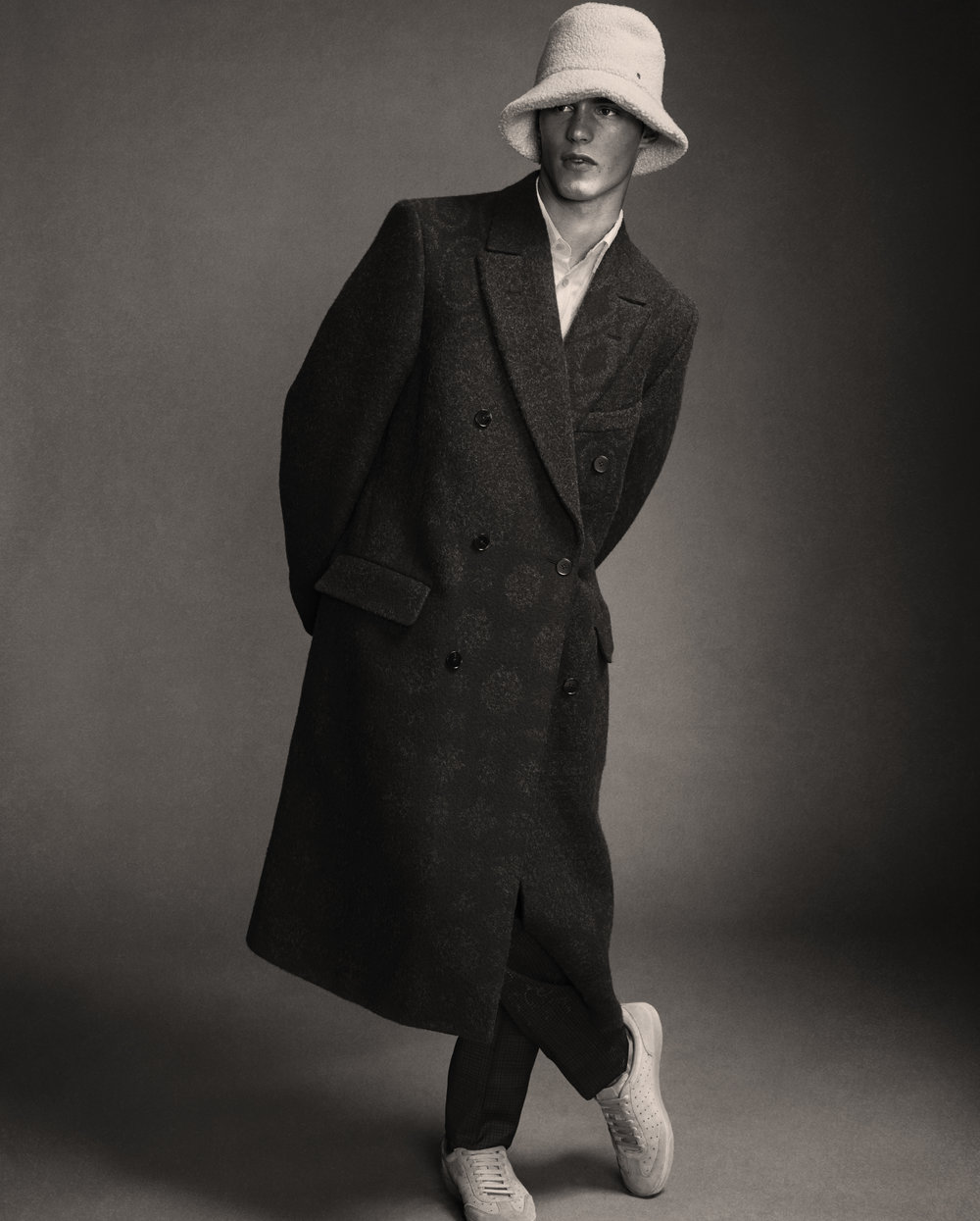 Paul Smith shirt and wool jacket, trousers and coat; Maison Michel wool hat.