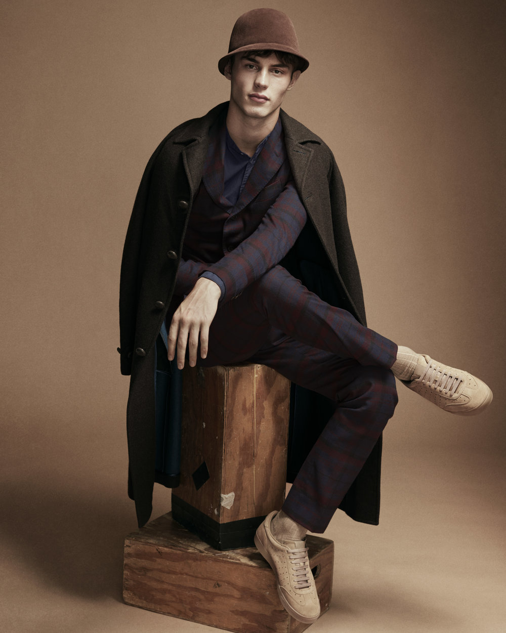 Boglioli shirt, wool two-piece suit and coat; Pierre Cardin wool hat.