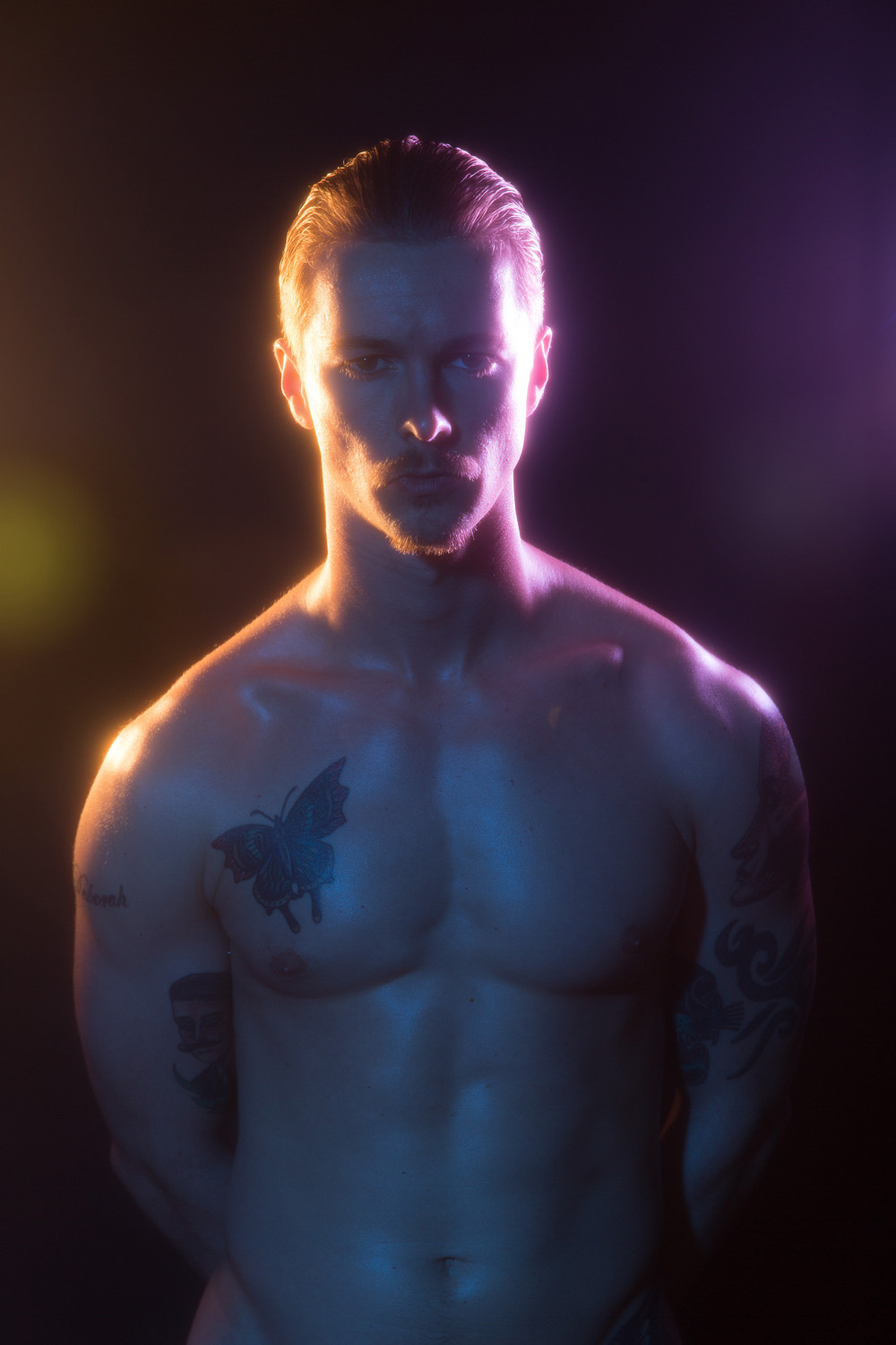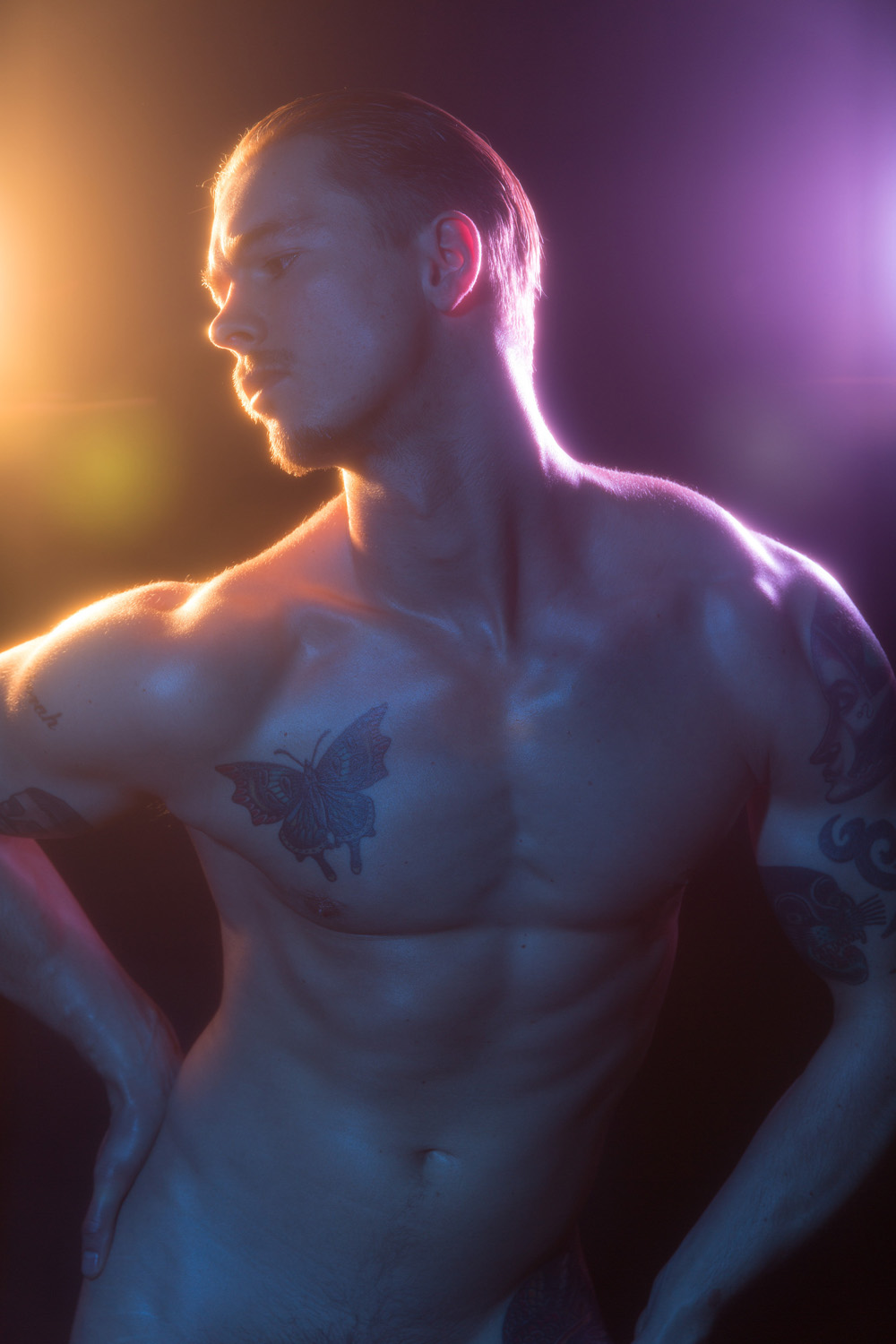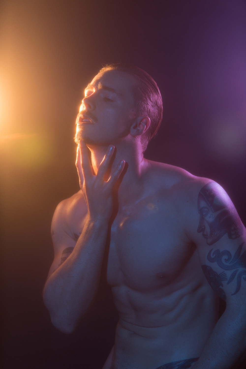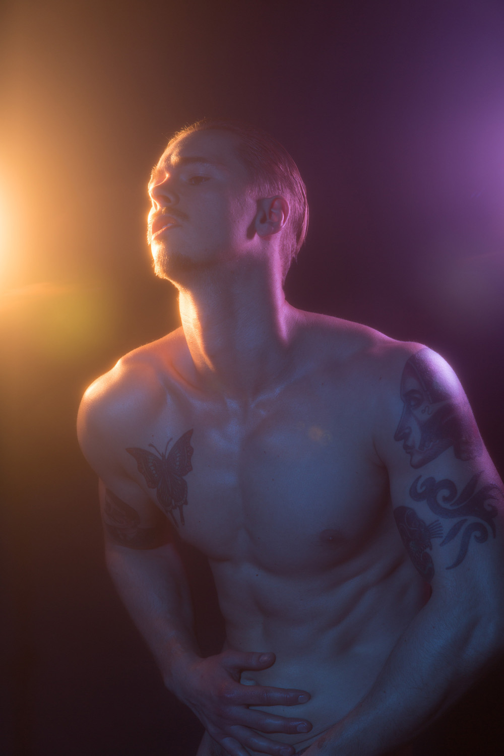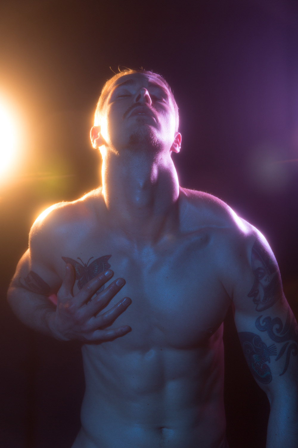 His body highlighting by the spots located perfectly around this male body, so we can focus on his facial expressions, admire the shades and how the spots can even create atmosphere and drama into any frame.