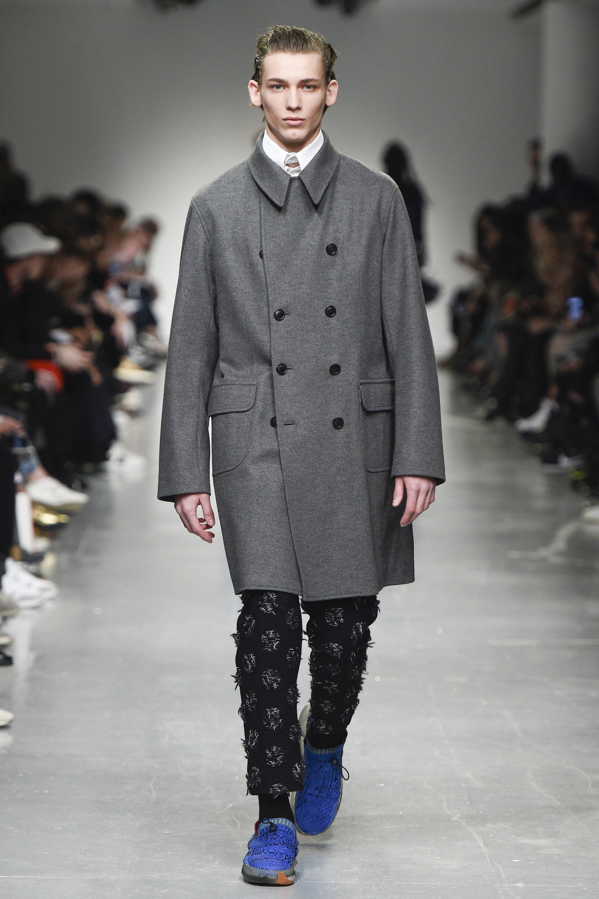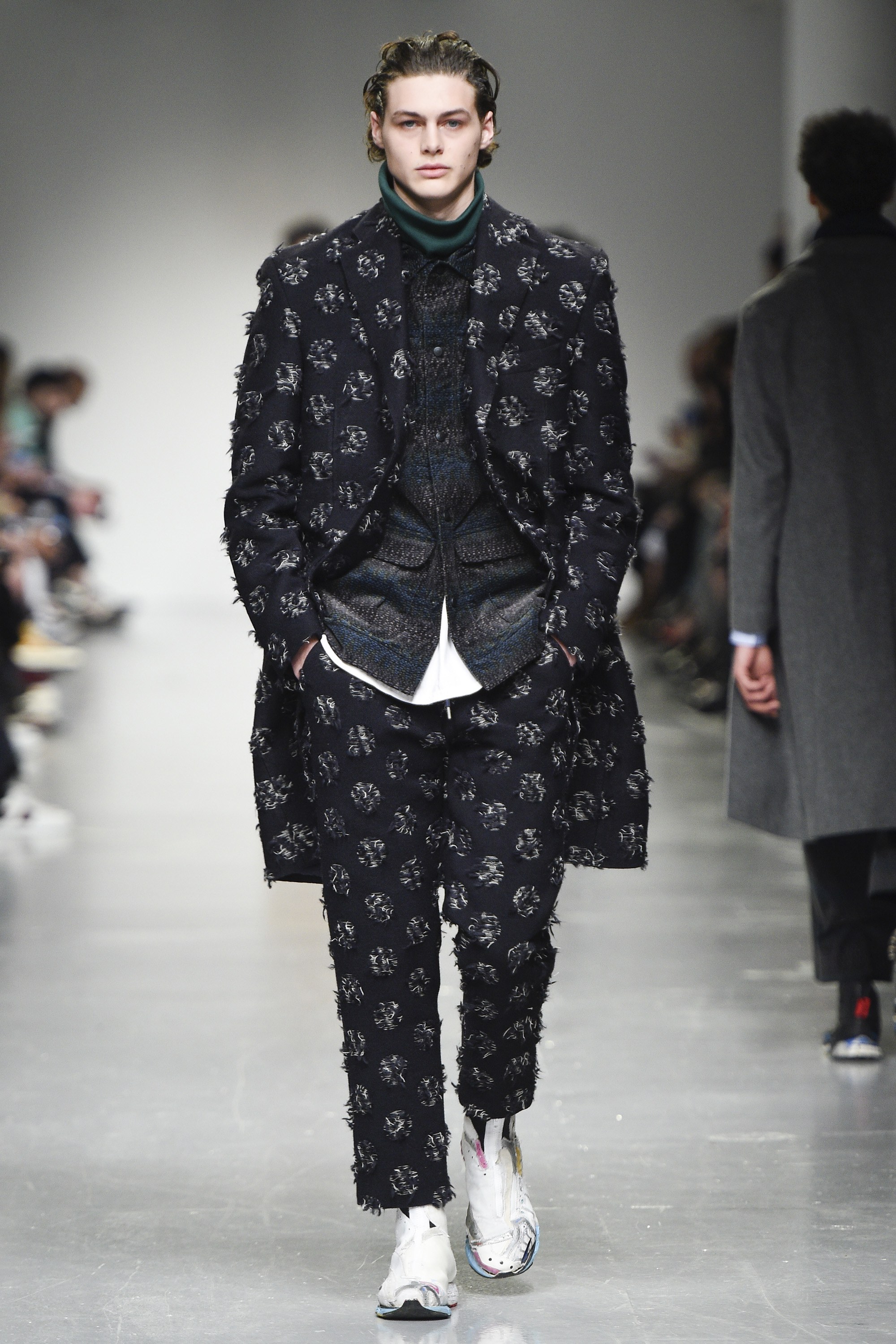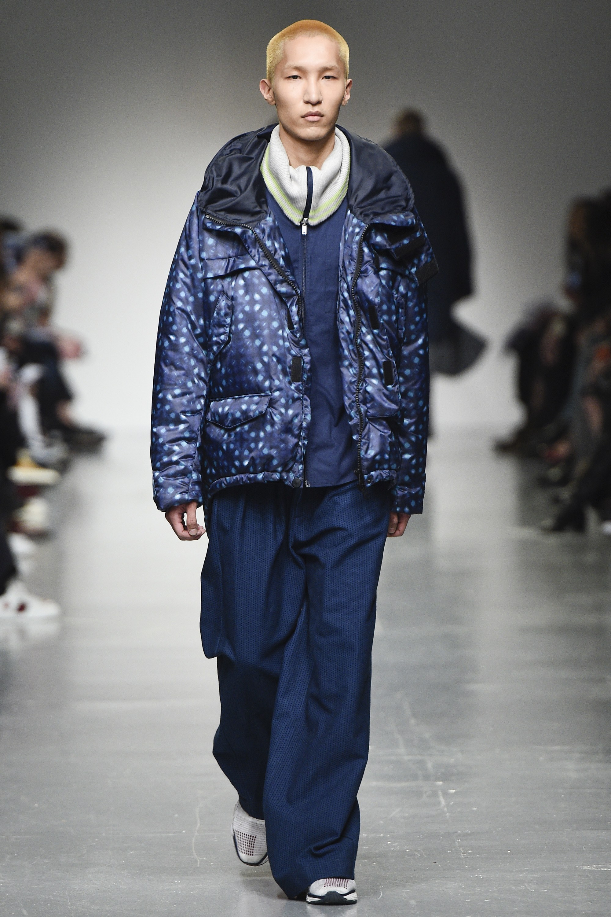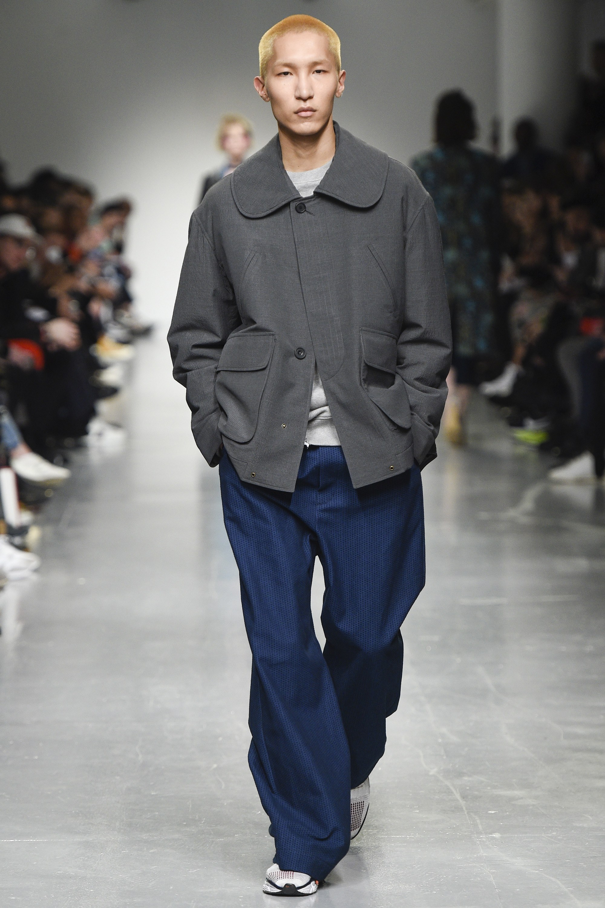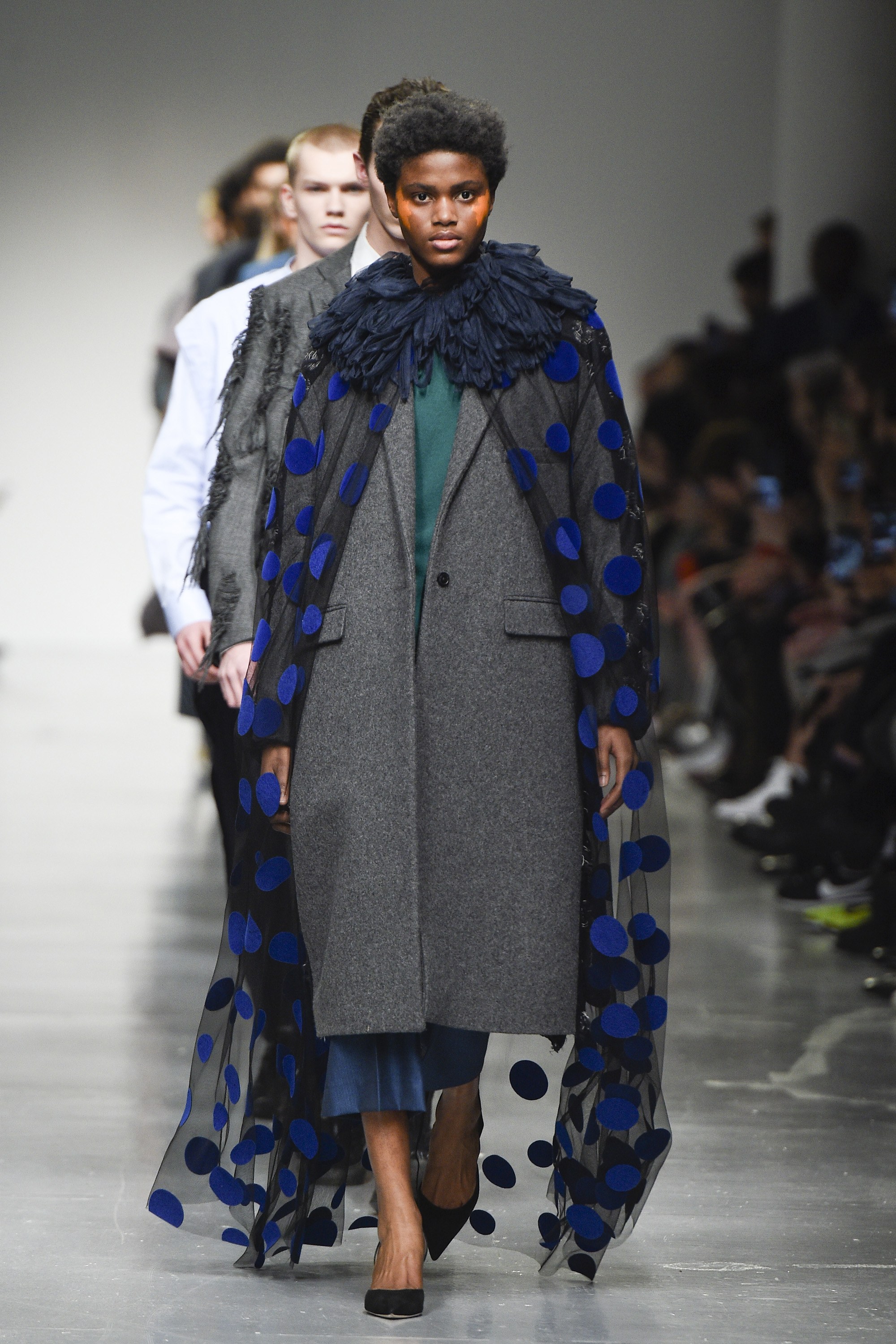 react-text: 108 But, back to the boys. The highest marks go to the opening look, which featured a tweedy, tonal parka of blue and near-black in an abstract circular print. It had a large, scooped fishtail too, and what we’ll call a statement collar. The piece will be a nice option for the gent who likes his coats versatile, yet moderately this side of quirky. Outerwear won overall—an anthracite-hued jacket with a big, almost ’70s-esque curved collar was also strong.