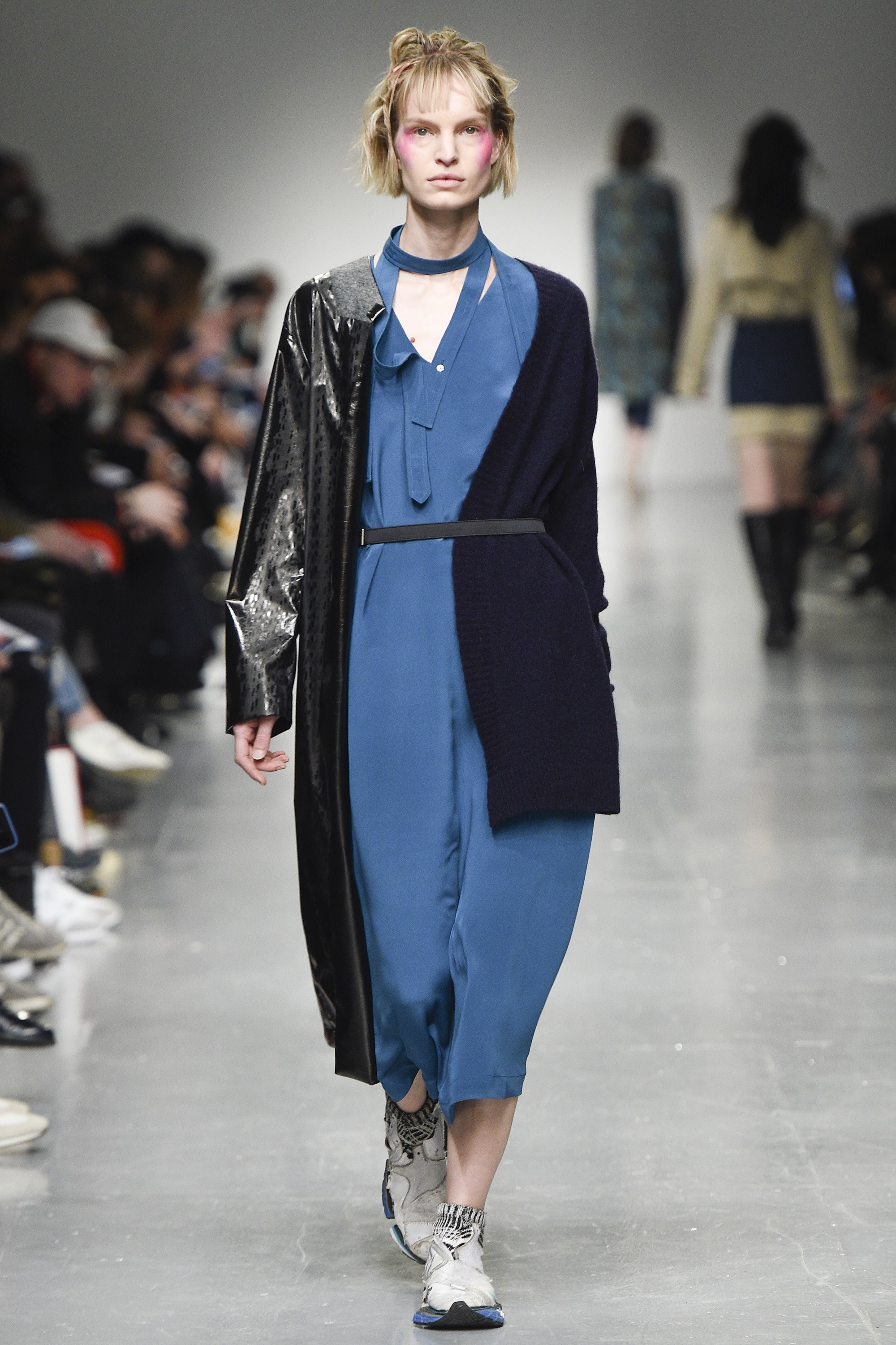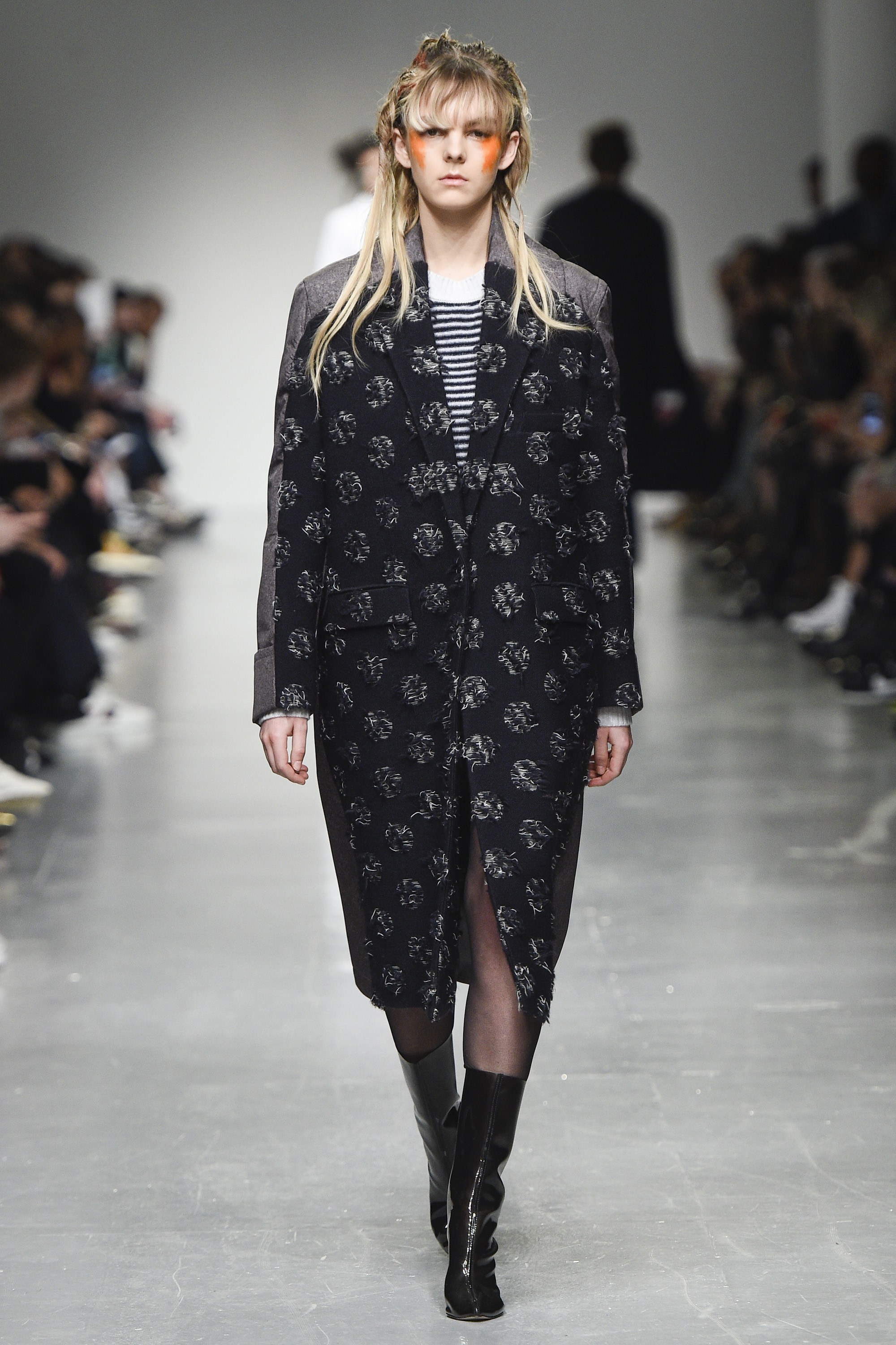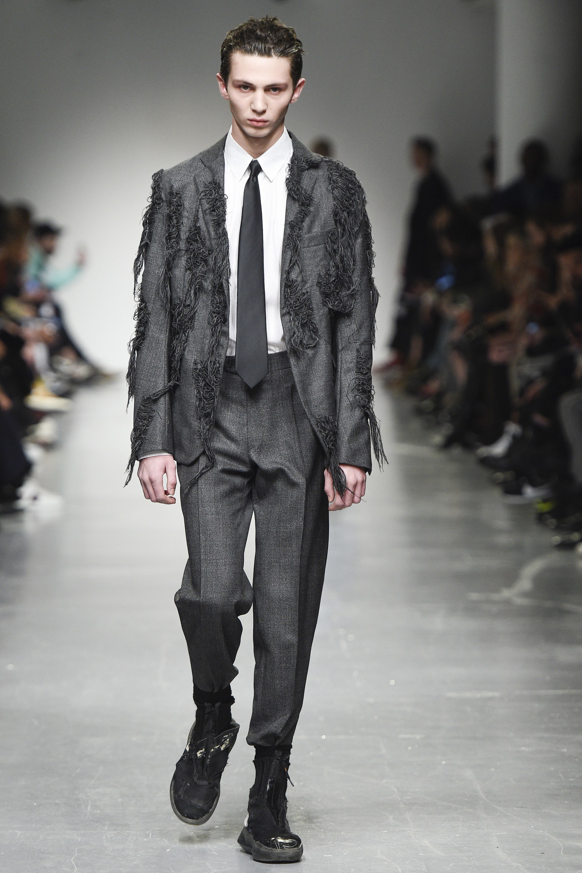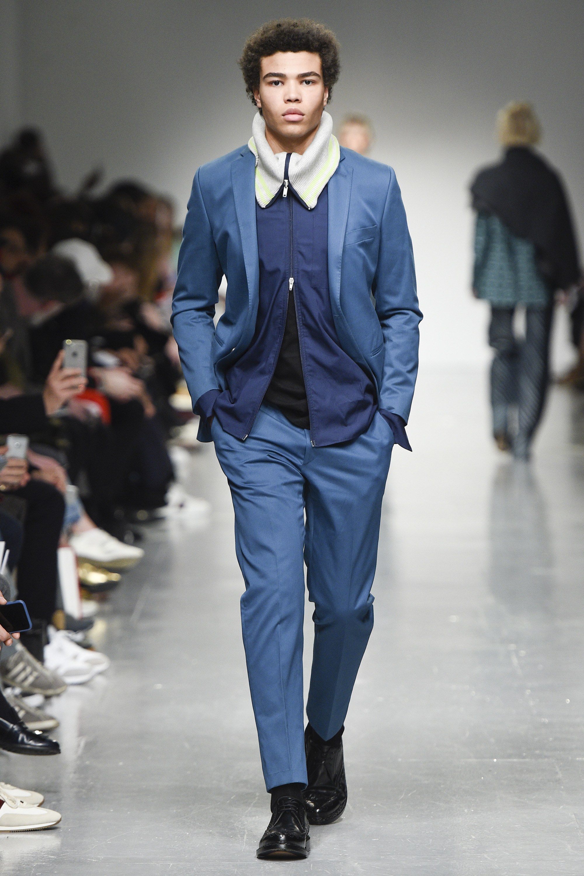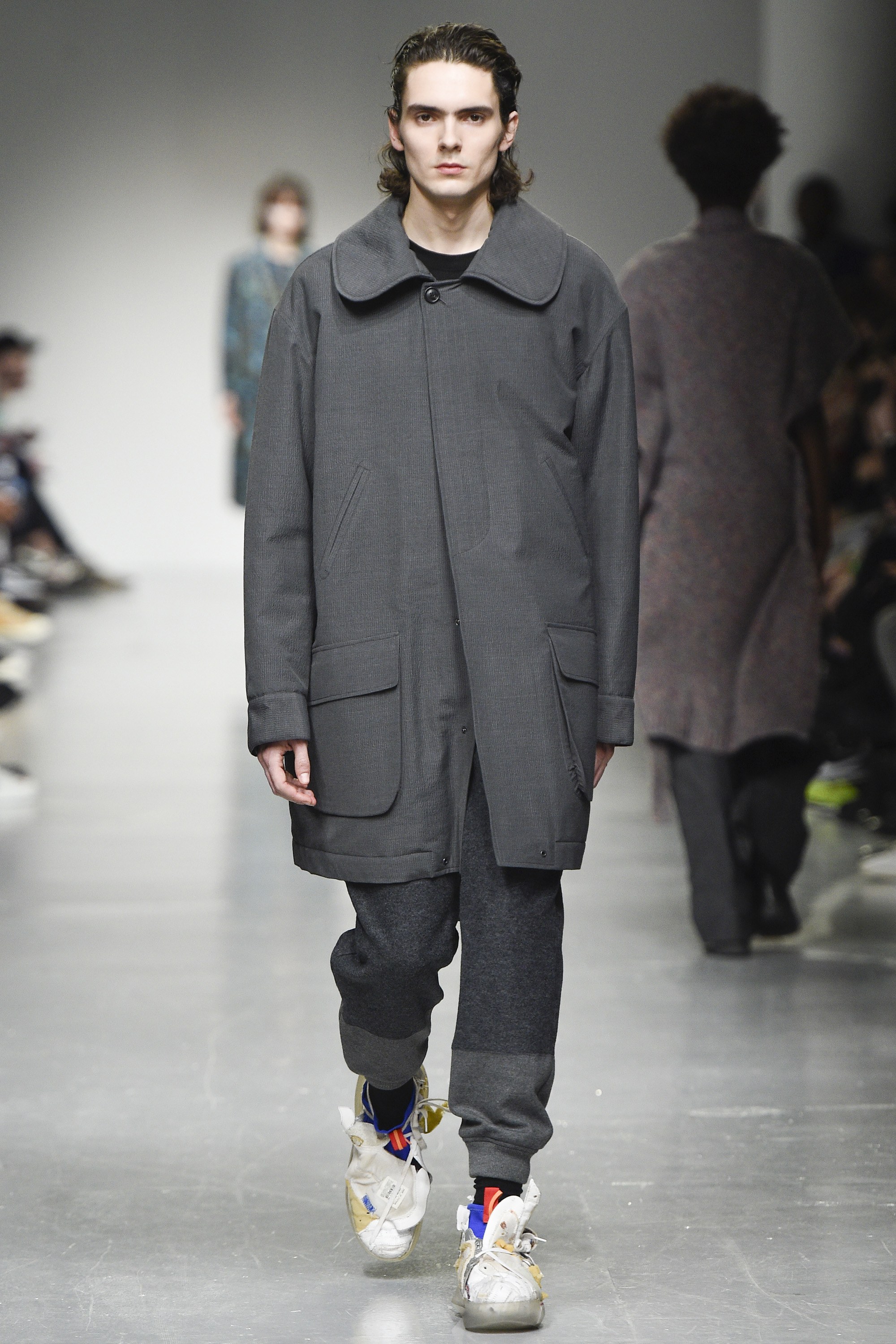 react-text: 108 But, back to the boys. The highest marks go to the opening look, which featured a tweedy, tonal parka of blue and near-black in an abstract circular print. It had a large, scooped fishtail too, and what we’ll call a statement collar. The piece will be a nice option for the gent who likes his coats versatile, yet moderately this side of quirky. Outerwear won overall—an anthracite-hued jacket with a big, almost ’70s-esque curved collar was also strong.