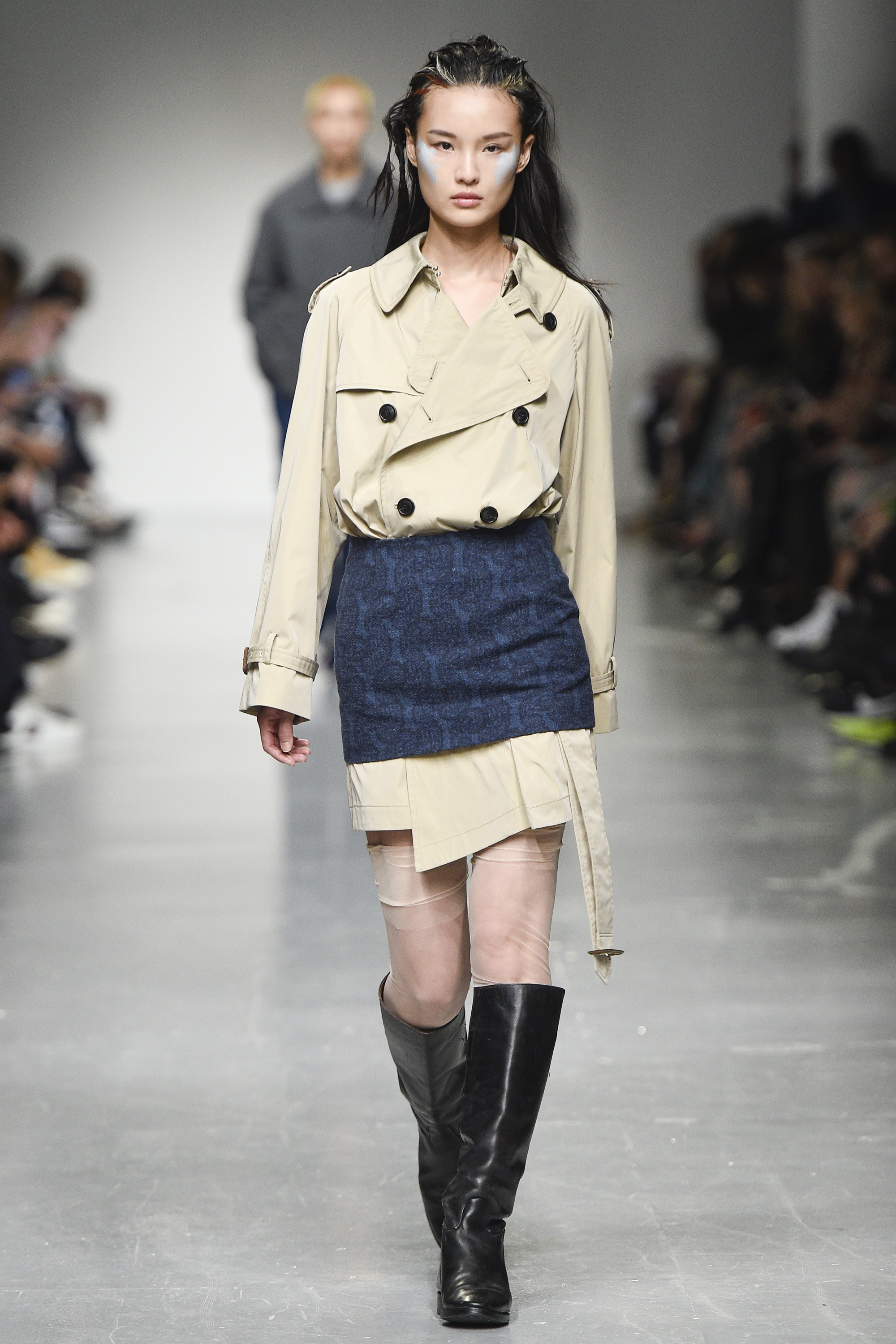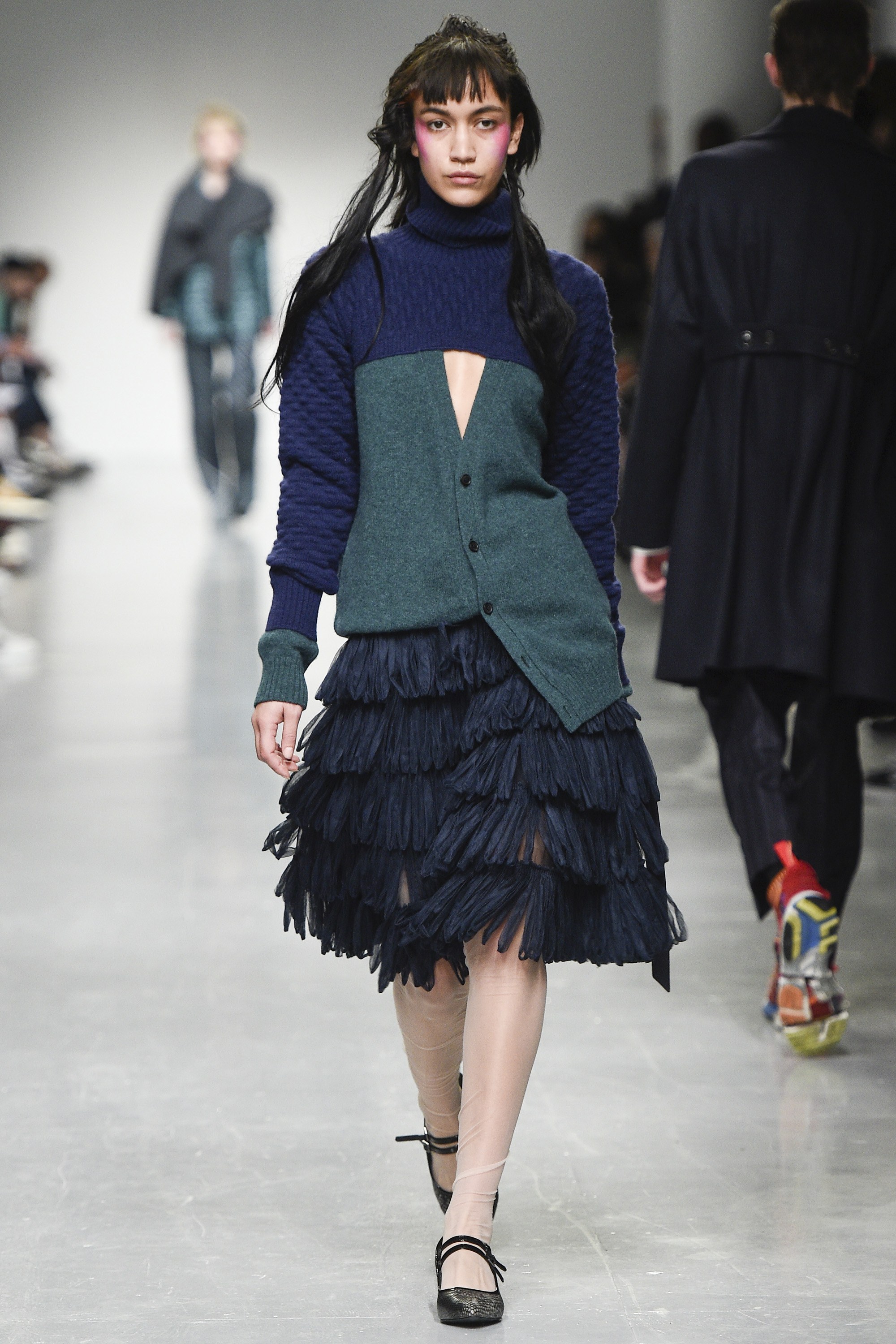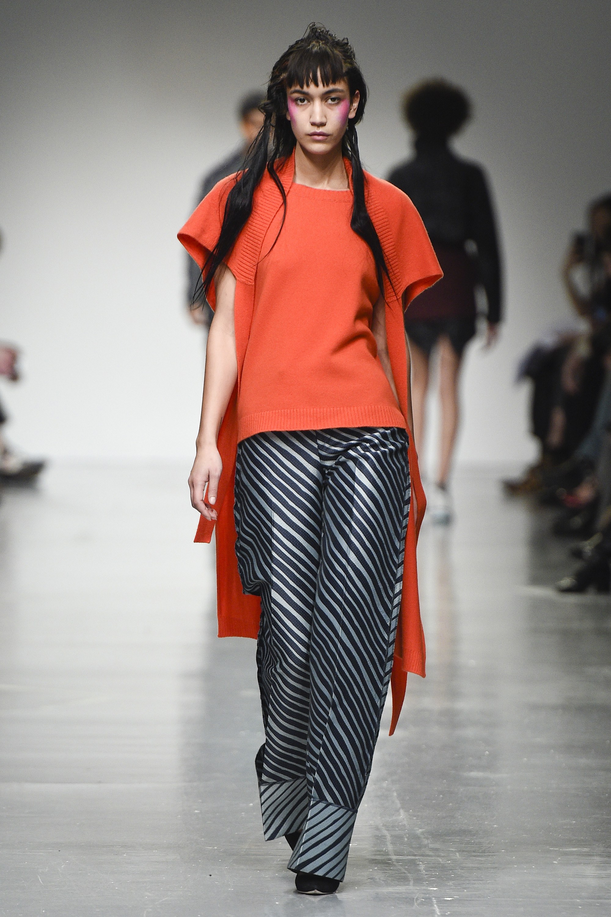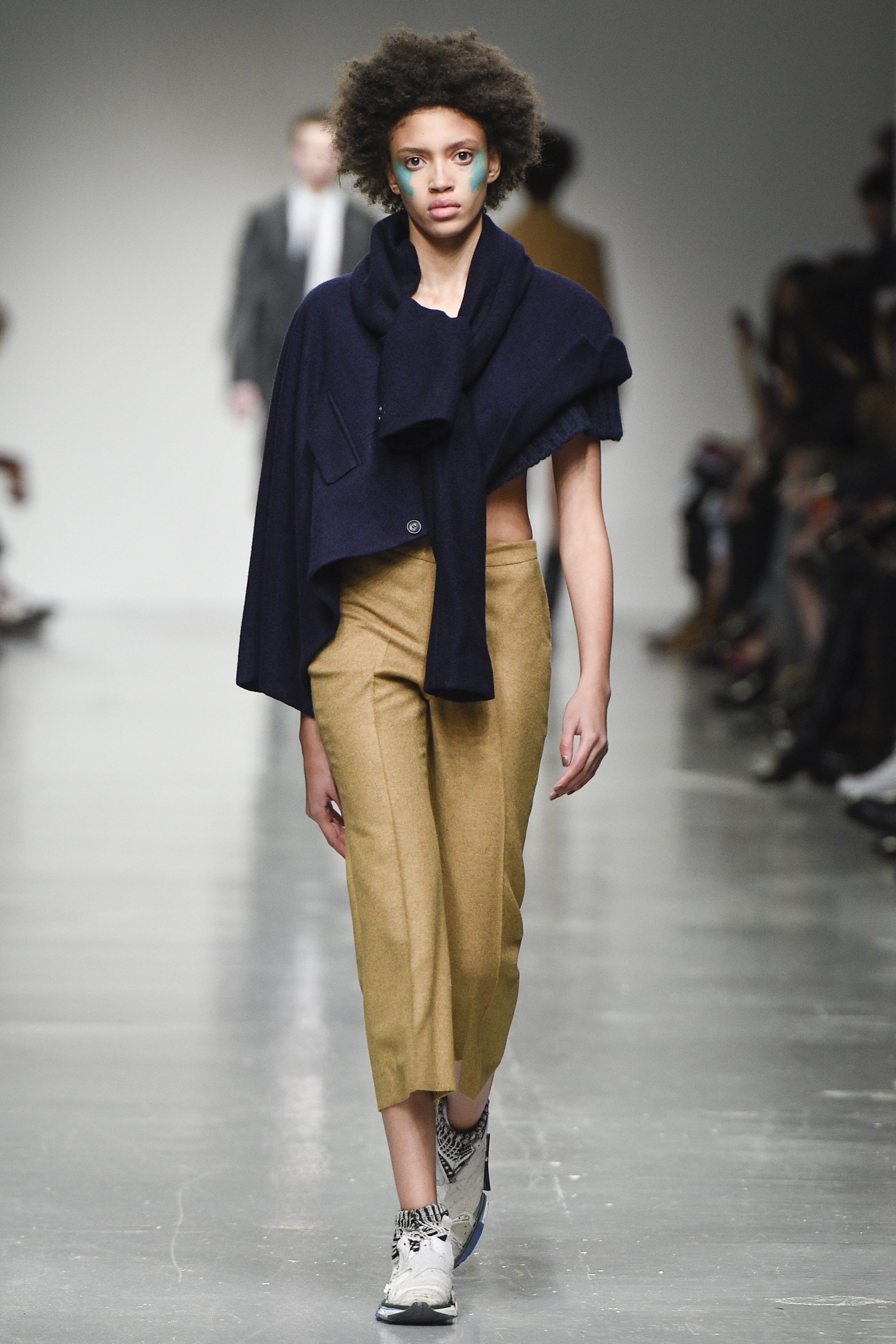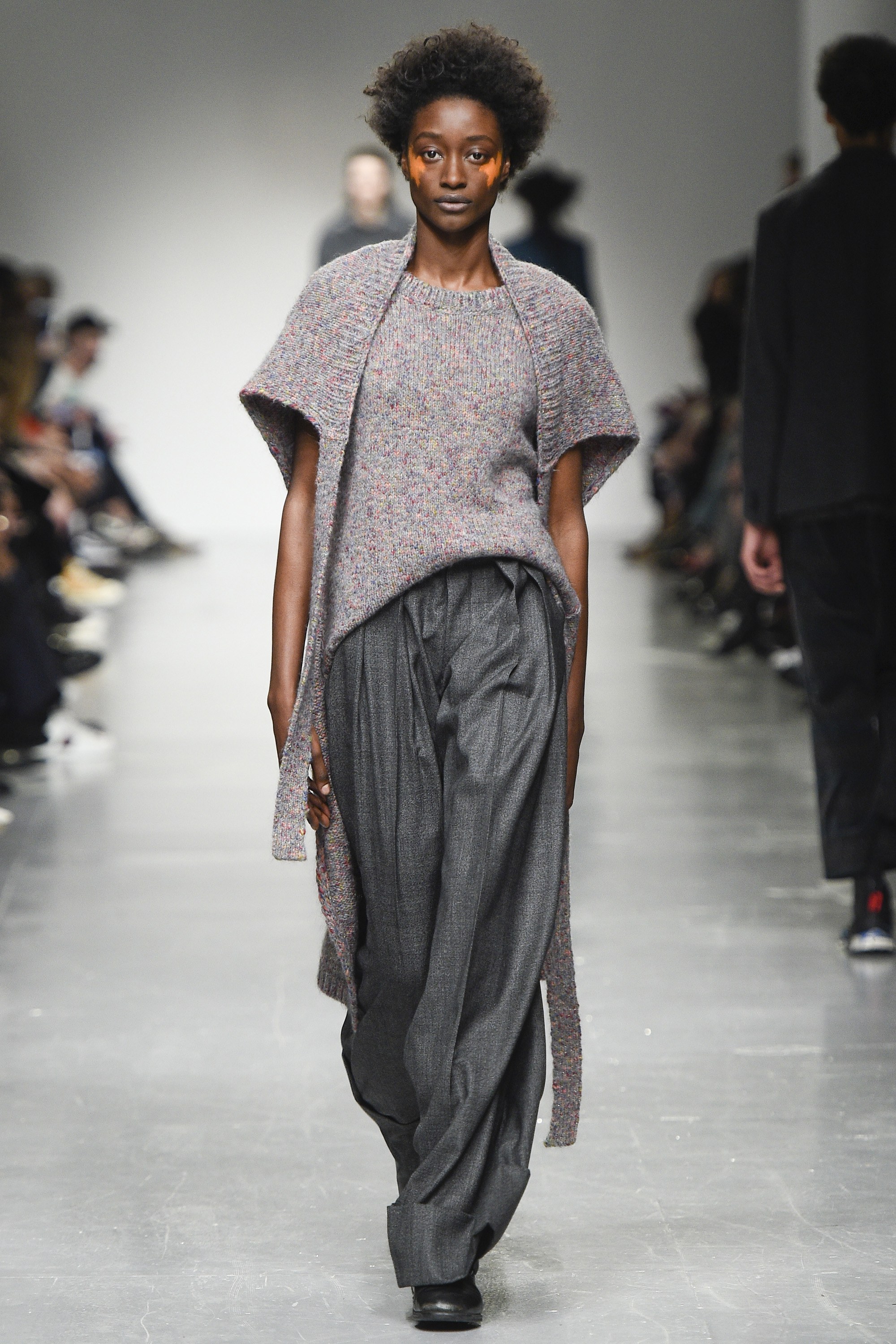 Where those above-mentioned adjustments in cut and shape succeeded, other parts felt more jumbled; too much was packed in on this catwalk. A suit with shortened trousers was singularly and purposefully distressed, leaving free-flying hanging threads—it seemed a little random. There was also a bewildering jumper with a mock crewneck collar hanging at a right angle from the actual collar. Strange crops, on the womenswear too, confirmed the shot amiss; a cleaner focus and/or styling edit would’ve aided the Casely-Hayfords here.