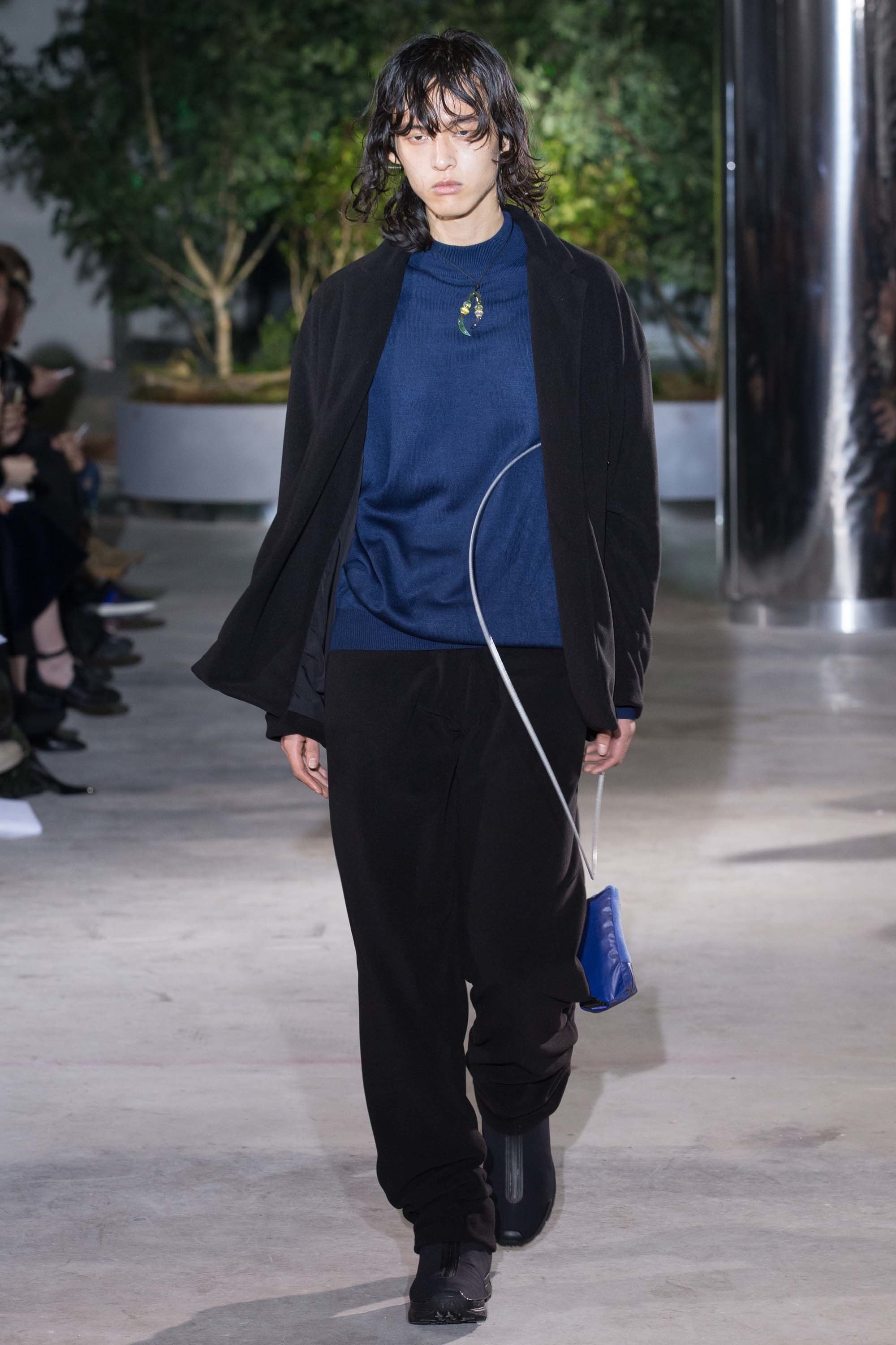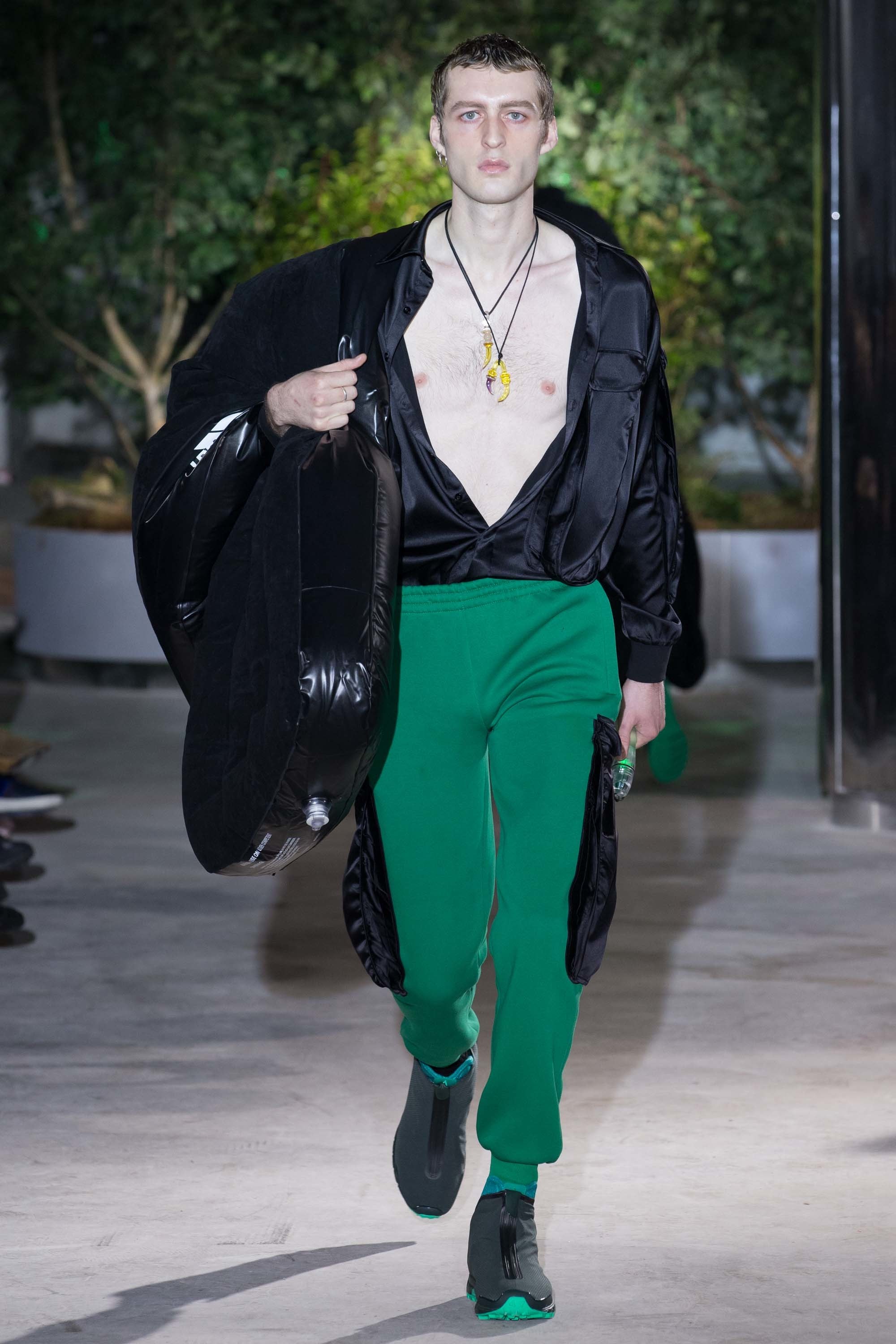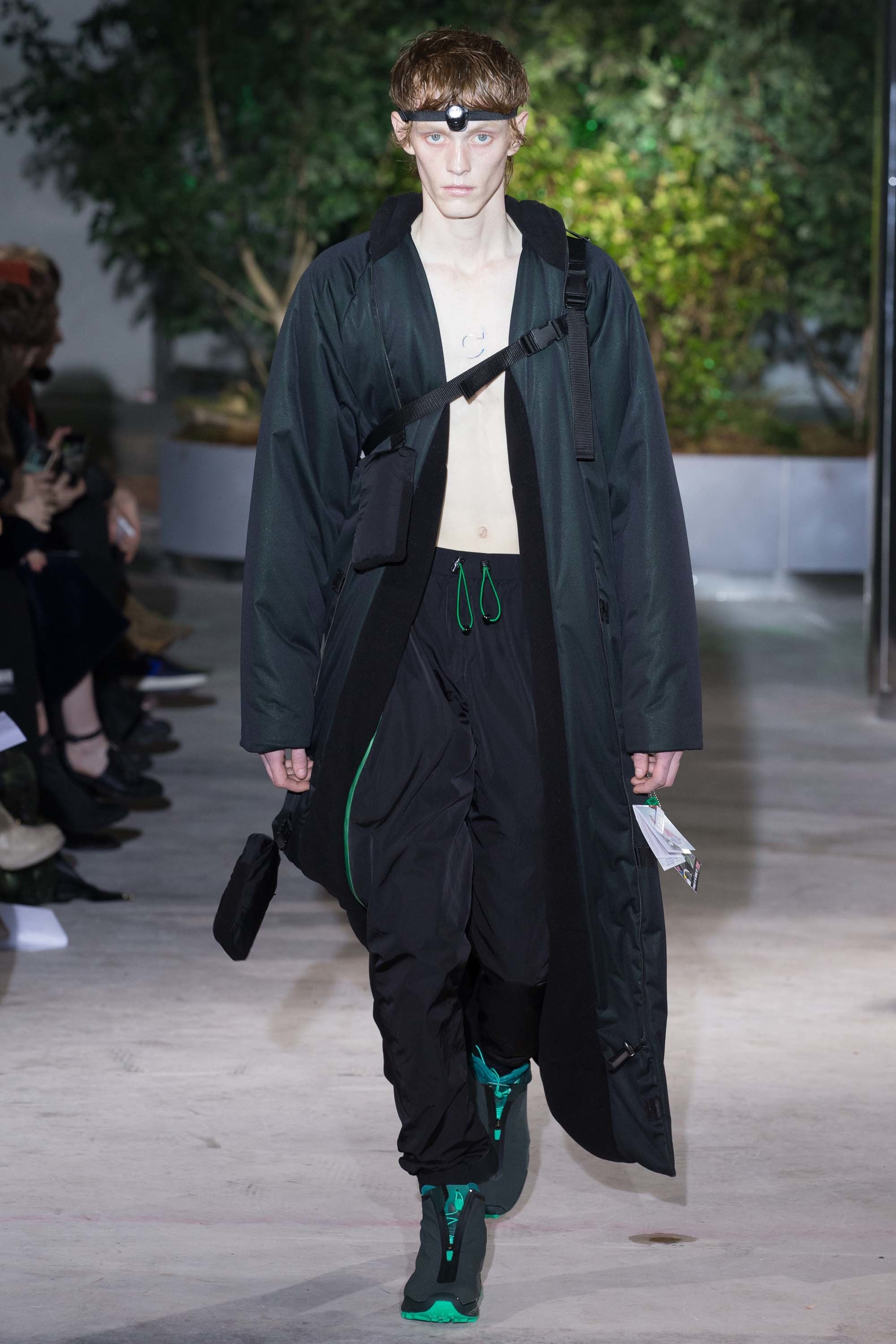 Those observations led to a sophisticated, dystopian wardrobe, with highly technical, whip-corded outerwear (in a palette not dissimilar to Versace’s excellent Spring 2017 collection), funkily shaggy pants, and lifesaving accessories like headlamps and extra boots. One model even carried a blow-up mattress. Yesterday, we saw fabric oxygen tubes at Craig Green. Is self-preservation trending? It would make sense, given the times.
