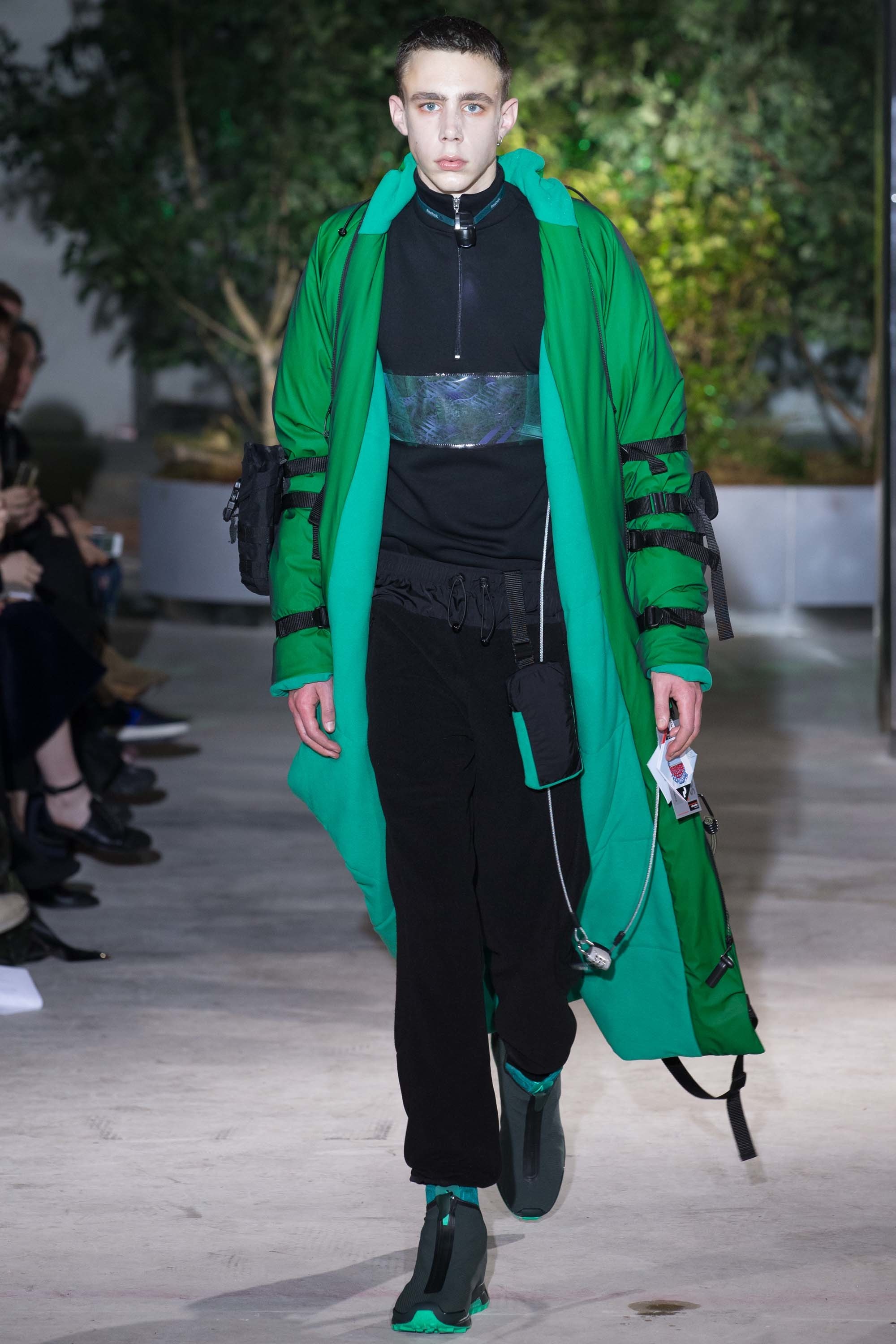 Those observations led to a sophisticated, dystopian wardrobe, with highly technical, whip-corded outerwear (in a palette not dissimilar to Versace’s excellent Spring 2017 collection), funkily shaggy pants, and lifesaving accessories like headlamps and extra boots. One model even carried a blow-up mattress. Yesterday, we saw fabric oxygen tubes at Craig Green. Is self-preservation trending? It would make sense, given the times.