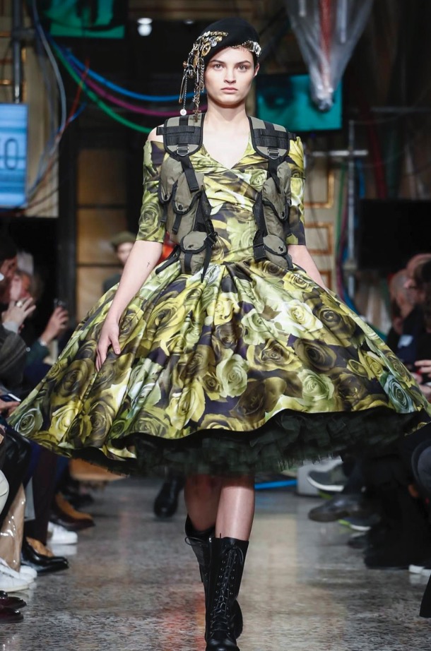 “It’s a global situation. Of course, my country’s in the toilet, but when my country’s in the toilet, the world’s in the toilet. We have to fight — for rights, for beauty, for everything we believe in because it’s being ripped away from us. That’s very much [what I wanted to convey] in the show. [On the clothes] frescoes have been covered over with black paint, arbitrarily, to hide them. That’s what I feel is going on. And trying to find any bits of beauty that you can and almost making emblems and totems of them,” said Scott, who to accessorize silhouettes loaded berets and gloves with metal military trinkets — Eighties-style — that clinked down the runway.