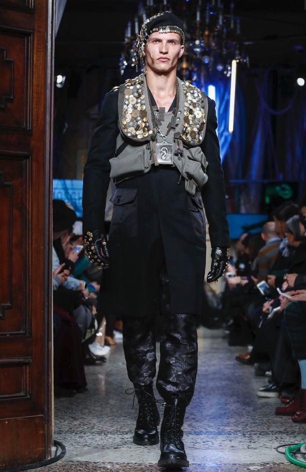 “It’s a global situation. Of course, my country’s in the toilet, but when my country’s in the toilet, the world’s in the toilet. We have to fight — for rights, for beauty, for everything we believe in because it’s being ripped away from us. That’s very much [what I wanted to convey] in the show. [On the clothes] frescoes have been covered over with black paint, arbitrarily, to hide them. That’s what I feel is going on. And trying to find any bits of beauty that you can and almost making emblems and totems of them,” said Scott, who to accessorize silhouettes loaded berets and gloves with metal military trinkets — Eighties-style — that clinked down the runway.