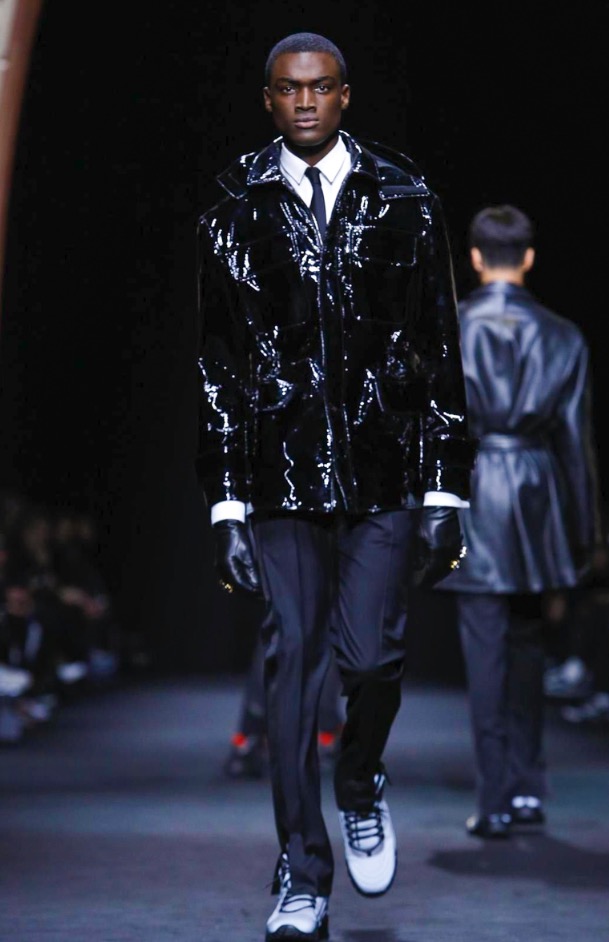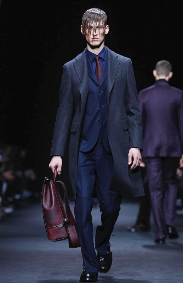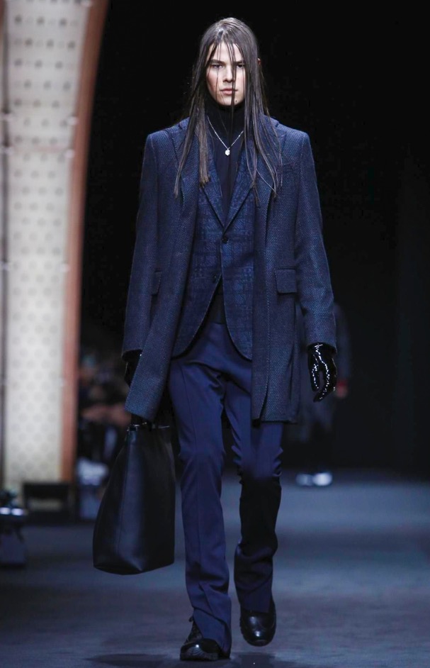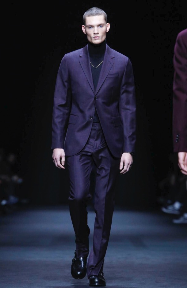 The Versace suit is refreshed and lightened: the strong silhouette is now neat to the body, with a soft constructed shoulder for the way men wear tailoring today.