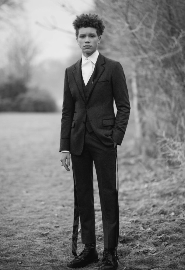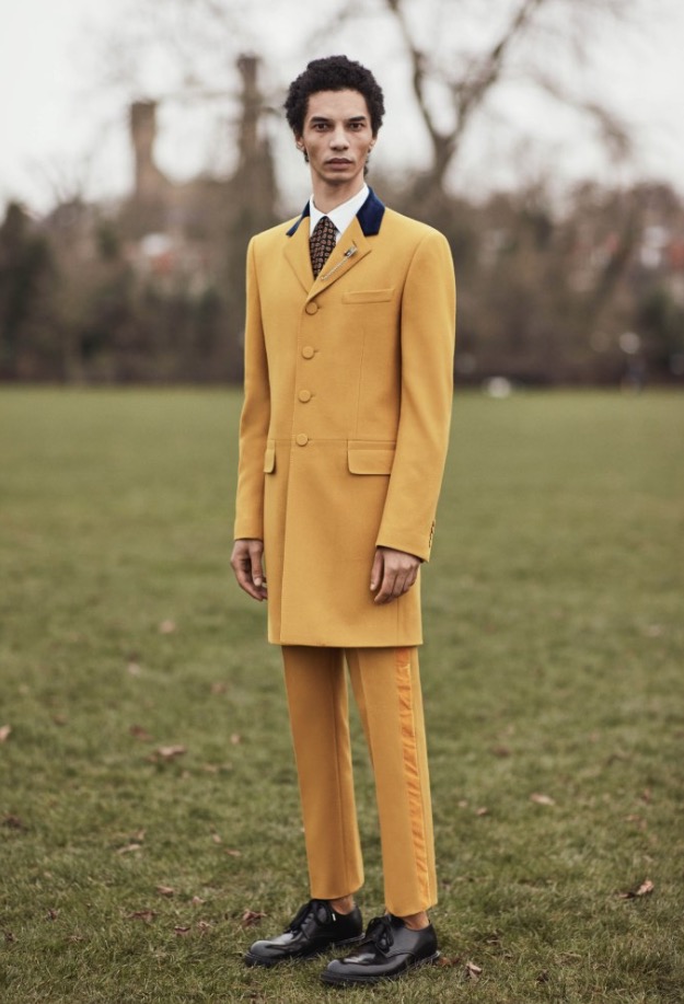 The writer wears tailoring typical of the London gent, cut in classic British fabrics to begin with – jackets and coats in wool serge with velvet appliqués, a 3-piece flannel suit in charcoal and exaggerated overcoats in or trimmed with shearling. His style becomes more fanciful, as he travels from the British capital to France.