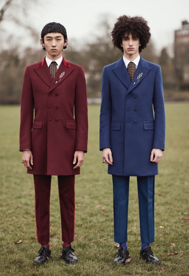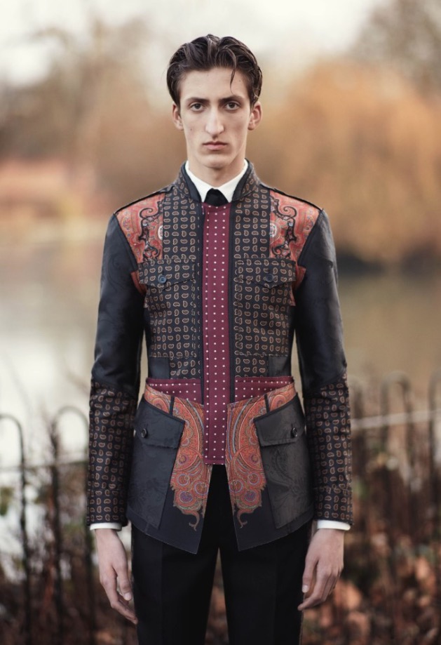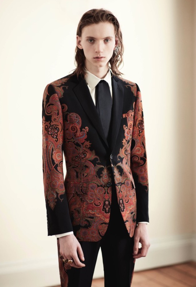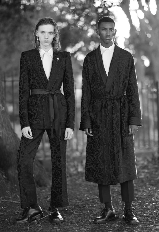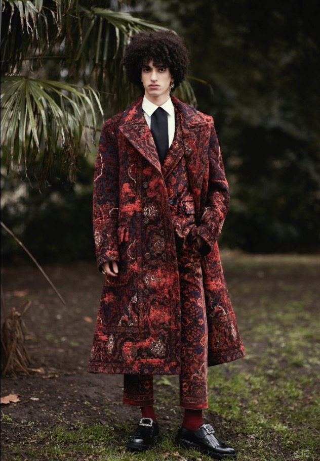 An all-over paisley print silk robe, an overcoat made in a jacquard inspired by antique rugs and gemstone rings all pay homage to the magnificent dandy. Two huge gold peacocks on a dark green background painted above Wilde’s bed in the room at L’Hotel on the Left Bank was where he spent his last days. They remain there to this day and are the central motif in this collection.
