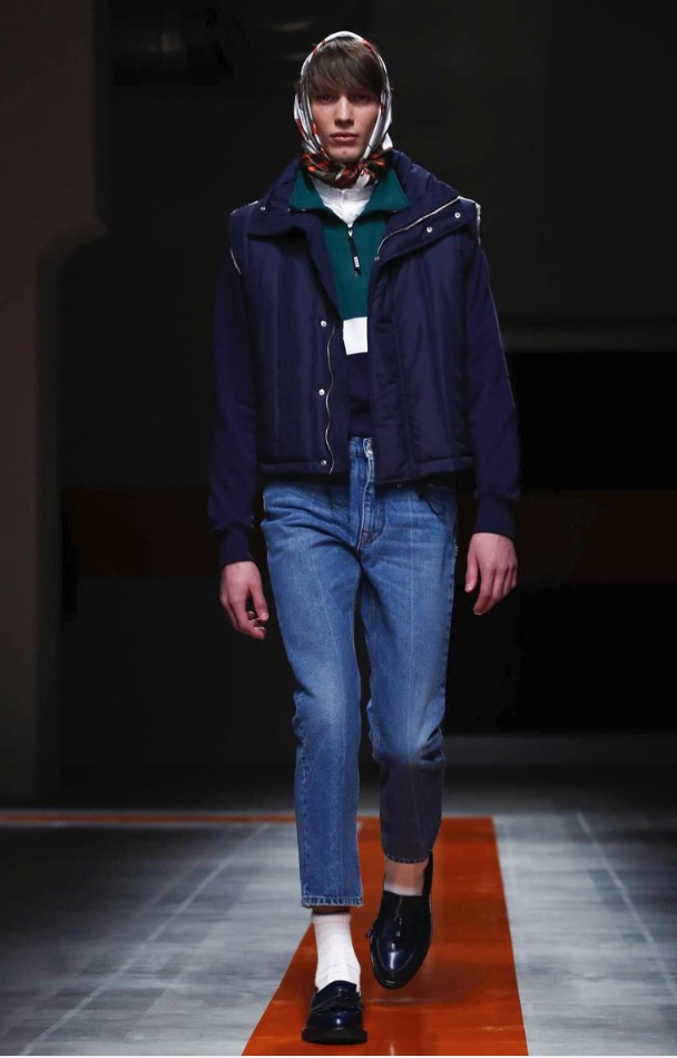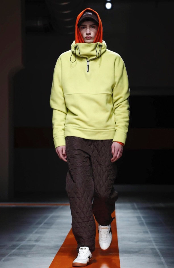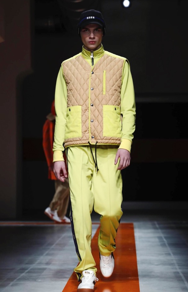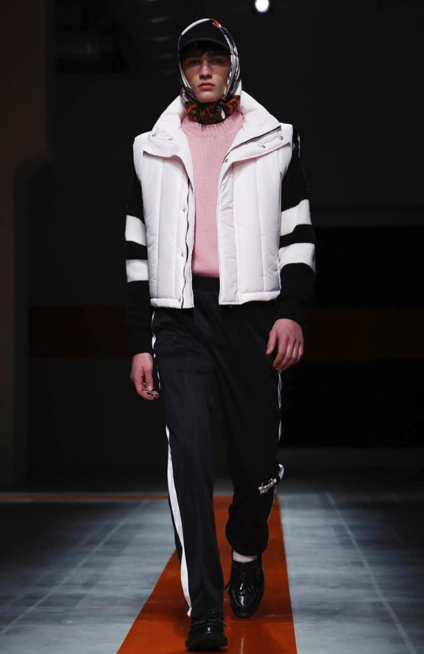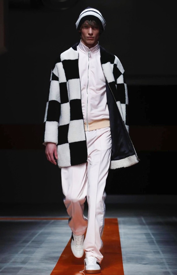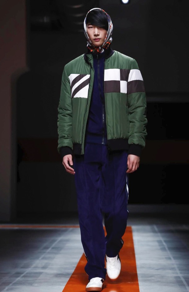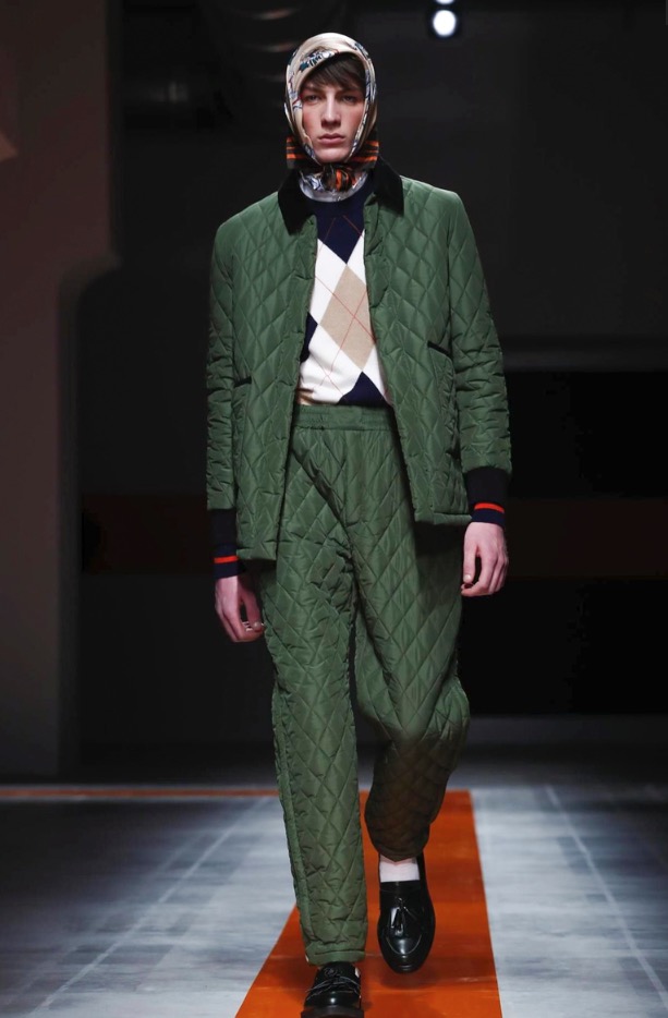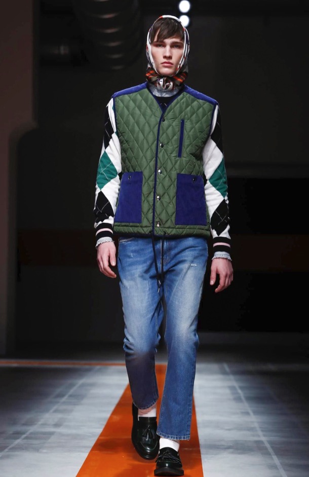 The brand’s founder and creative director took colorful, patterned jockeys’ silks and channeled them into checkerboard patterns for bombers and shearlings, the blue corduroy patchwork on a green quilted vest, and randomly-placed geometric patches on puffers.