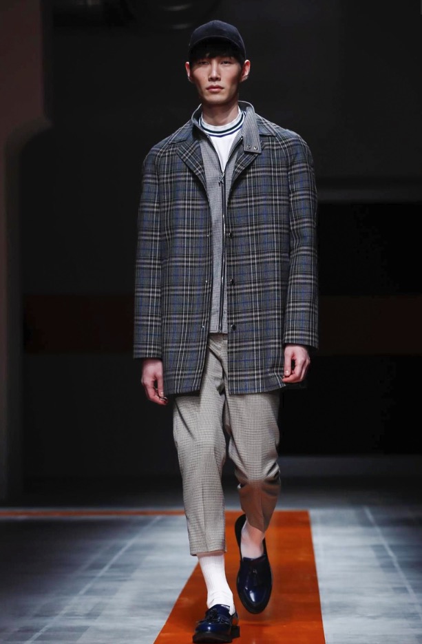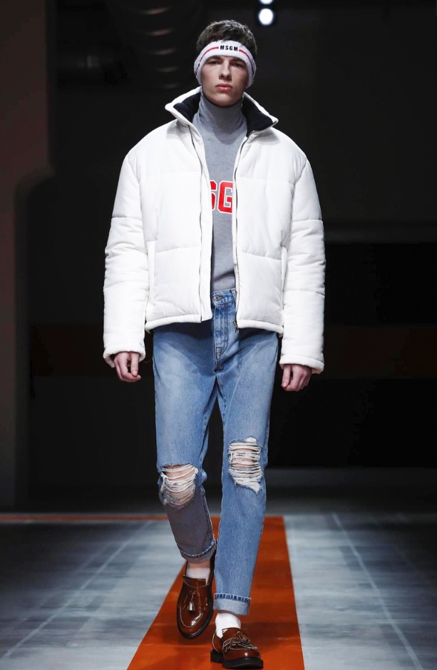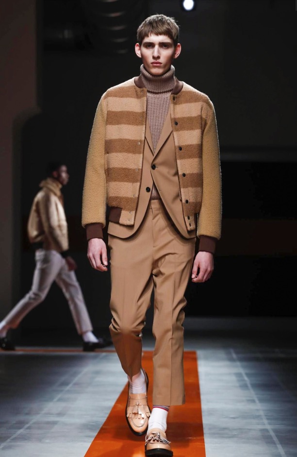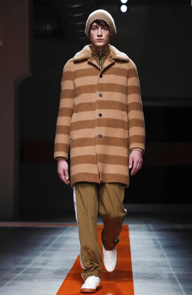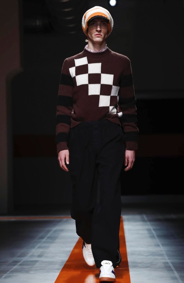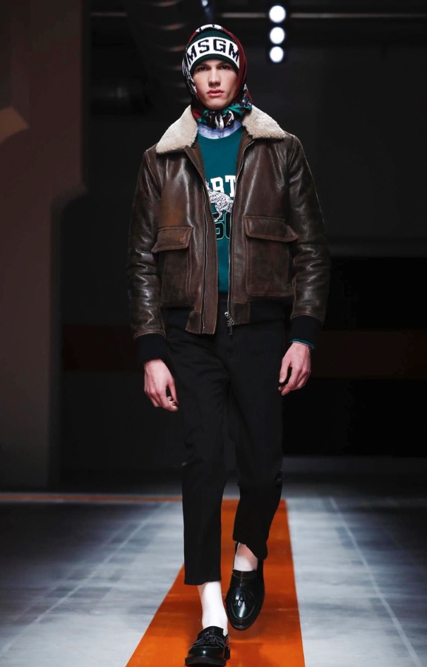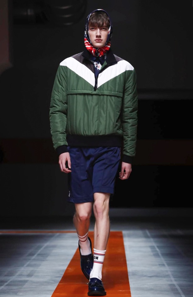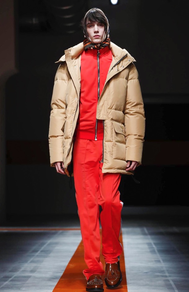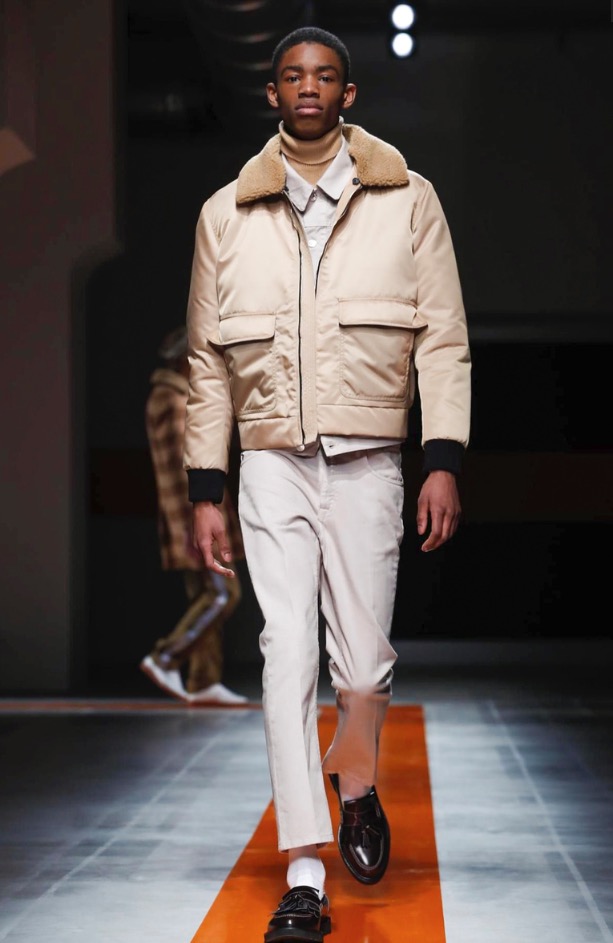 The brand’s founder and creative director took colorful, patterned jockeys’ silks and channeled them into checkerboard patterns for bombers and shearlings, the blue corduroy patchwork on a green quilted vest, and randomly-placed geometric patches on puffers.