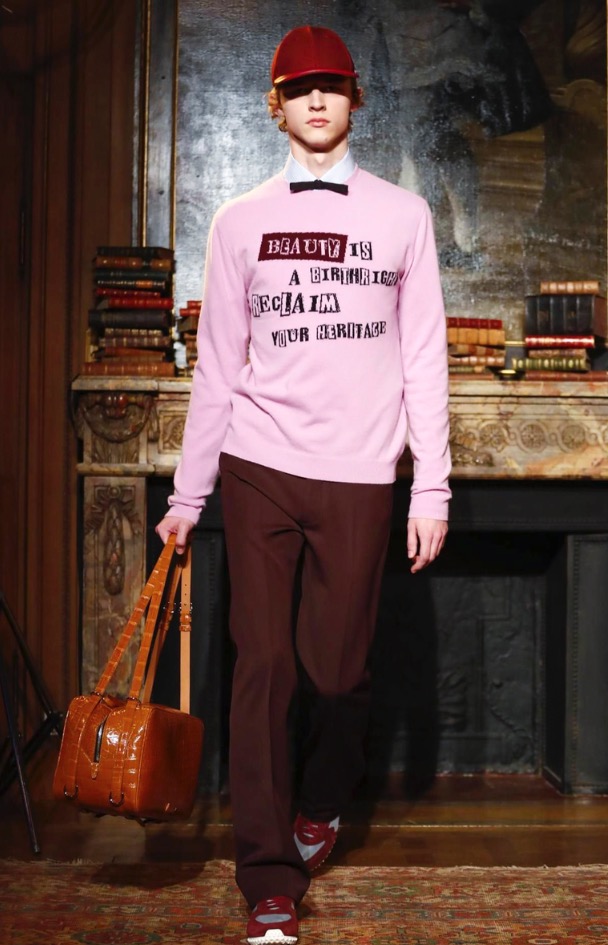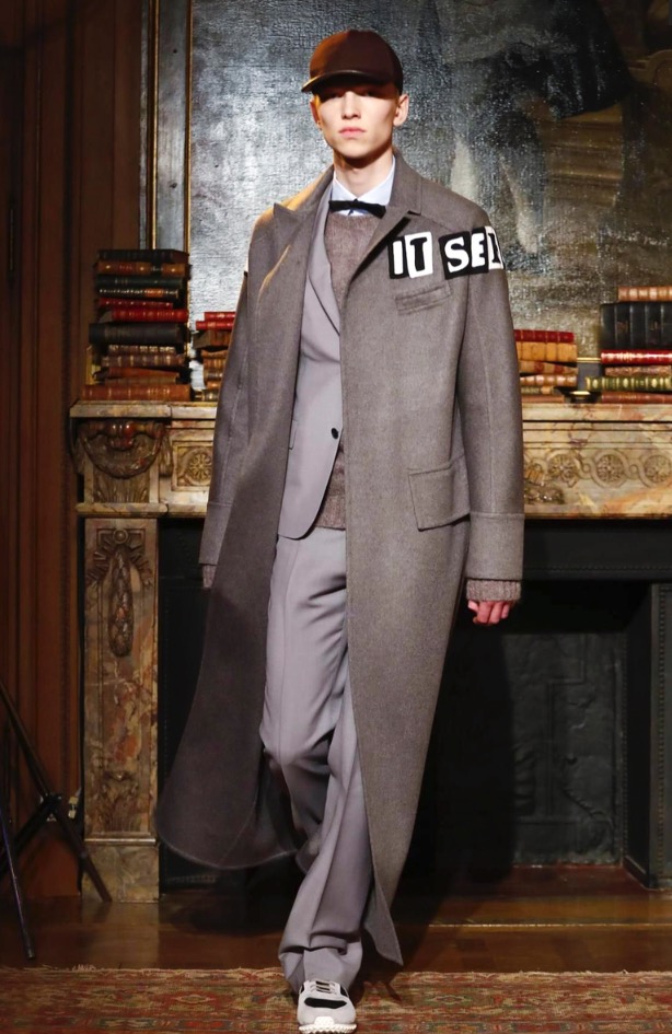 For the Men’s Fall/Winter 2017-18 collection by Pierpaolo Piccioli, classicality is observed through the lens of visceral expression and its profound essence is captured and altered as in a painting by Francis Bacon. The slogans and punk lettering of the anarchist and artist Jamie Reid are combined in a free and personal composition.