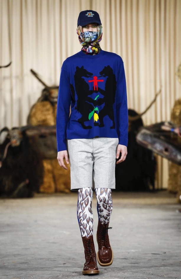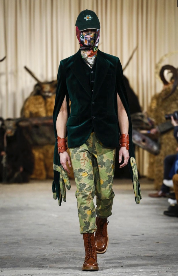 Walter van Beirendonck Fall/Winter 2017 in Paris Fashion Week. Designer presented models with printed silky scarf on the runway titled “Shadows” also fellow artbros Brian Kenny and Bj Broekhiuzen with their printed silky scarfs, plus they wear big hands couture.