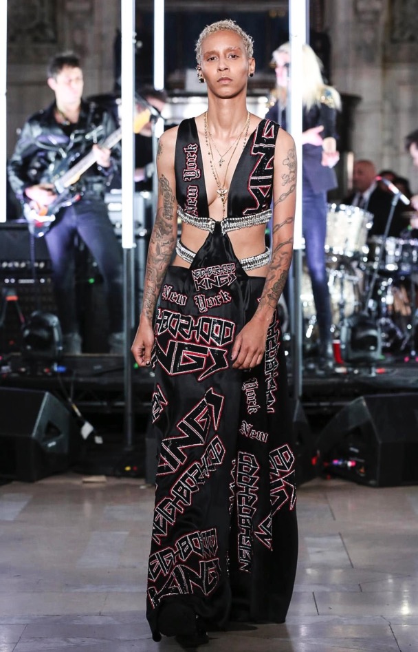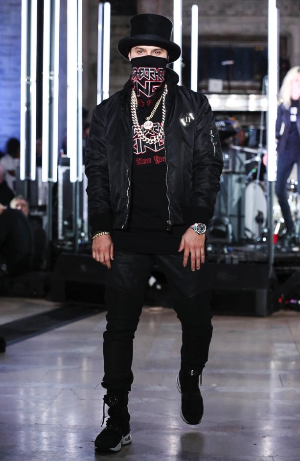 The venue’s beautiful steps were lined with ladies in Statue of Liberty costumes; Elvis and the Naked Cowboy (who wore Plein-branded briefs) took a break from Times Square to play the showgoers in; chain fences and neon signs, including one that read “who the f**k is Philipp Plein,” lined the walls; and ushers in sequined taxi outfits helped direct people to their seats. Legendary NYC rapper Nas performed before the show, and megastars like Madonna, Kylie Jenner, Paris Hilton and Fat Joe made up much of the front row.