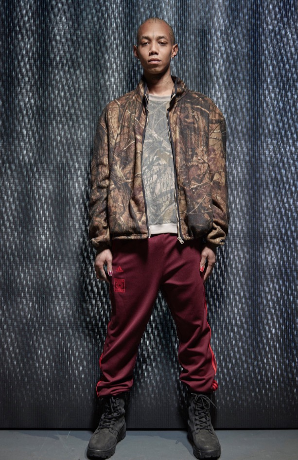 As for the collection, it was perfectly in line with the current Nineties worn-in, weathered streetwear revival given an improbable aura of glamour. For women, a teal plaid flannel workwear jacket was worn over a teal sweater and stone-washed straight-leg cool-mom jeans tucked into knee-high, slouchy suede high-heel boots. The boot-and-casual pants combo continued with rusty suede over-the-knee stilettos over faded black jeans, and burgundy leather thigh boots hiked up over a burgundy Adidas tracksuit with the jacket tucked into the pants. That look is not ultra nerdy anymore — it’s cool. There was a lot of camouflage, for guys and girls, as well as big hoodies and varsity jackets that displayed the “Calabasas” logo West and his wife, Kim Kardashian, have been photographed wearing. For example, an oversize bomber with a black panther on the back and the words “Calabasas Lost Hills 91302 Acoura,” all Los Angeles references. To accessorize, there were gigantic duffels, baseball caps and a white and teal sneaker for men that would make suburban dads look like suburban dads, but captured that mood of ironic cool in this element.