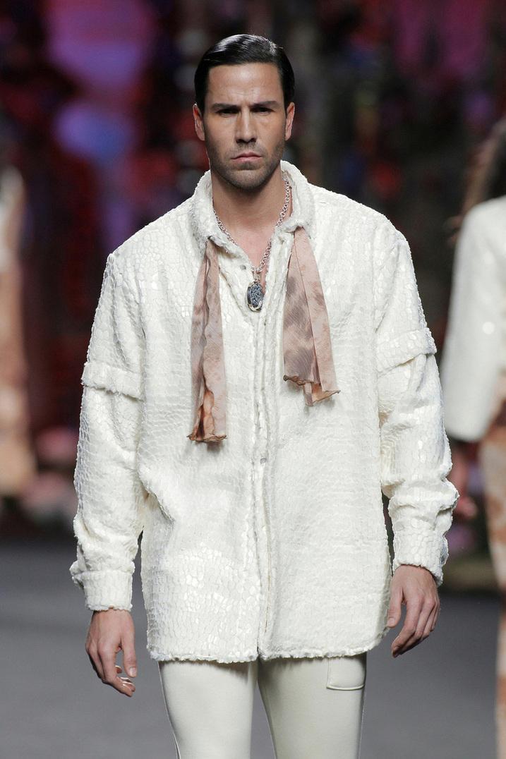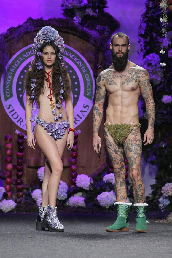 “Our fashion proposal begins precisely with a declaration of paradisiacal principles: Adam and Eve, the father and mother, on the catwalk in their essential and innocent nakedness, taking a dizzying leap forward and communicating with each other and with the Orb to Through mobile technology with the fashionable coverage provided by Francis Montesinos housings for their smartphones.”