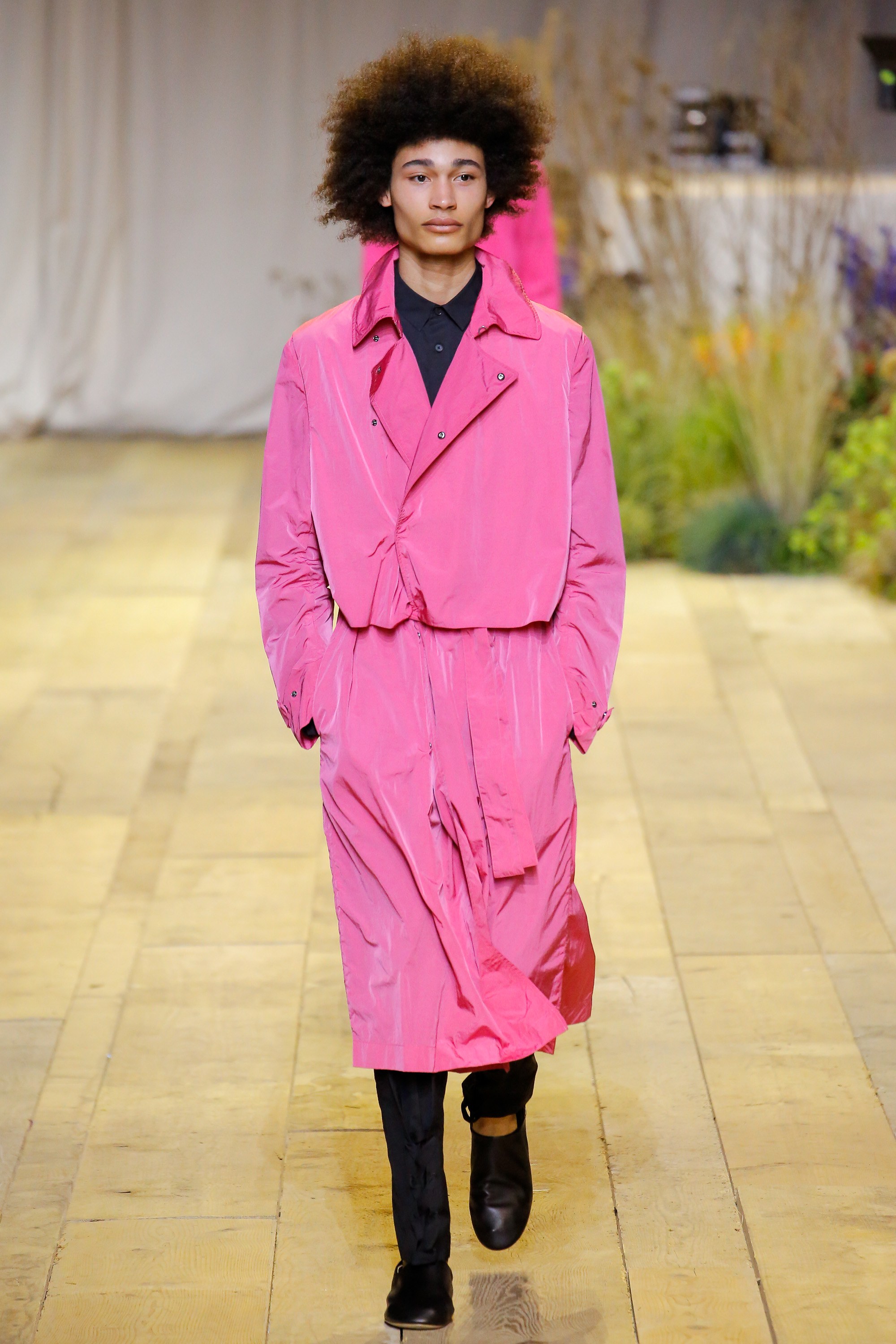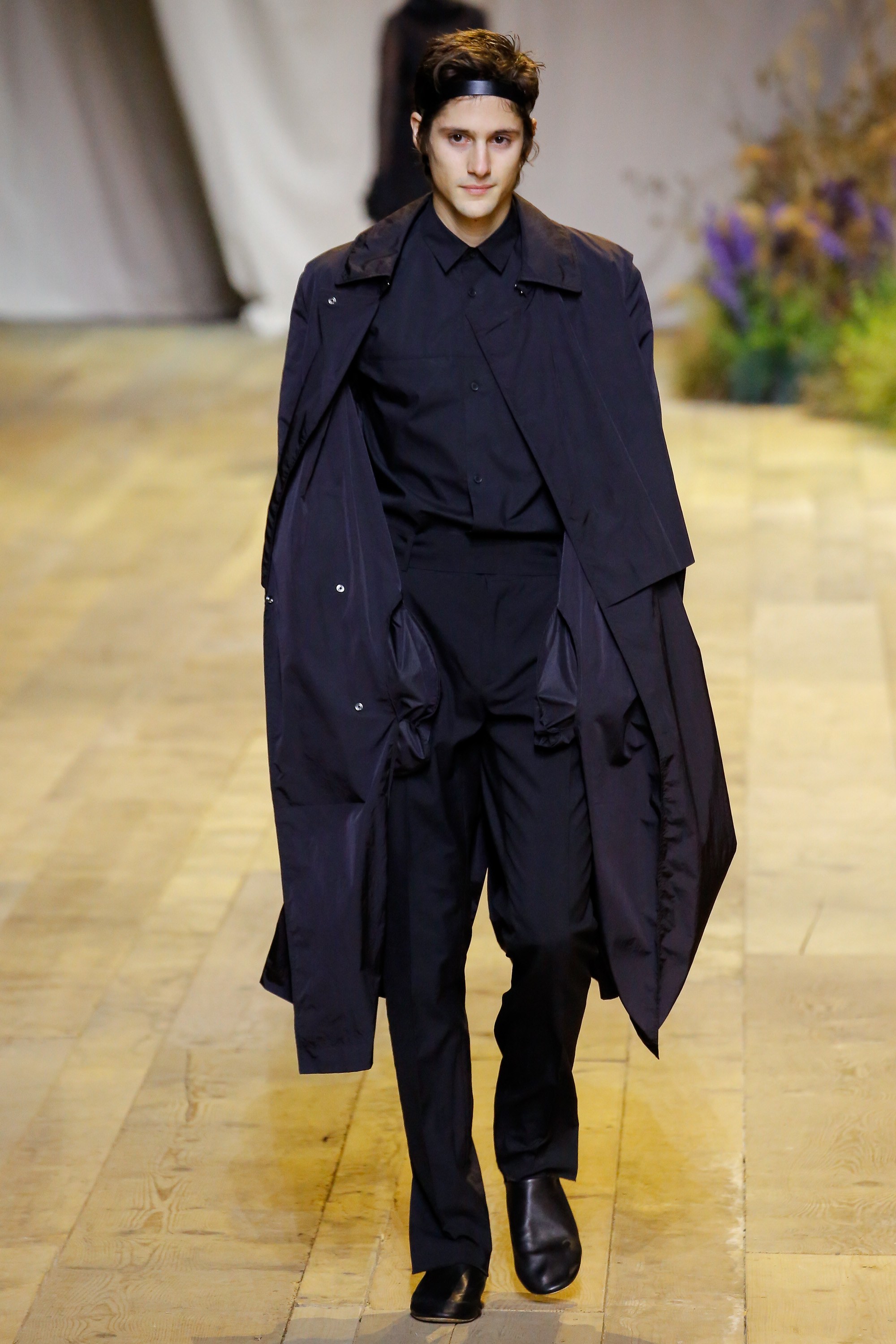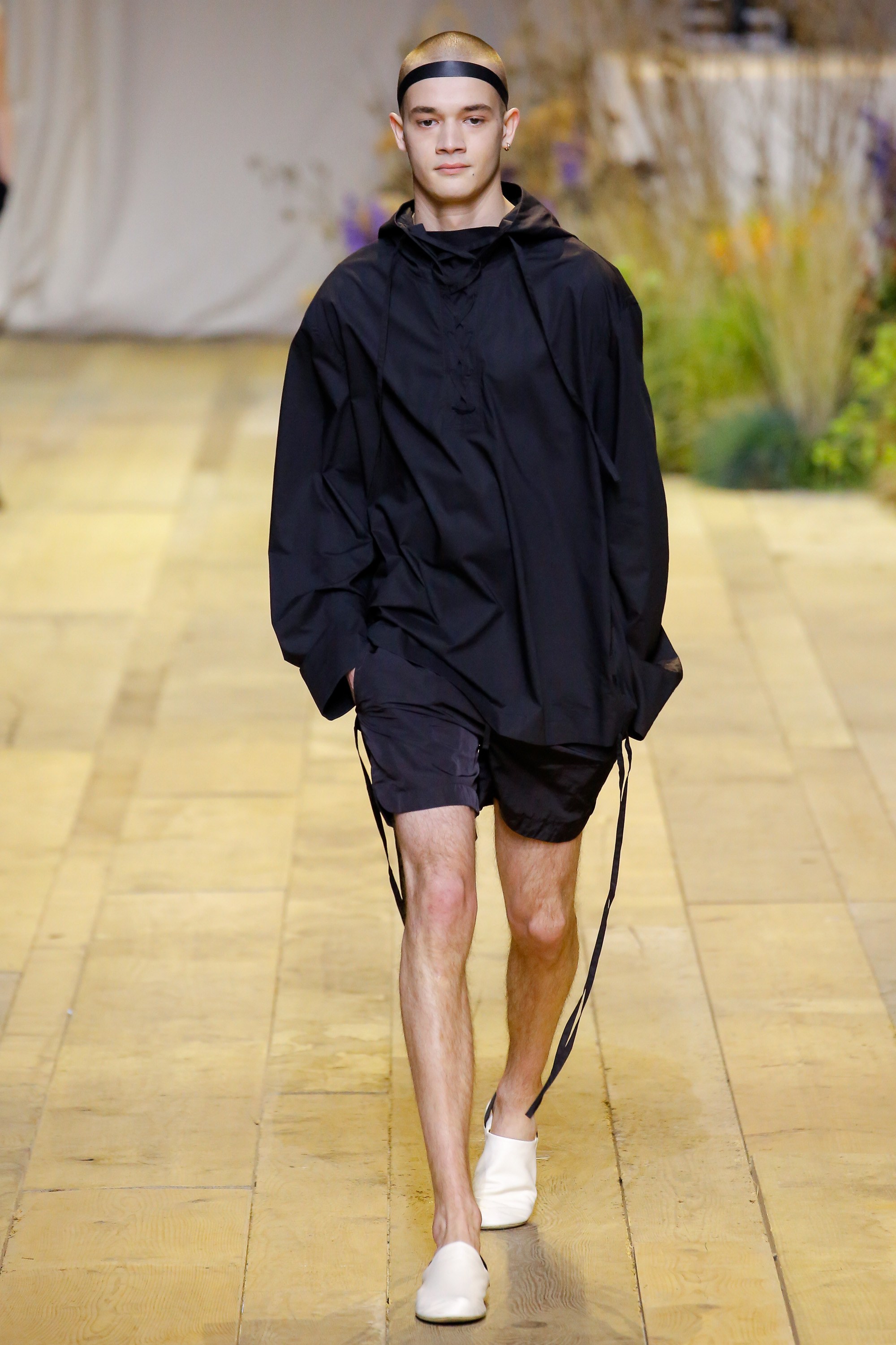 The collections are inspired by contradictions, which is evident when examining what the models were wearing on the runway. For women, there are romantic blouses and shirts with ruffles as well as minimalistic anoraks and dresses in technical materials with plenty of sportswear details. For men, many garments mix formalwear and sportswear; for example, there’s a trench coat with dropped vents made in technical materials, and delicate transparent tops layered with heavier jackets and lace-up knits.