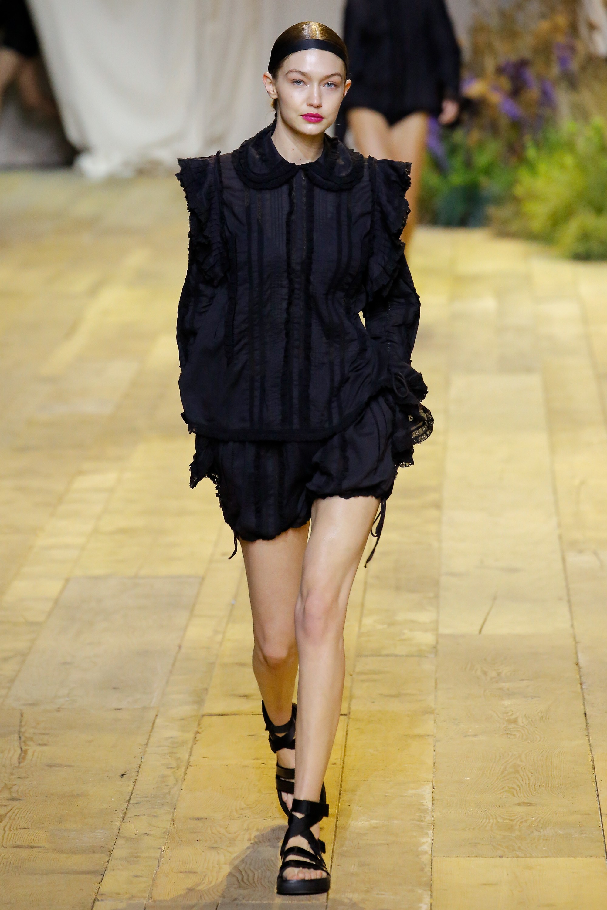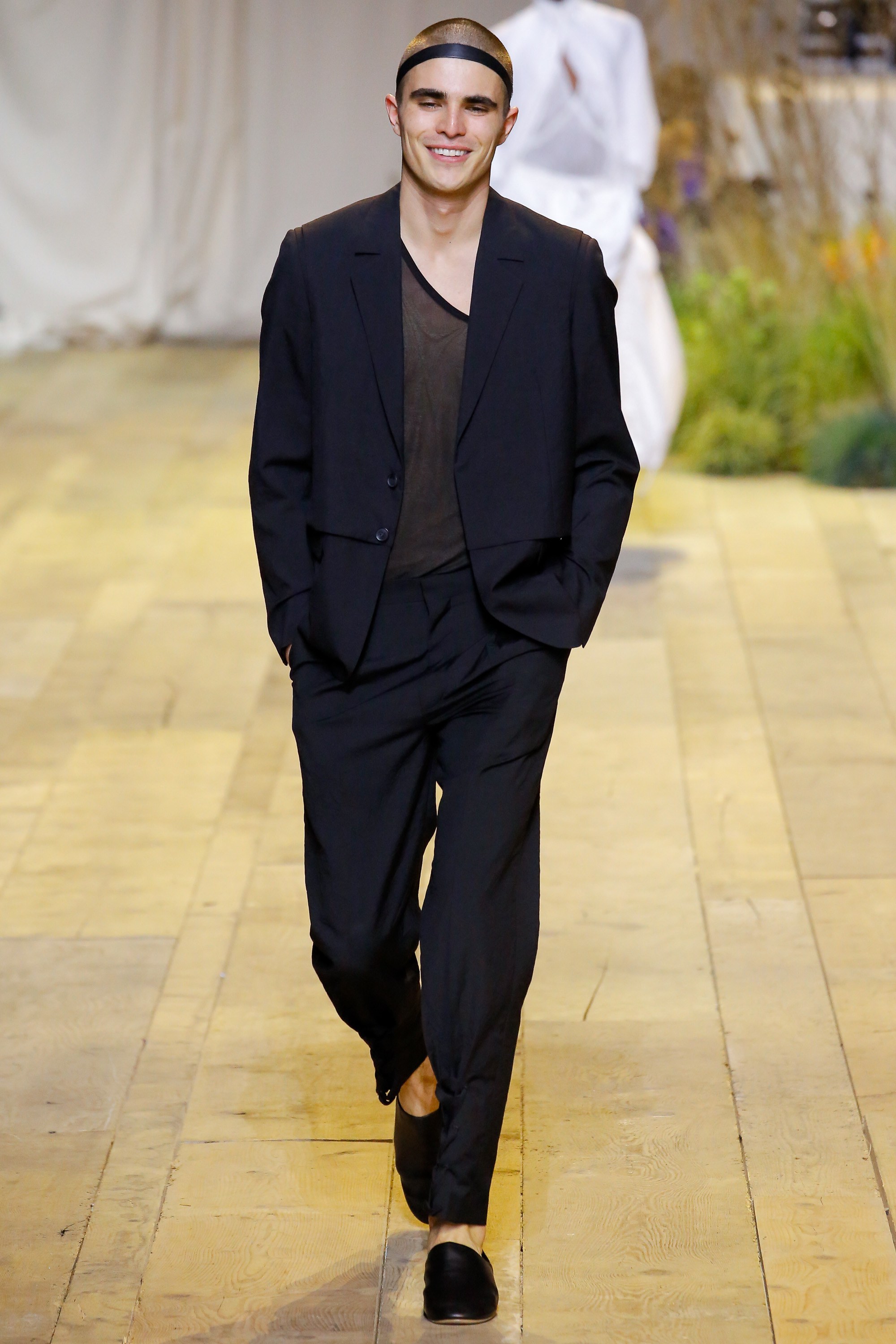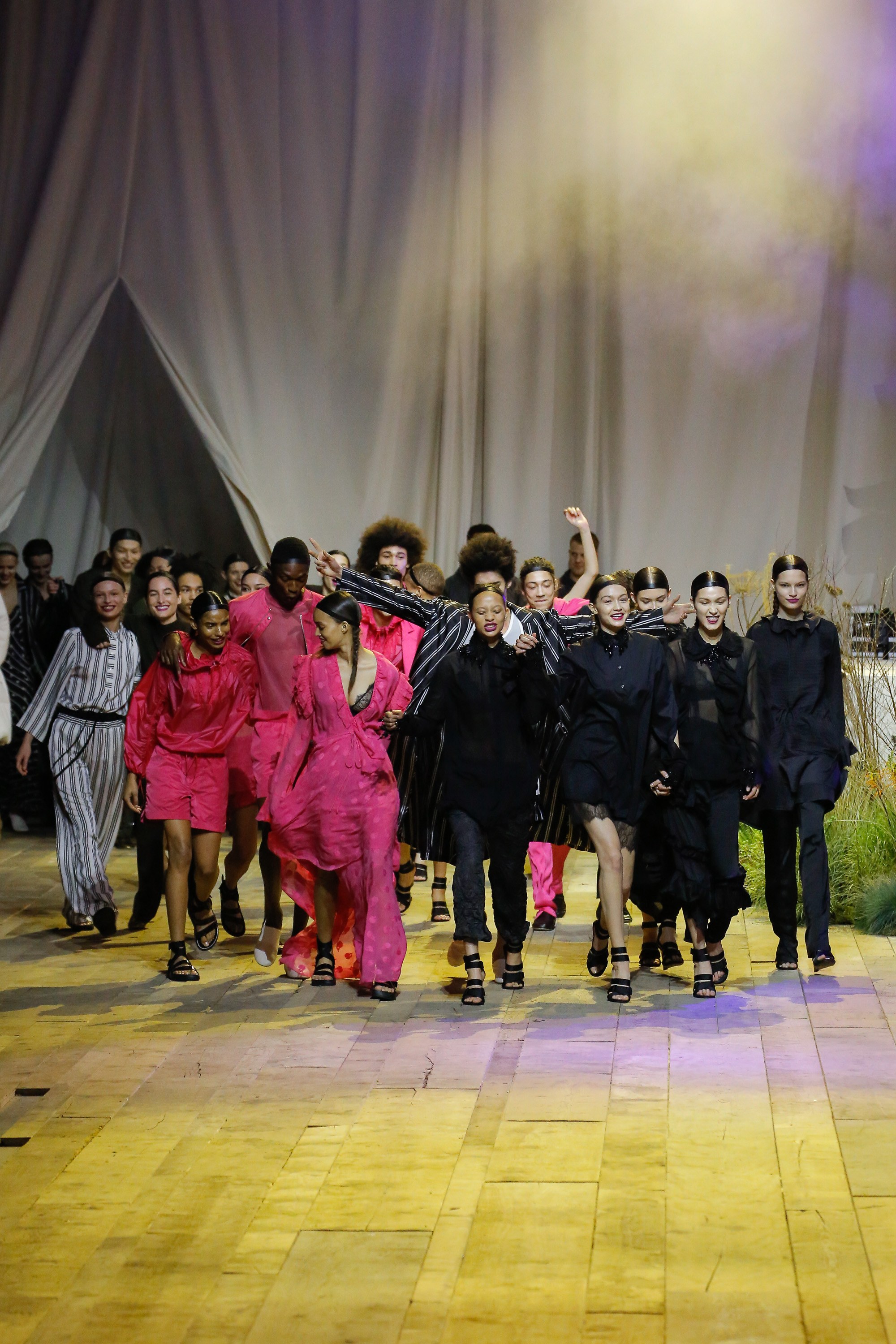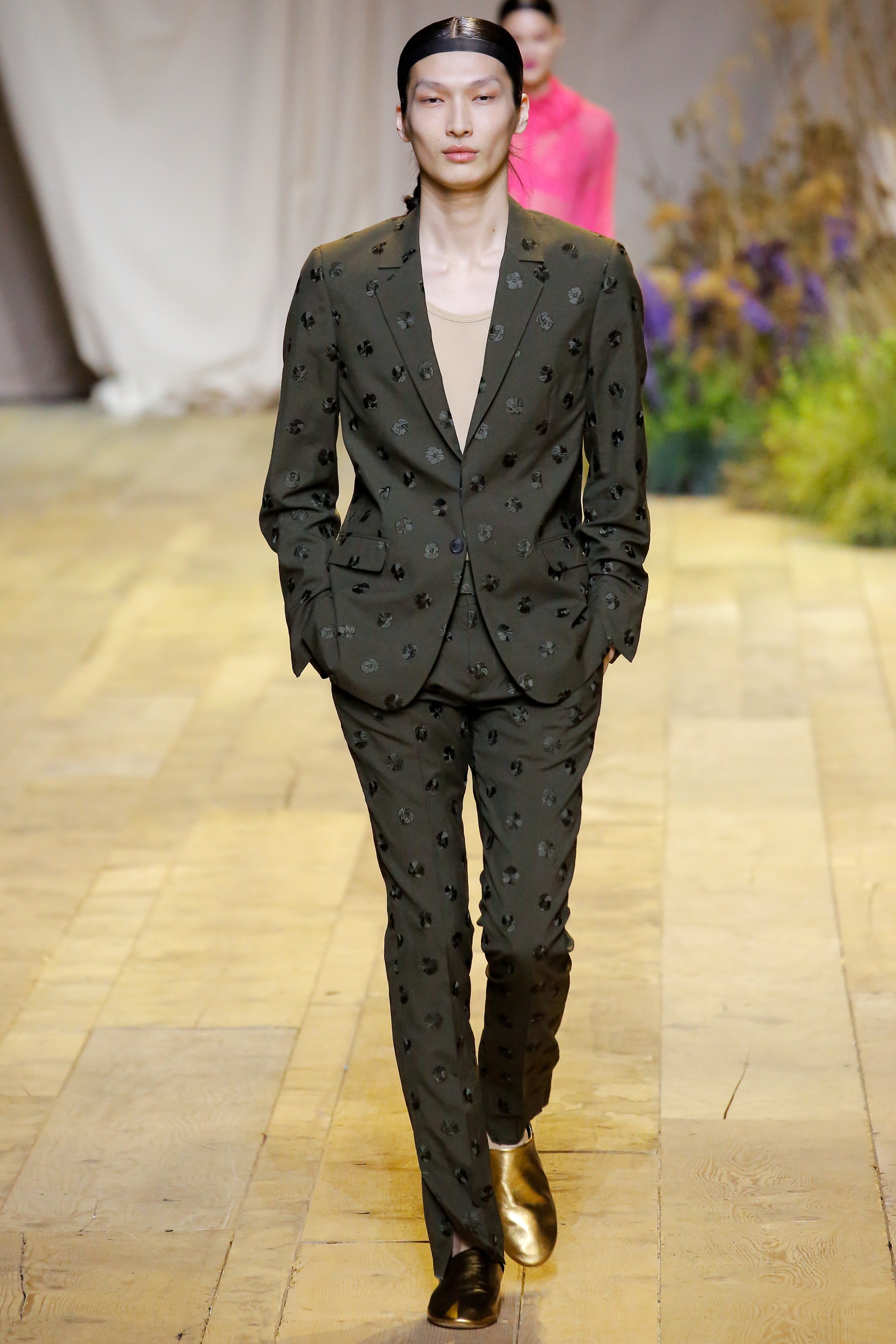 The collections are inspired by contradictions, which is evident when examining what the models were wearing on the runway. For women, there are romantic blouses and shirts with ruffles as well as minimalistic anoraks and dresses in technical materials with plenty of sportswear details. For men, many garments mix formalwear and sportswear; for example, there’s a trench coat with dropped vents made in technical materials, and delicate transparent tops layered with heavier jackets and lace-up knits.