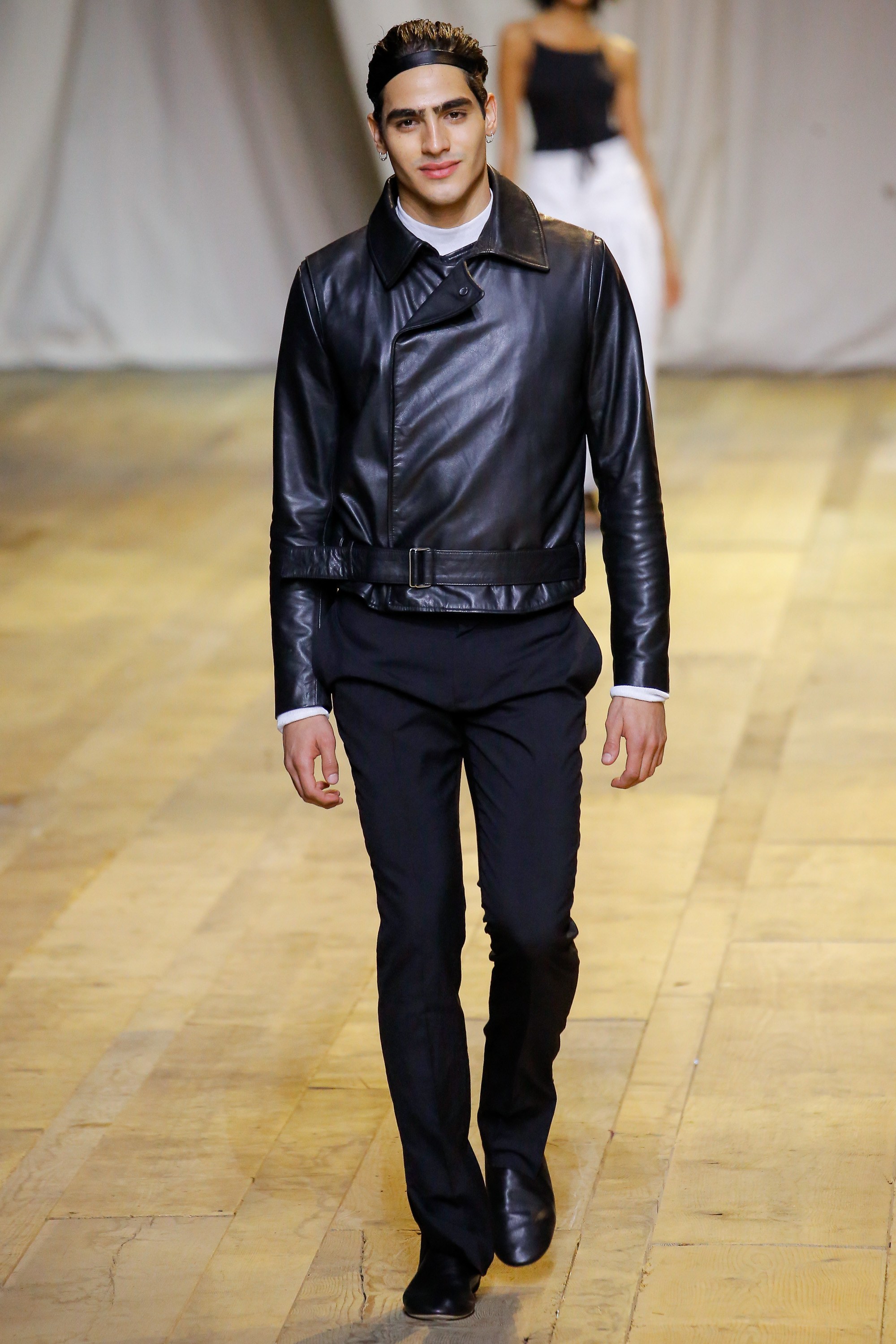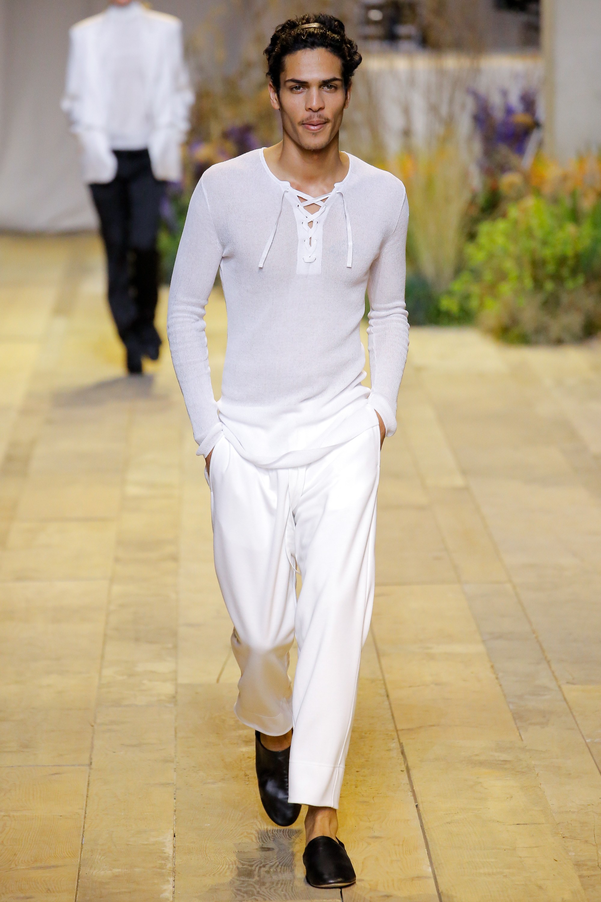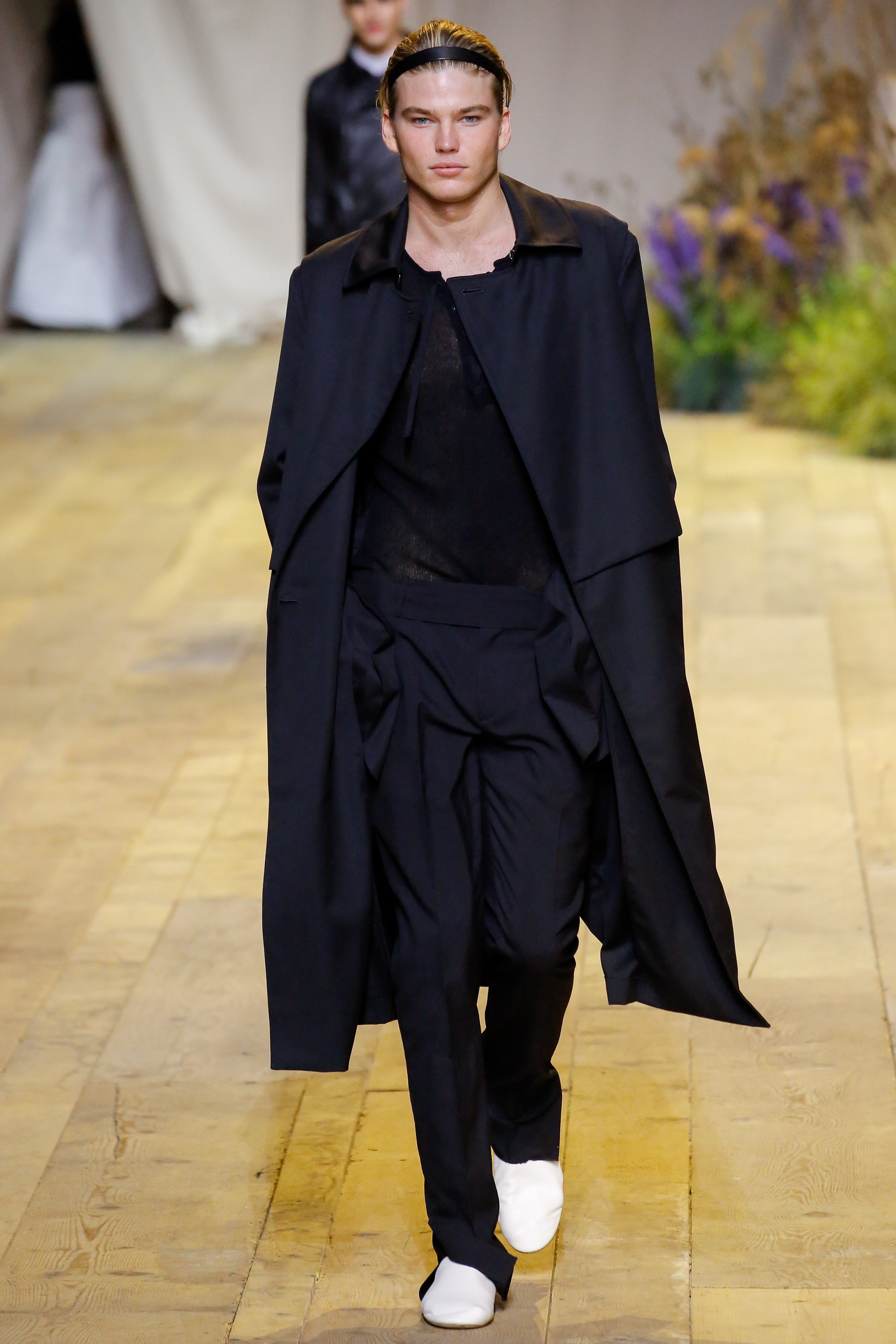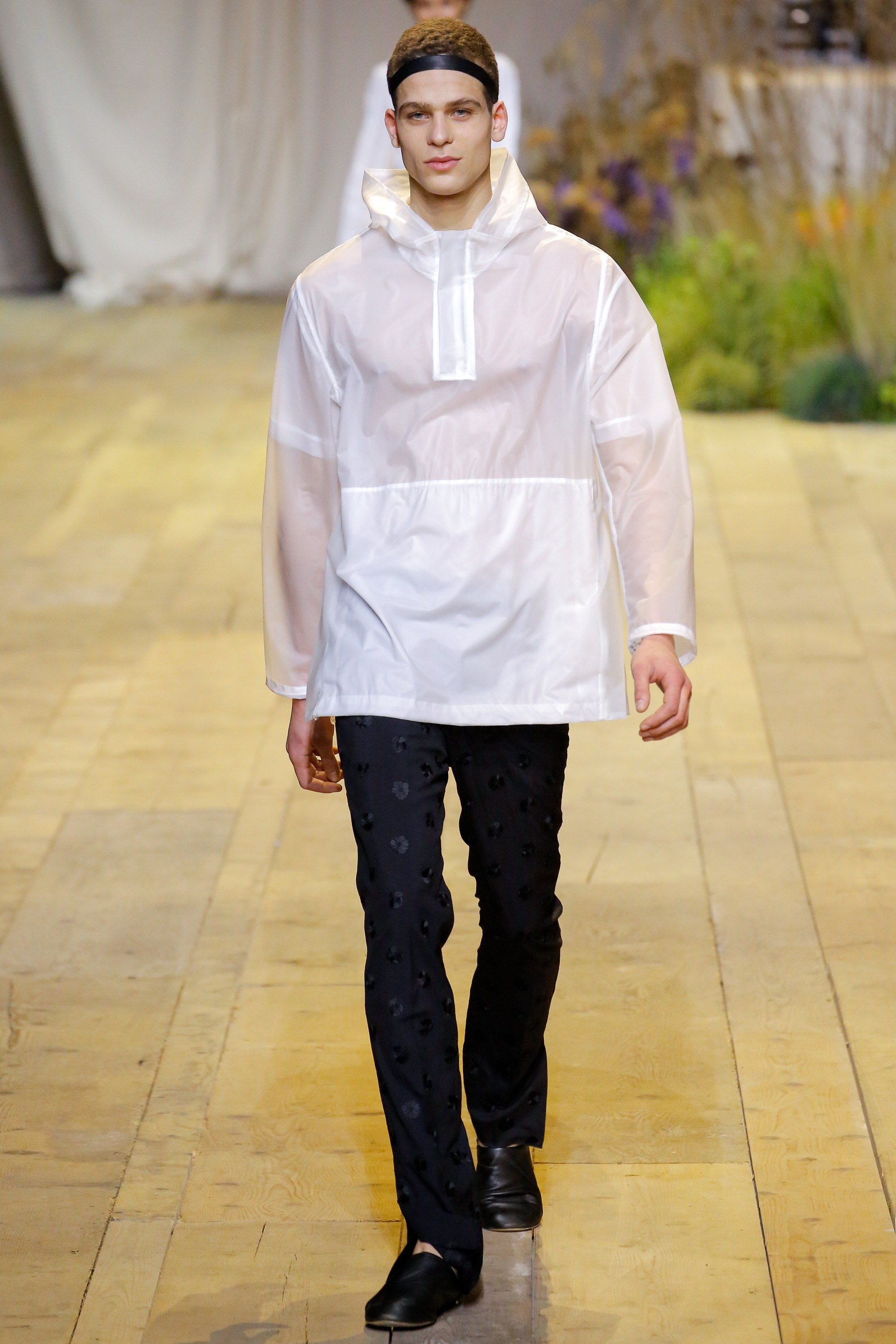 The collections are inspired by contradictions, which is evident when examining what the models were wearing on the runway. For women, there are romantic blouses and shirts with ruffles as well as minimalistic anoraks and dresses in technical materials with plenty of sportswear details. For men, many garments mix formalwear and sportswear; for example, there’s a trench coat with dropped vents made in technical materials, and delicate transparent tops layered with heavier jackets and lace-up knits.