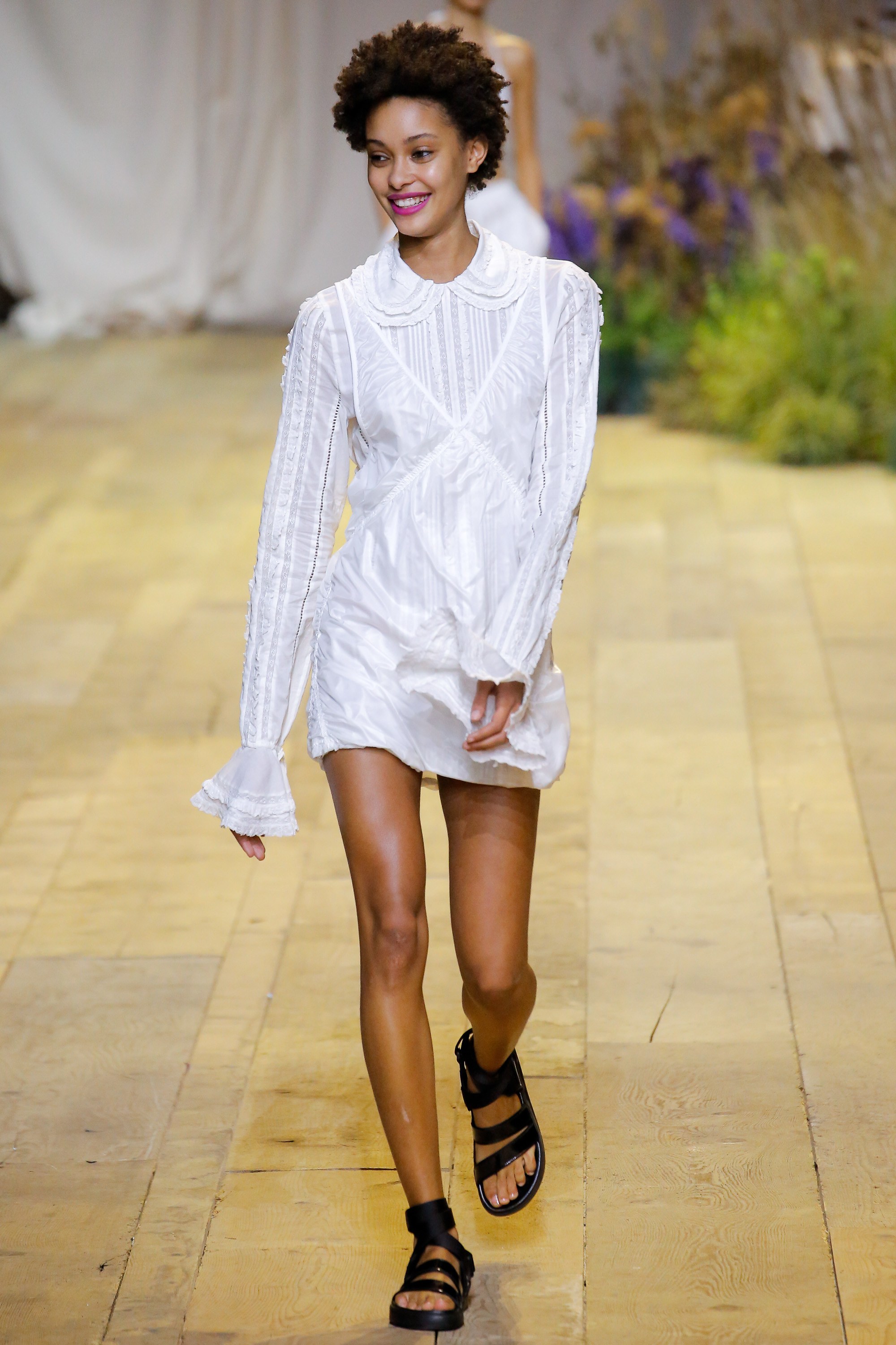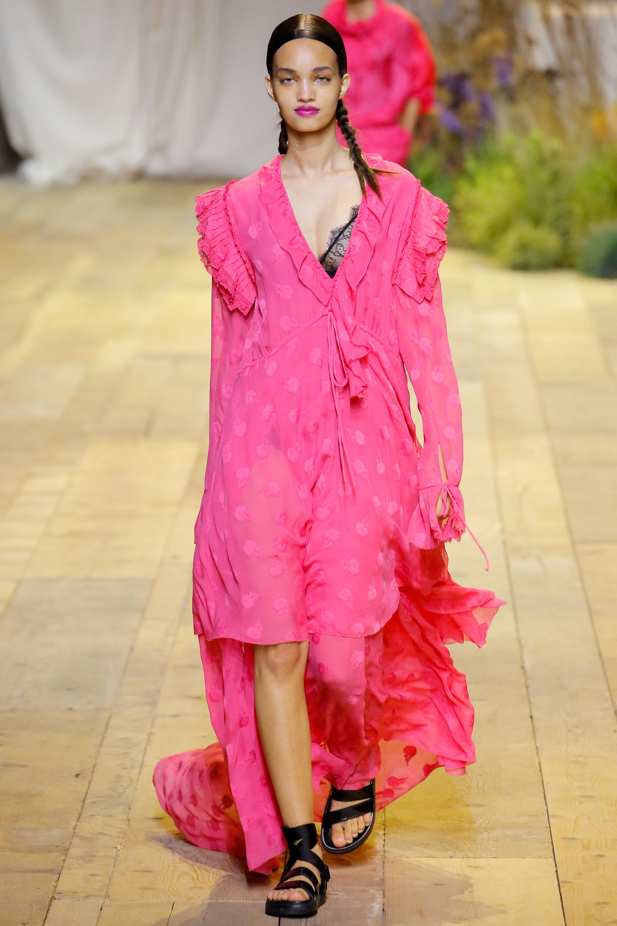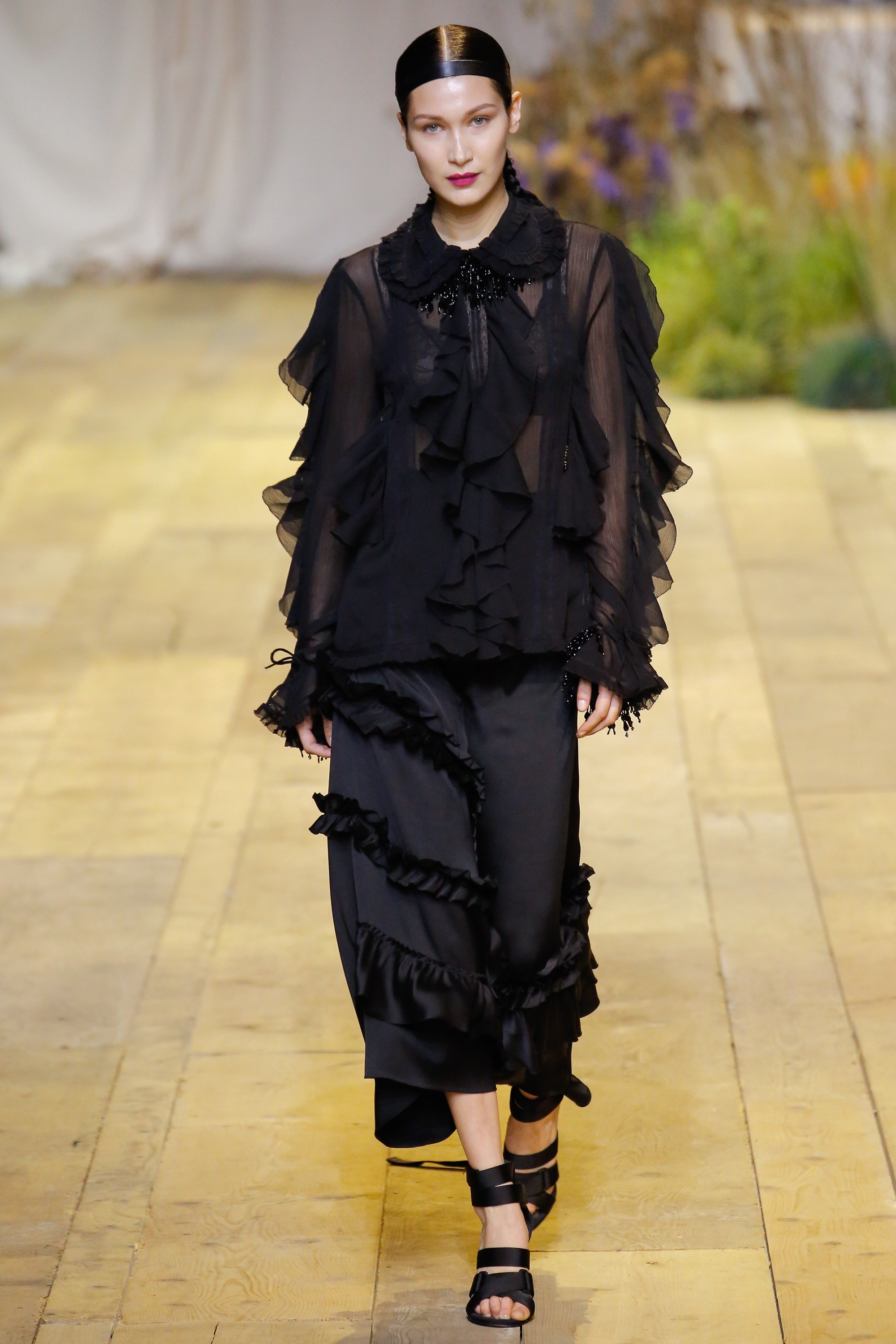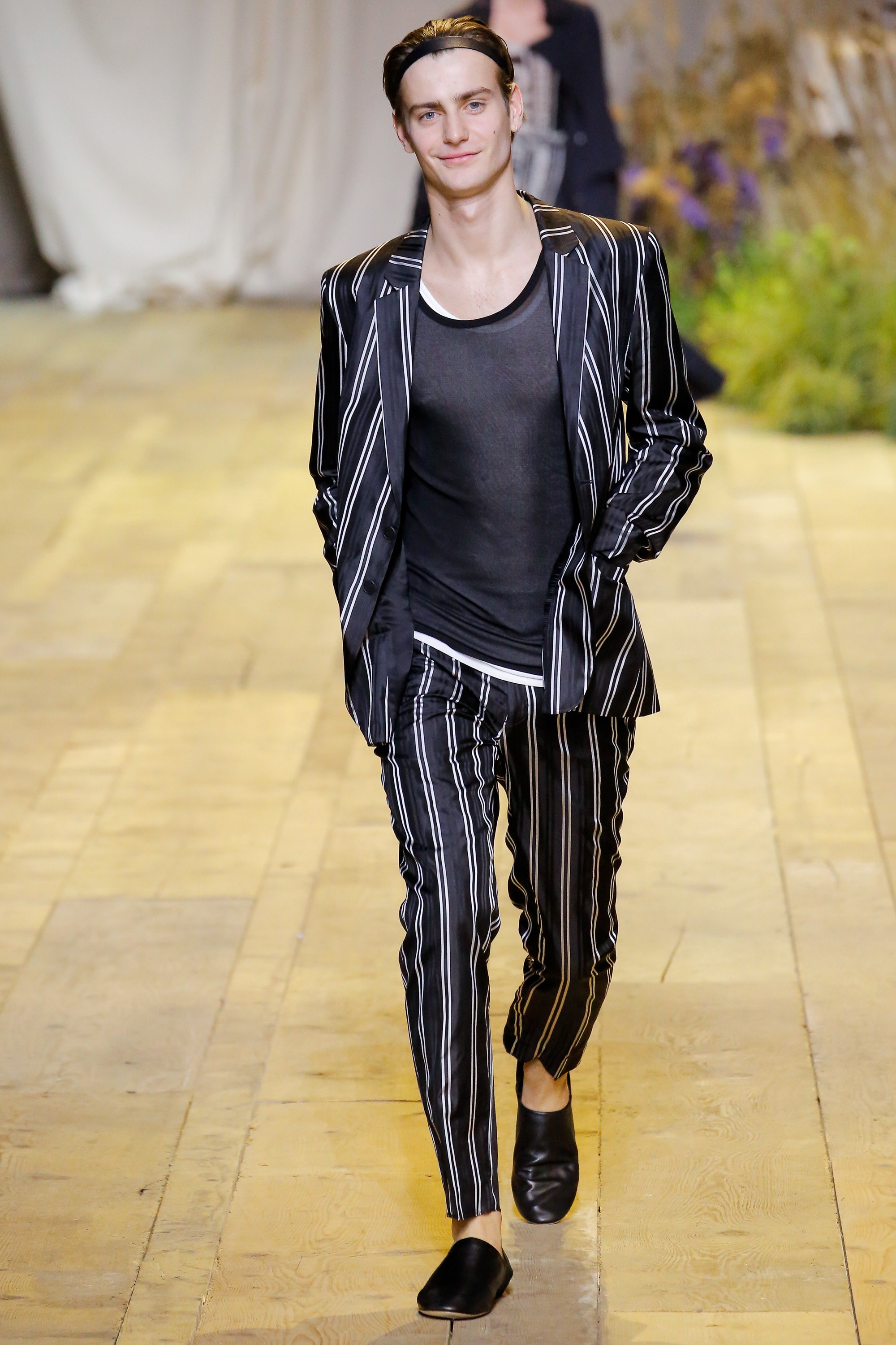 The collections are inspired by contradictions, which is evident when examining what the models were wearing on the runway. For women, there are romantic blouses and shirts with ruffles as well as minimalistic anoraks and dresses in technical materials with plenty of sportswear details. For men, many garments mix formalwear and sportswear; for example, there’s a trench coat with dropped vents made in technical materials, and delicate transparent tops layered with heavier jackets and lace-up knits.