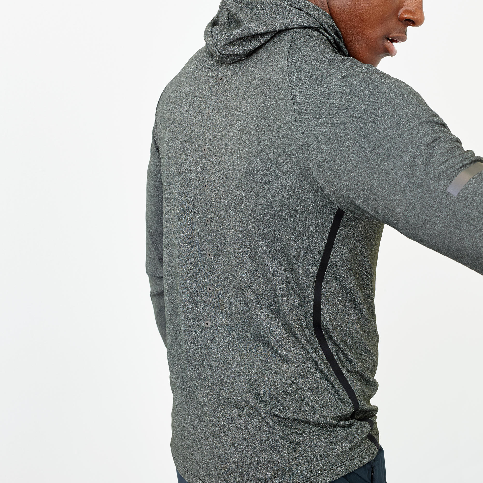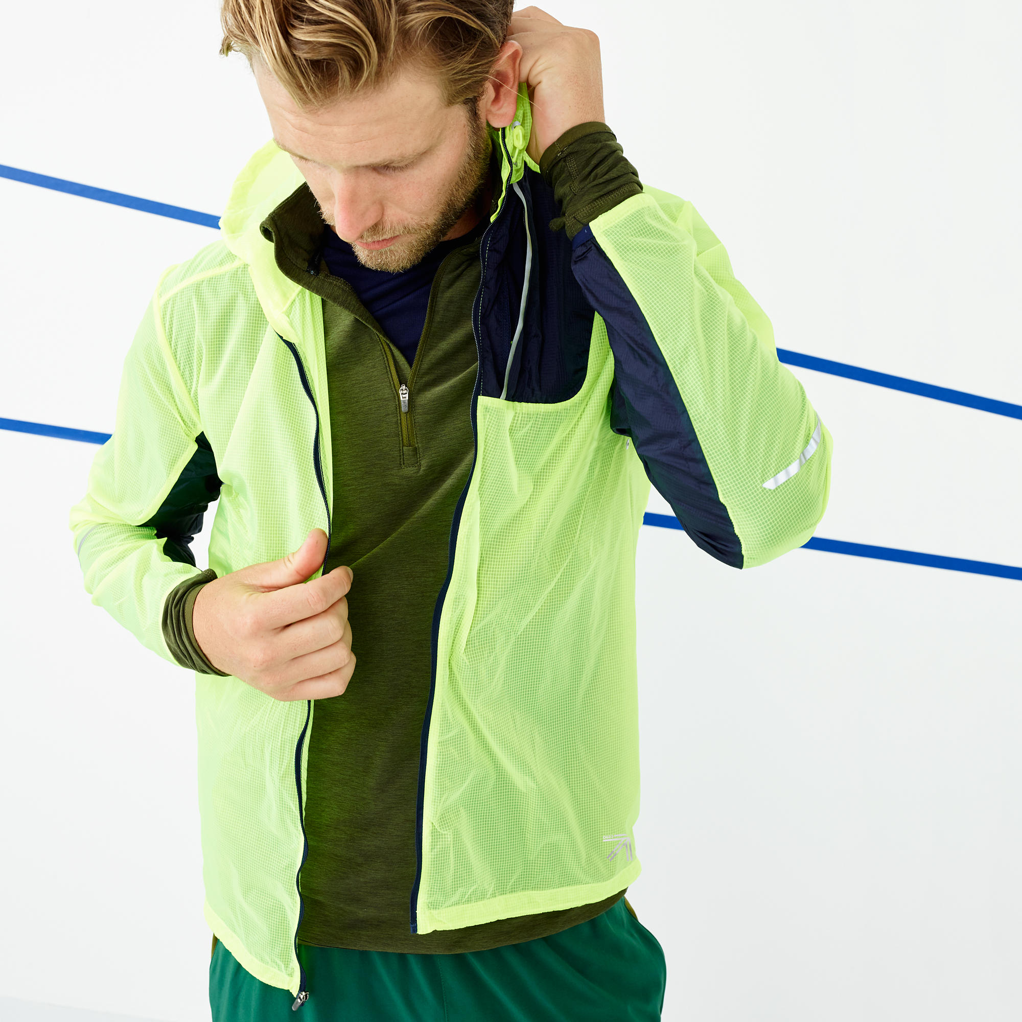 The tech-fabric is semi-transparent so it takes on dark or light shades of the shirt underneath. The hi-lite color is for a runner and it’s ideal for layering. Bonus points for the collab making this hoodie packable into itself.