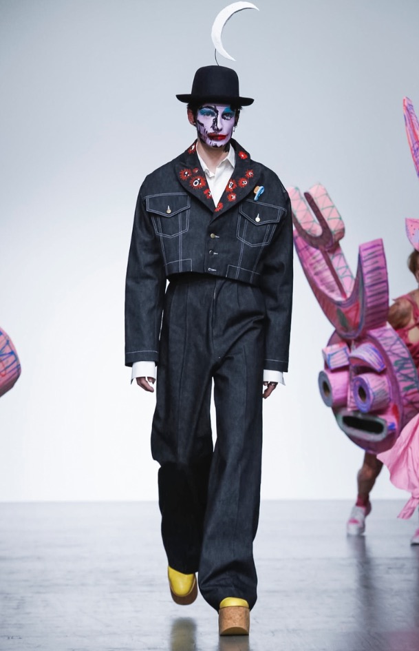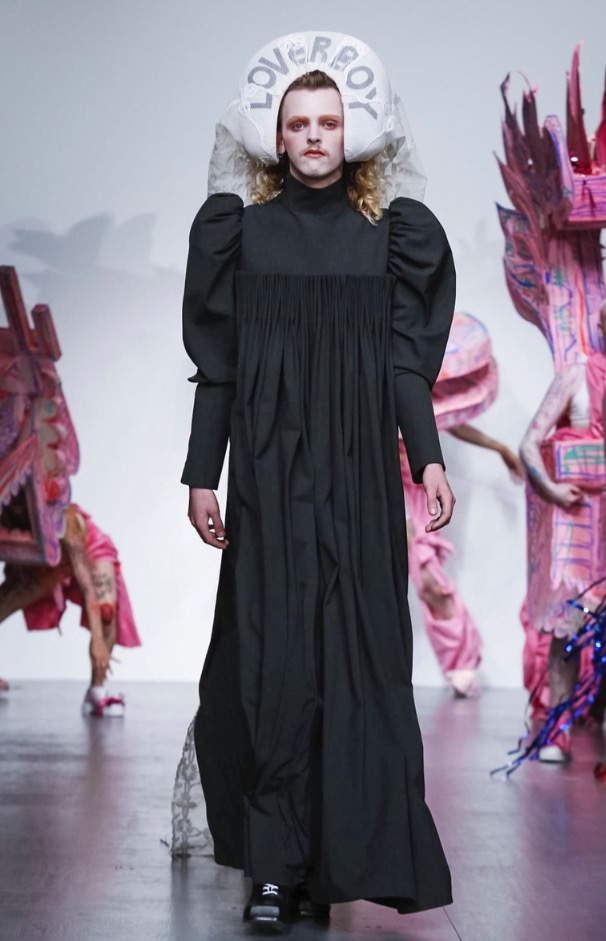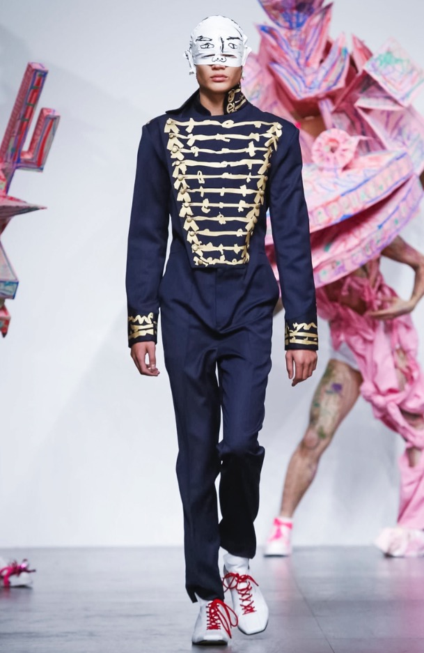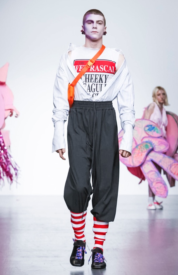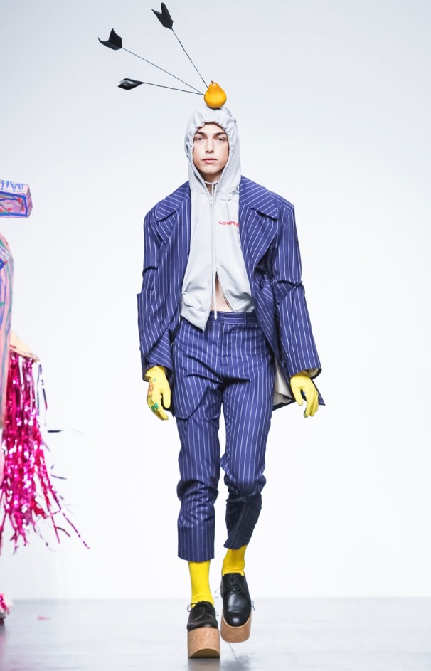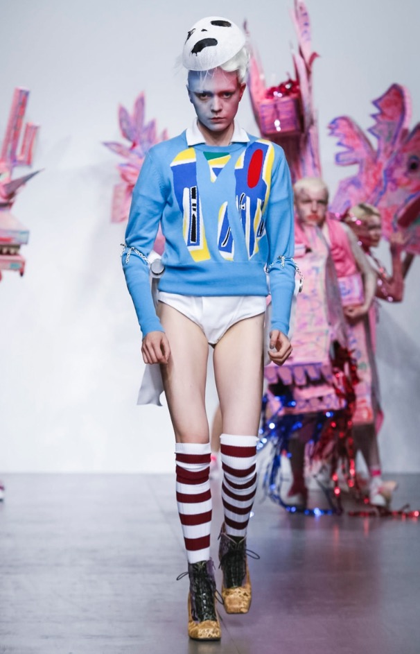 Now LOVERBOY brings his own joy to London Fashion Week: Men’s with a extravaganza theatre cirq-parade. The wonderful world of LOVERBOY is full of fantasy, childhood memories, sissy characters, authority figures, like a stoned “Alice Wonderland”.