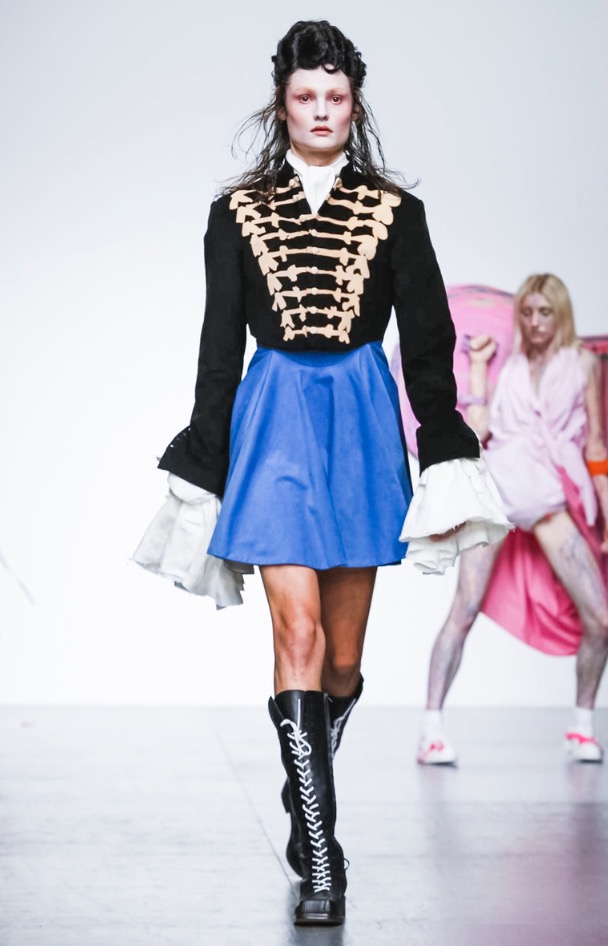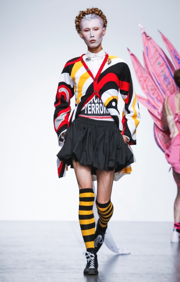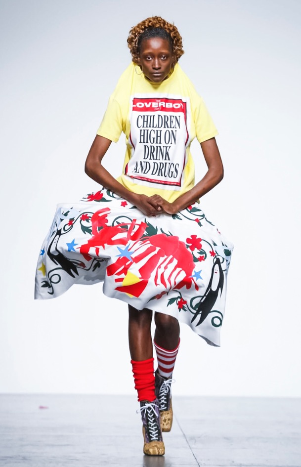 “Children High On Drink And Drugs” quoted a yellow t-shirt with a long skirt with crinoline, you can see paradoxical artsy gowns, like every model has its own story-teller, like artsy painting.