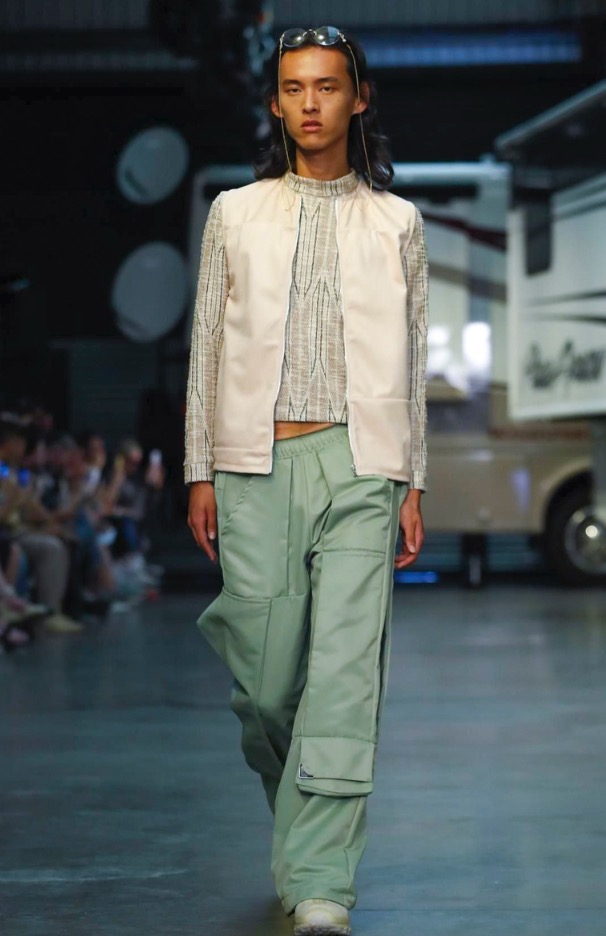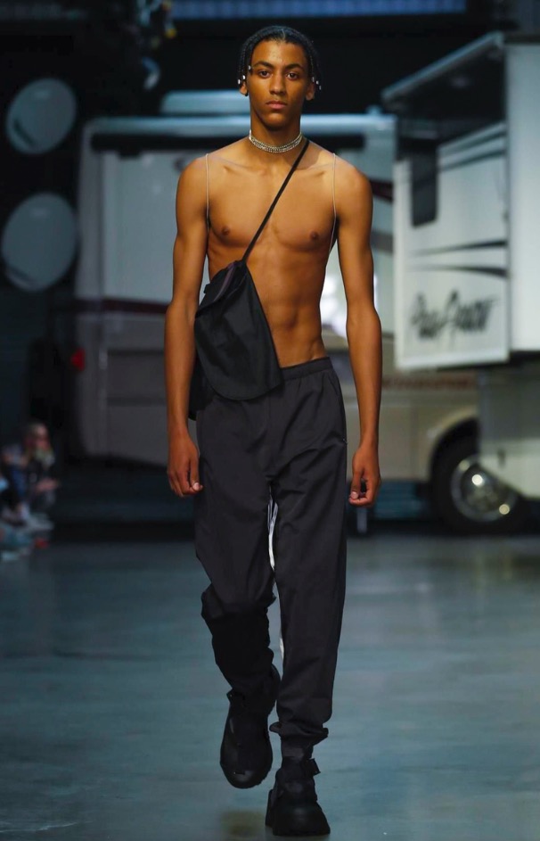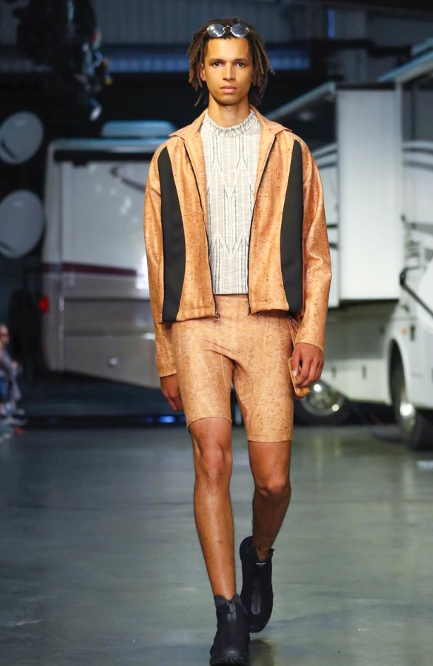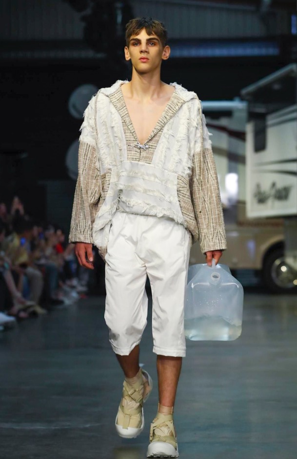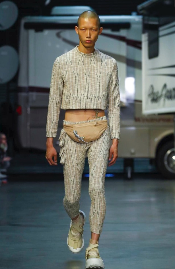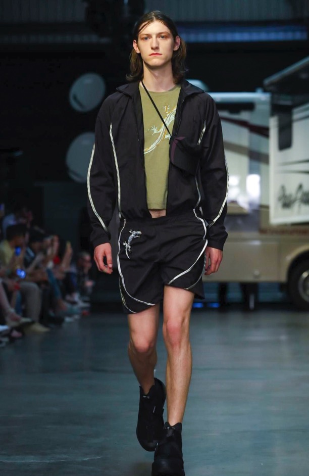 Cottweiler designers Matthew Dainty and Ben Cottrell looked to the optimism and escapism of off-grid desert communities for spring and created a mobile home setting with models strutting around caravans.