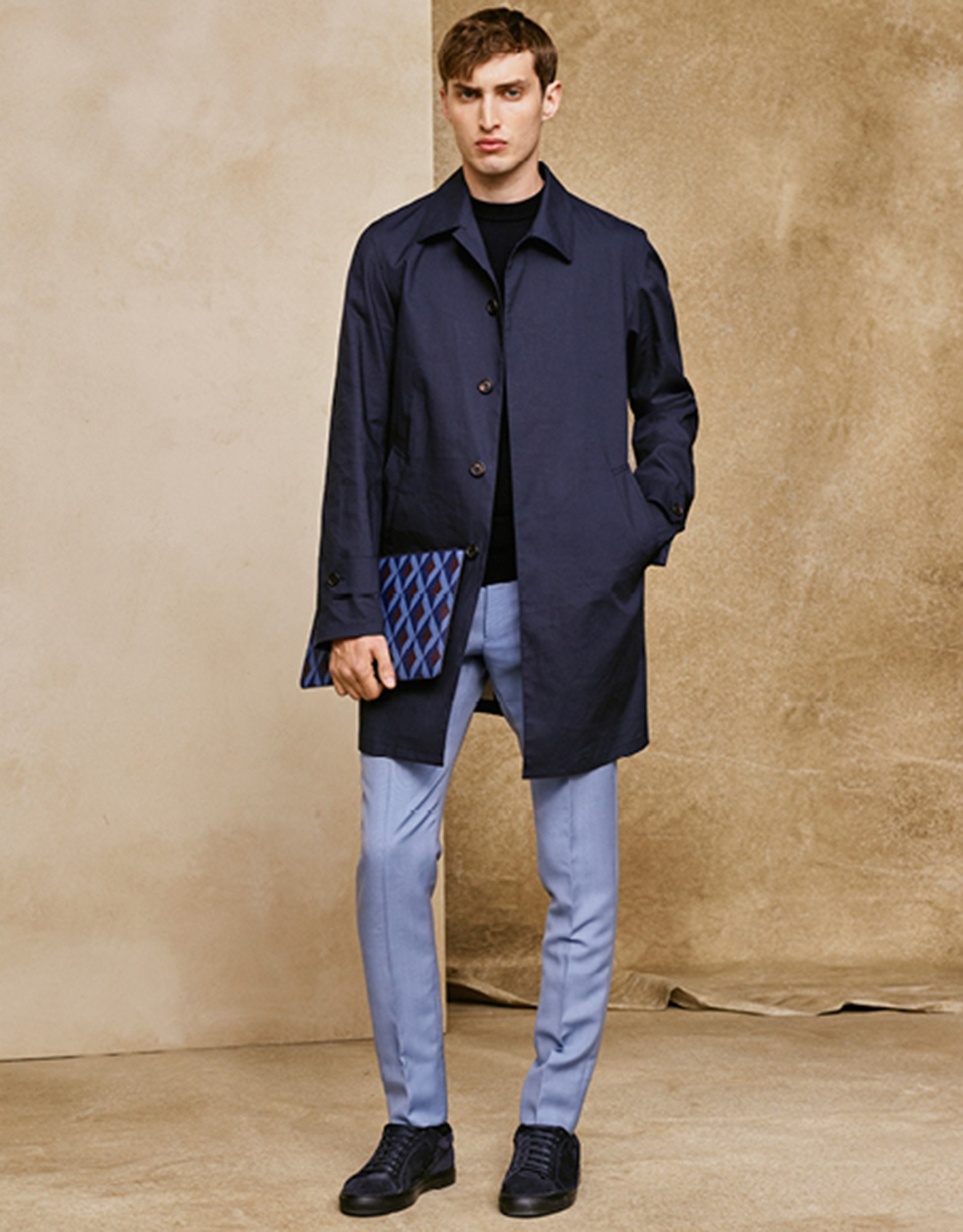Both Weston and Maag separately pointed to one piece in particular as they sketched their Dunhill manifesto: It was a reversible bomber shown with a Fox Brothers boating stripe worn outside, but which could be flipped to a more contemporary khaki synthetic. Weston said, “The trap you can fall into is when you start to become too nostalgic. So here, for me, it’s not about having a club blazer with a crest on it, but something like this, which is more relevant.” New sneakers, a new mid-narrow jean, and a new casual deportment in the unfussy styling added to the sense of a Dunhill more—at least, apparently—at ease. Strong and stable stuff.