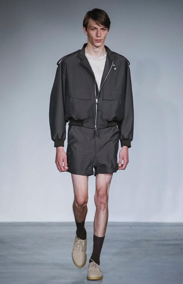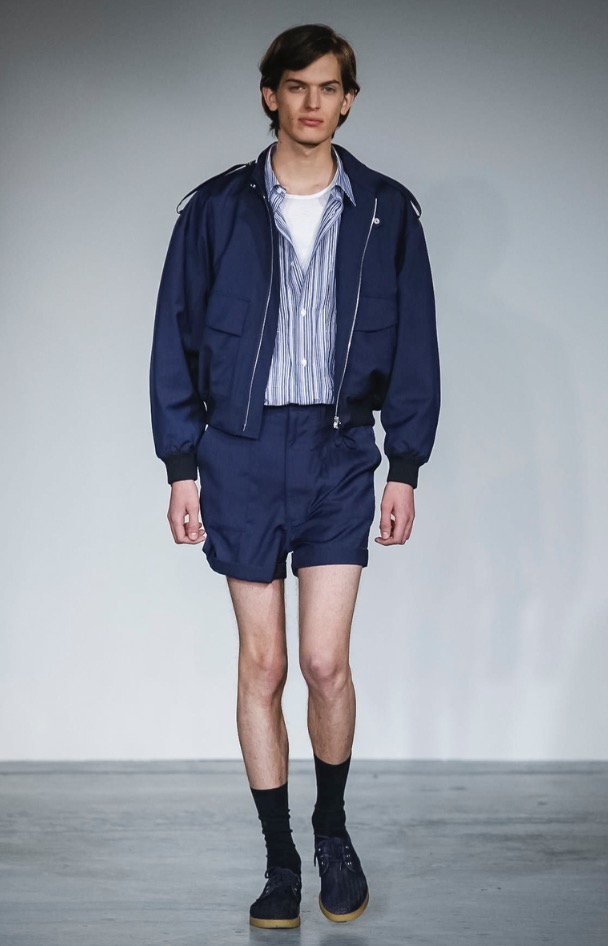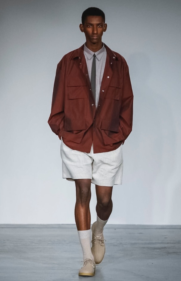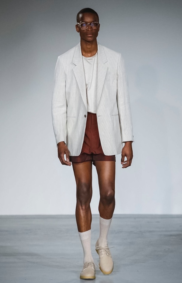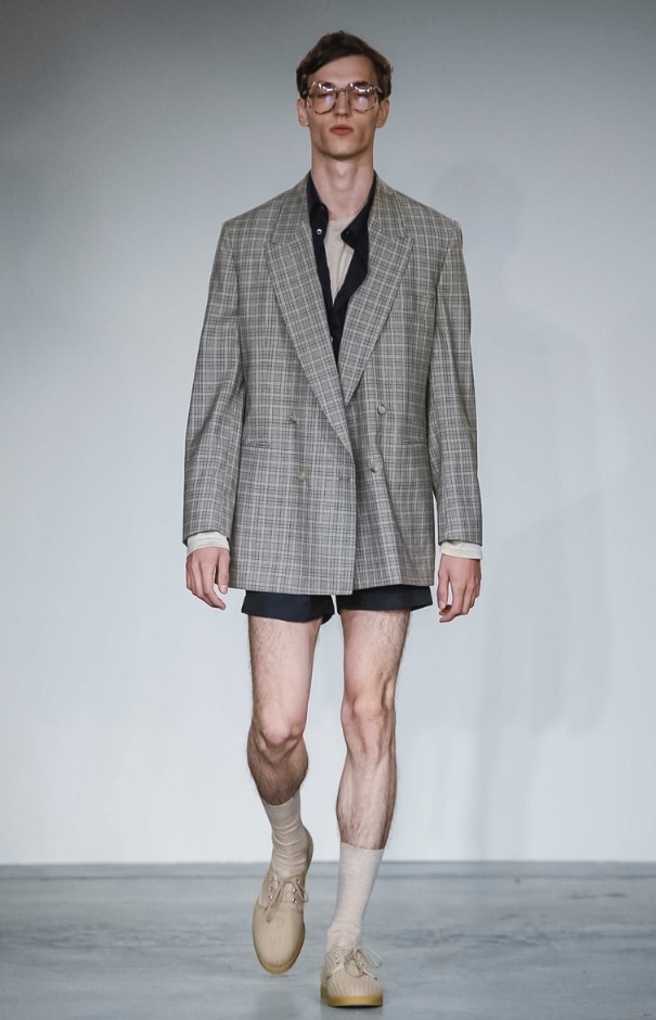Silhouettes ran from the sporty to the sartorial, but all had a sense of refinement. A navy suit jacket had gently sloping shoulders and was paired with loosely tailored pants, while a field jacket in a slightly iridescent oxblood color was teamed with loose linen shorts – and a shirt and skinny tie. Grant noted that he’d wanted to work with some retro fabrics “that I remembered my dad having shirts in,” such as muslin and cheesecloth. These textures, along with fabrics such as bouclé wool and linen, brought a relaxed appeal to Grant’s signature tailoring.