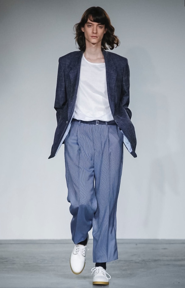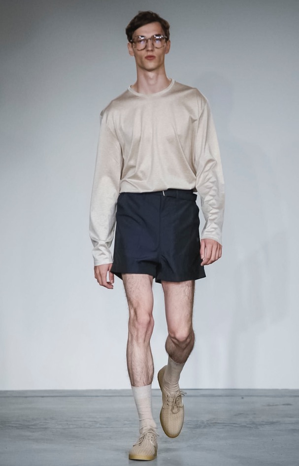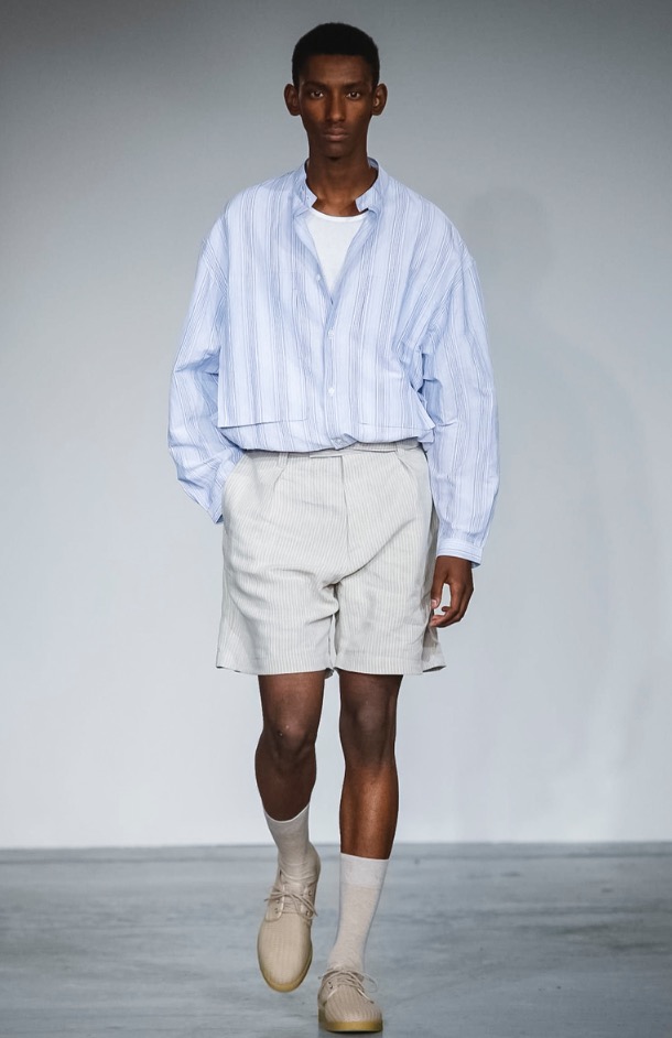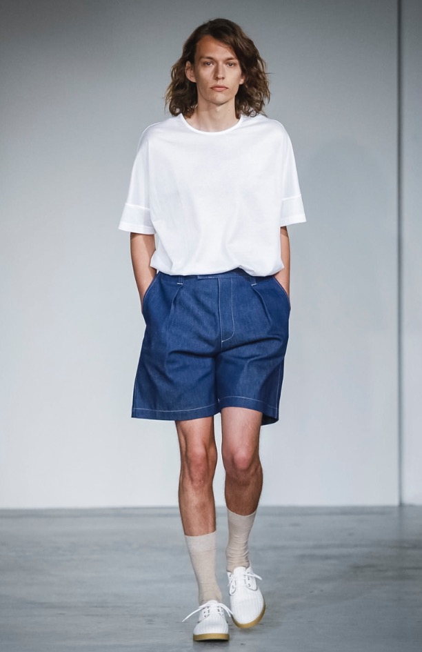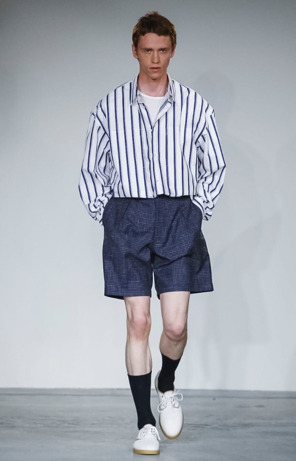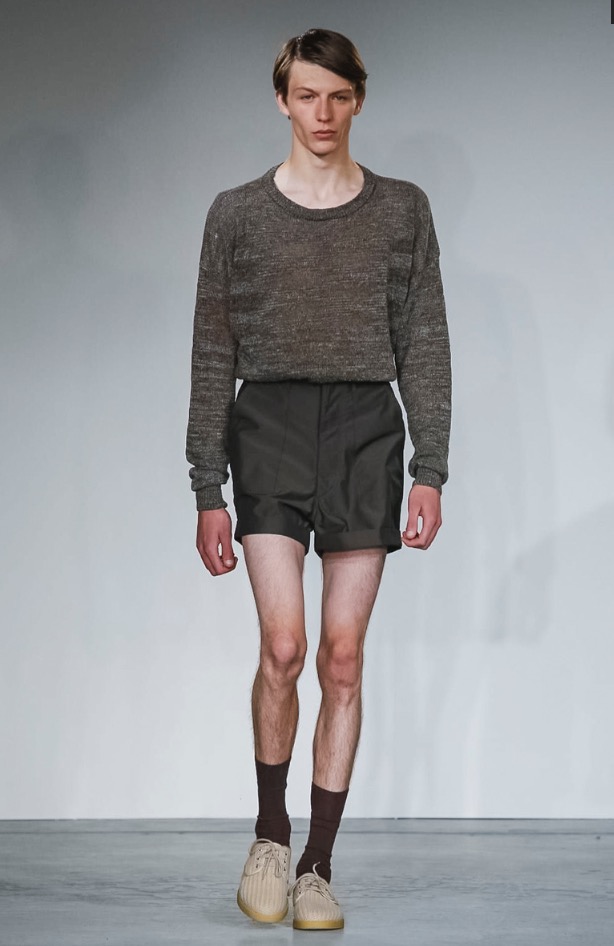 Silhouettes ran from the sporty to the sartorial, but all had a sense of refinement. A navy suit jacket had gently sloping shoulders and was paired with loosely tailored pants, while a field jacket in a slightly iridescent oxblood color was teamed with loose linen shorts – and a shirt and skinny tie. Grant noted that he’d wanted to work with some retro fabrics “that I remembered my dad having shirts in,” such as muslin and cheesecloth. These textures, along with fabrics such as bouclé wool and linen, brought a relaxed appeal to Grant’s signature tailoring.
