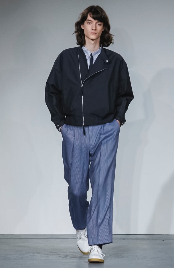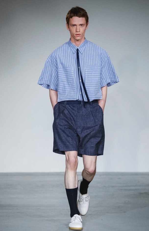 Silhouettes ran from the sporty to the sartorial, but all had a sense of refinement. A navy suit jacket had gently sloping shoulders and was paired with loosely tailored pants, while a field jacket in a slightly iridescent oxblood color was teamed with loose linen shorts – and a shirt and skinny tie. Grant noted that he’d wanted to work with some retro fabrics “that I remembered my dad having shirts in,” such as muslin and cheesecloth. These textures, along with fabrics such as bouclé wool and linen, brought a relaxed appeal to Grant’s signature tailoring.