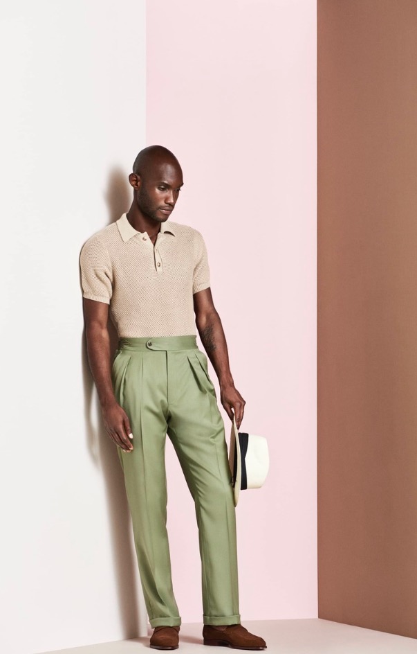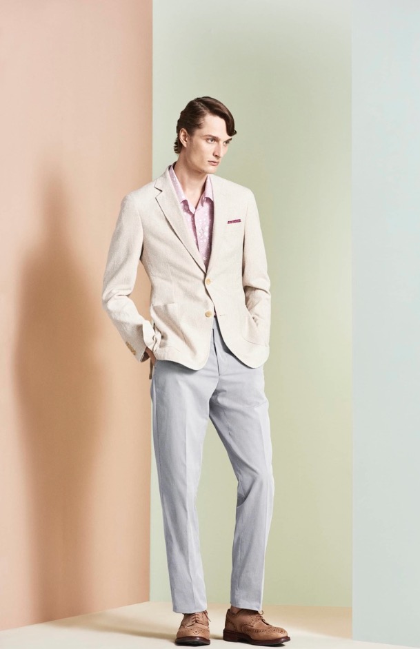 Exquisite wool and silk and linen blends give clean lines and lightness to double-breasted tailoring. Fine ribbed cotton Ottoman and featherweight wool gabardine add finesse and a sublime softness. Cotton boucle jackets lend a real depth of texture.