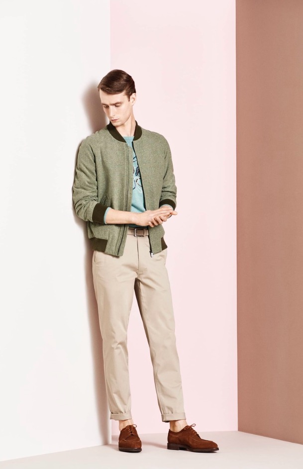 Raglan shoulder zip-front bombers and blousons and nuanced cotton and linen knits give a recognizably 50s feel. Prints impart perspective.