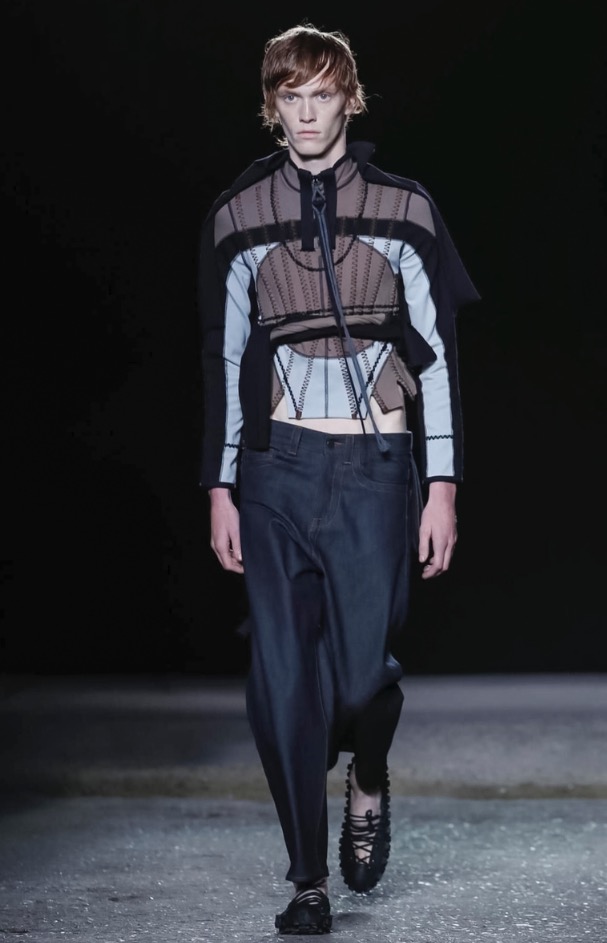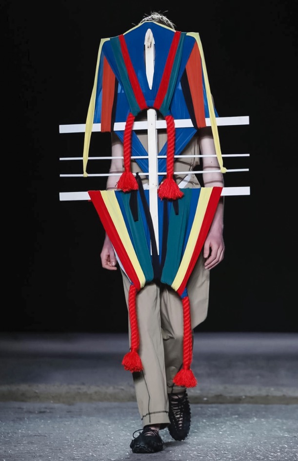 Green will forever be known as the avant-garde finalist of the LVMH Prize. But he is also a great conceptualist. Which is why he opened his show with wooden-frame kites hung vertically in front of the models’ torsos; so large they covered their faces. The designer called them: “walking altarpieces.”
