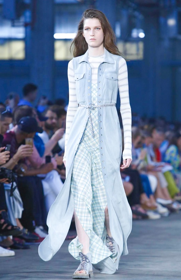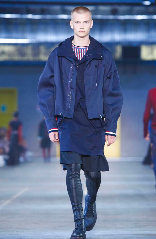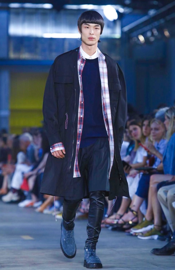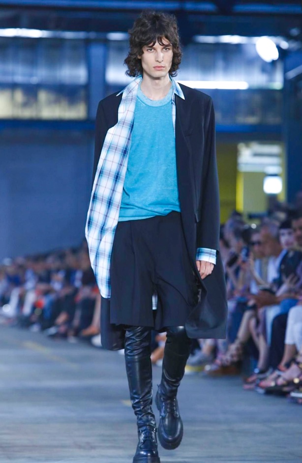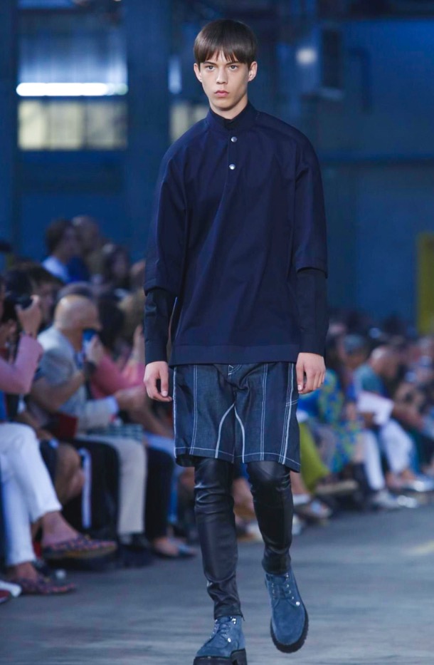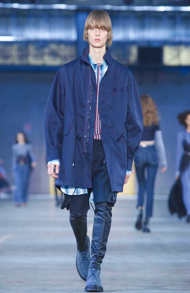I once asked Andreas Melbostad, the designer behind both collections, what his boy and girl were to each other. Sister and brother? Boyfriend and girlfriend? No, says Andreas, just very good friends. Which, when you think about it, means that combining them fits. They aren’t the same person, but they are in the same wheelhouse. They are inspired by the same things. And here, could be wrong, but I want to say there was a bit of a play off between of city and country. Melbostad’s talked about that before because it’s his own split – he lives in New York but spends much of his year’s at the Diesel HQ far away in the Italian countryside. It came through for the girls in the plaid shirt dresses and almost homespun knits, with revealed stitches, clashed here with tech-y track pants and chunky platform boots. For the boys, a plaid shirt and t-shirt sat under a clean-lined lapel-less blazer, or studded leather jacket. On that train of thought -I suppose this was really about layering. Diesel Black Gold is always known for it’s utilitarian bent, and there’s something about layering that’s useful. You can strip it off, or pile it on. And here, it also allowed for this opposition between a lean and full silhouette – clinging leggings, some in leather, at sat under boxy shorts, tight striped tops were worn under chunky anoraks. And for girls – slim-strapped parachute dresses were worn over joggers and long-sleeved tees. It all gives off this feel that these are girls and boys who don’t spend their life thinking about how best to combine the pieces they have lying on their floor. They are girls and boys who just are.