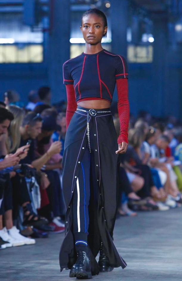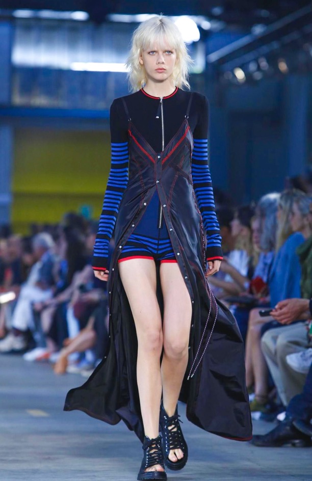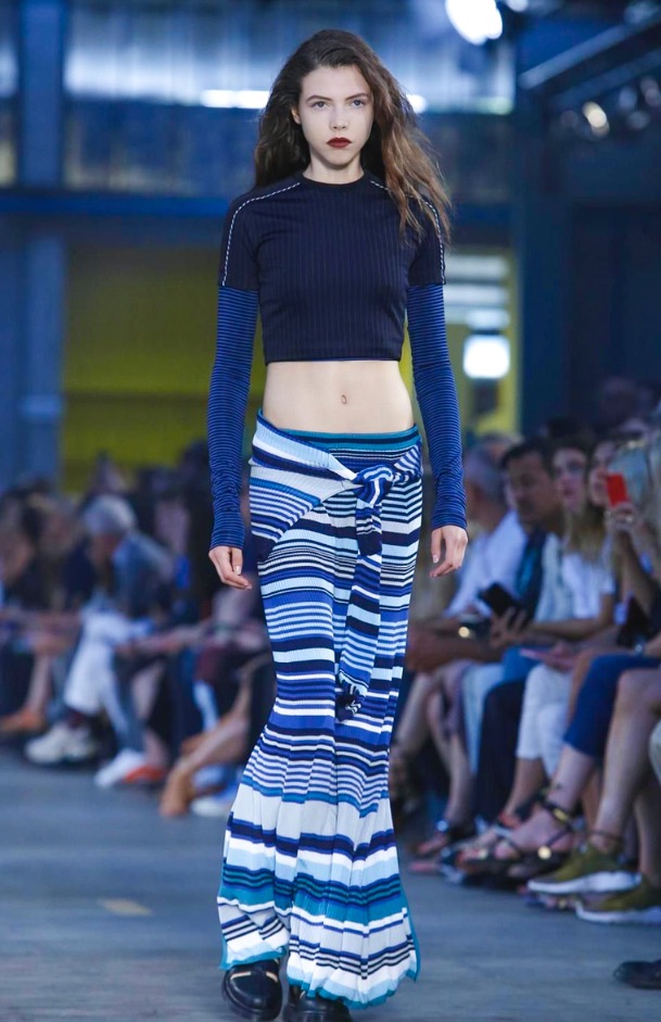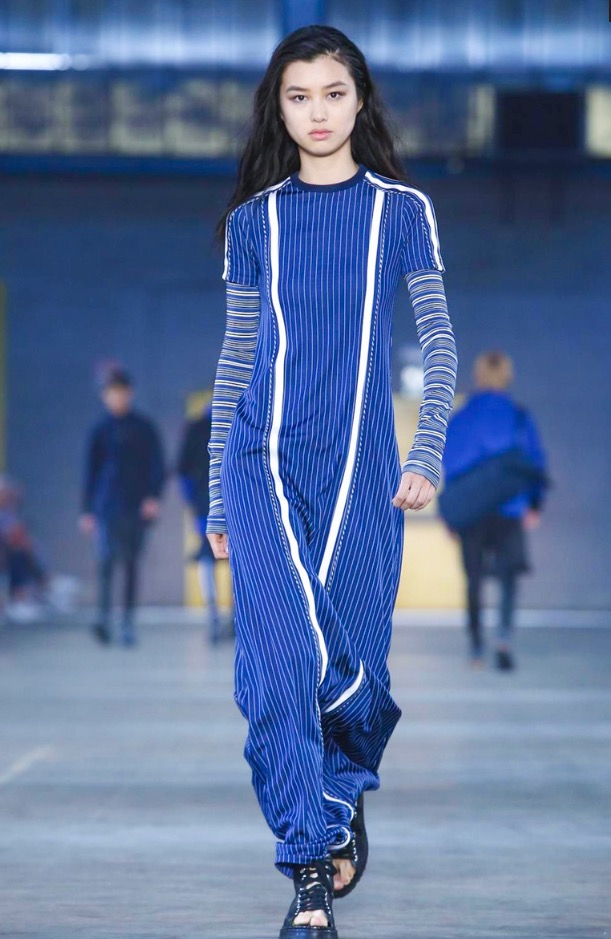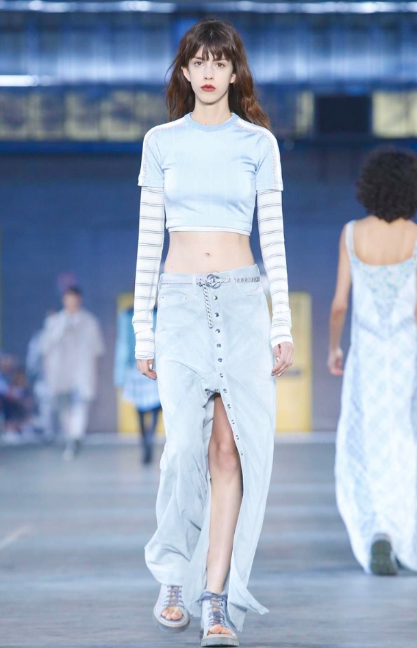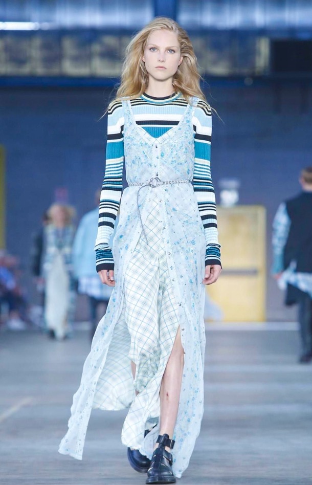 I once asked Andreas Melbostad, the designer behind both collections, what his boy and girl were to each other. Sister and brother? Boyfriend and girlfriend? No, says Andreas, just very good friends. Which, when you think about it, means that combining them fits. They aren’t the same person, but they are in the same wheelhouse. They are inspired by the same things. And here, could be wrong, but I want to say there was a bit of a play off between of city and country. Melbostad’s talked about that before because it’s his own split – he lives in New York but spends much of his year’s at the Diesel HQ far away in the Italian countryside. It came through for the girls in the plaid shirt dresses and almost homespun knits, with revealed stitches, clashed here with tech-y track pants and chunky platform boots. For the boys, a plaid shirt and t-shirt sat under a clean-lined lapel-less blazer, or studded leather jacket. On that train of thought -I suppose this was really about layering. Diesel Black Gold is always known for it’s utilitarian bent, and there’s something about layering that’s useful. You can strip it off, or pile it on. And here, it also allowed for this opposition between a lean and full silhouette – clinging leggings, some in leather, at sat under boxy shorts, tight striped tops were worn under chunky anoraks. And for girls – slim-strapped parachute dresses were worn over joggers and long-sleeved tees. It all gives off this feel that these are girls and boys who don’t spend their life thinking about how best to combine the pieces they have lying on their floor. They are girls and boys who just are.