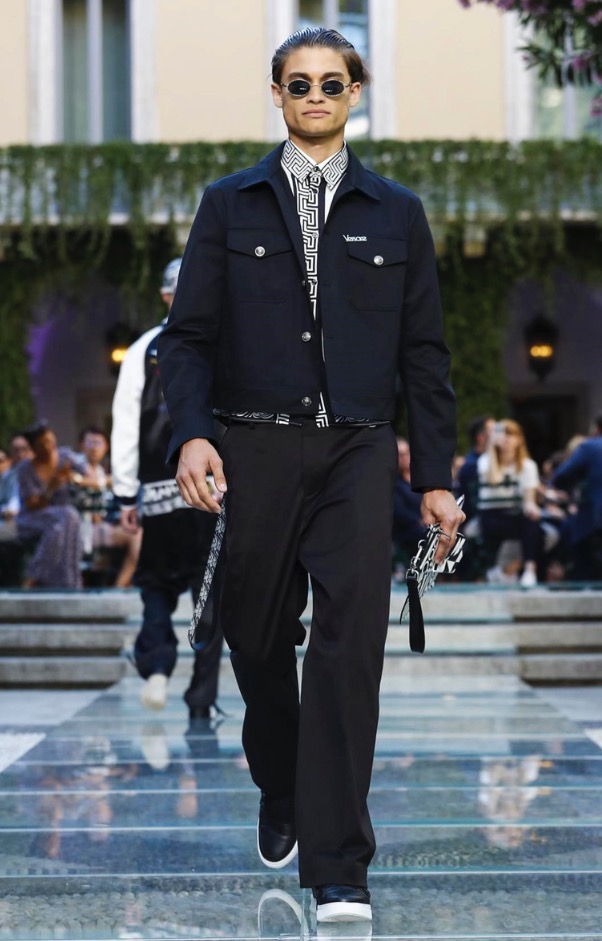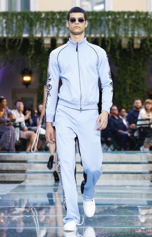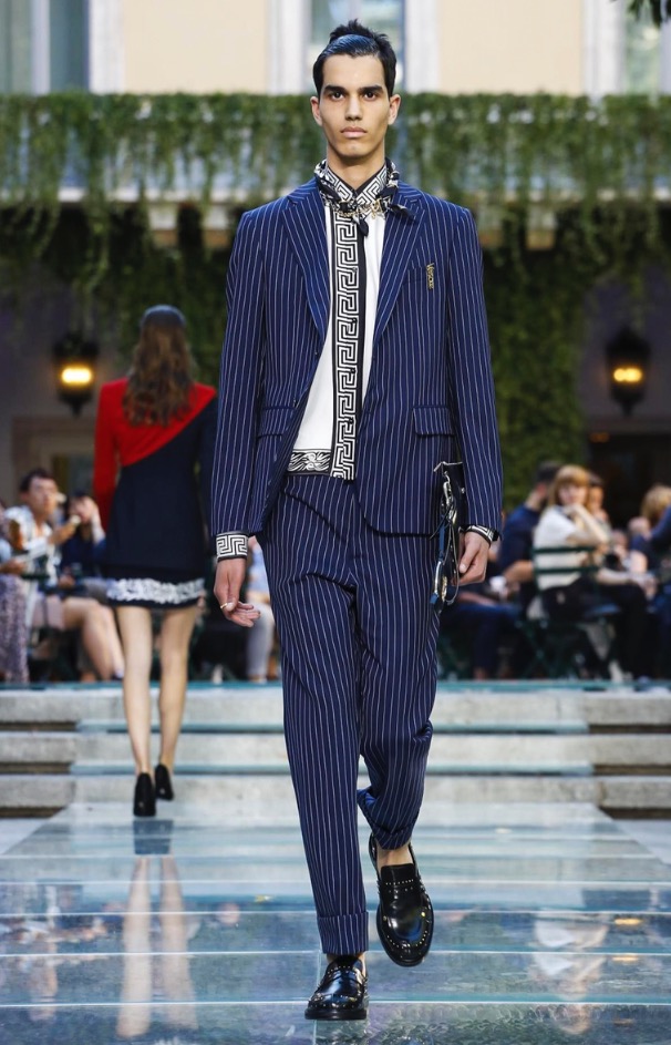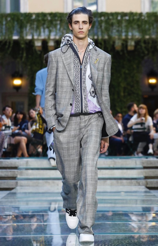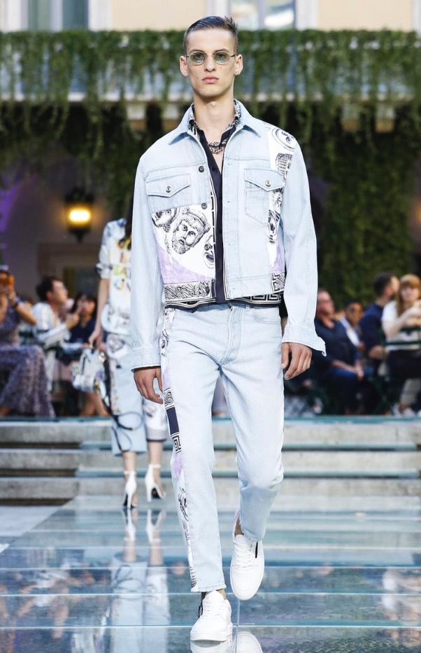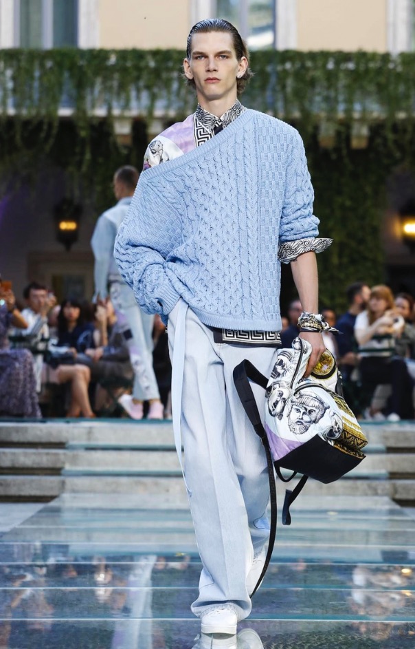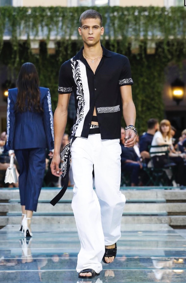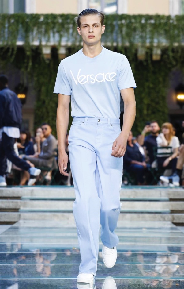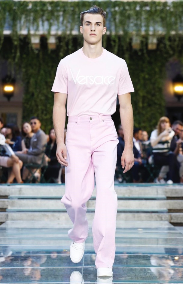 Donatella favorite look in years is worn by Zach Cox, the classic #Versace logo looks totally new, embroidered in white stitches on a pale pink T-shirt. And also in pale blue.